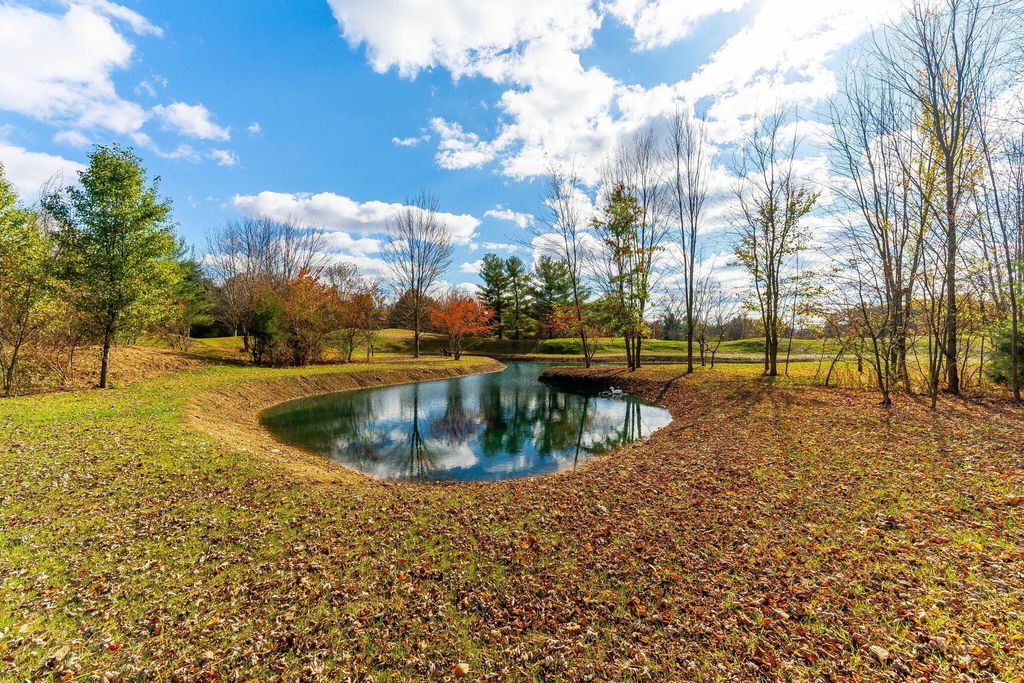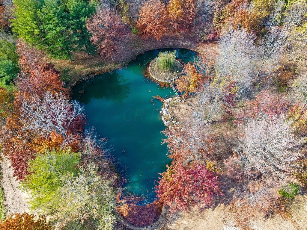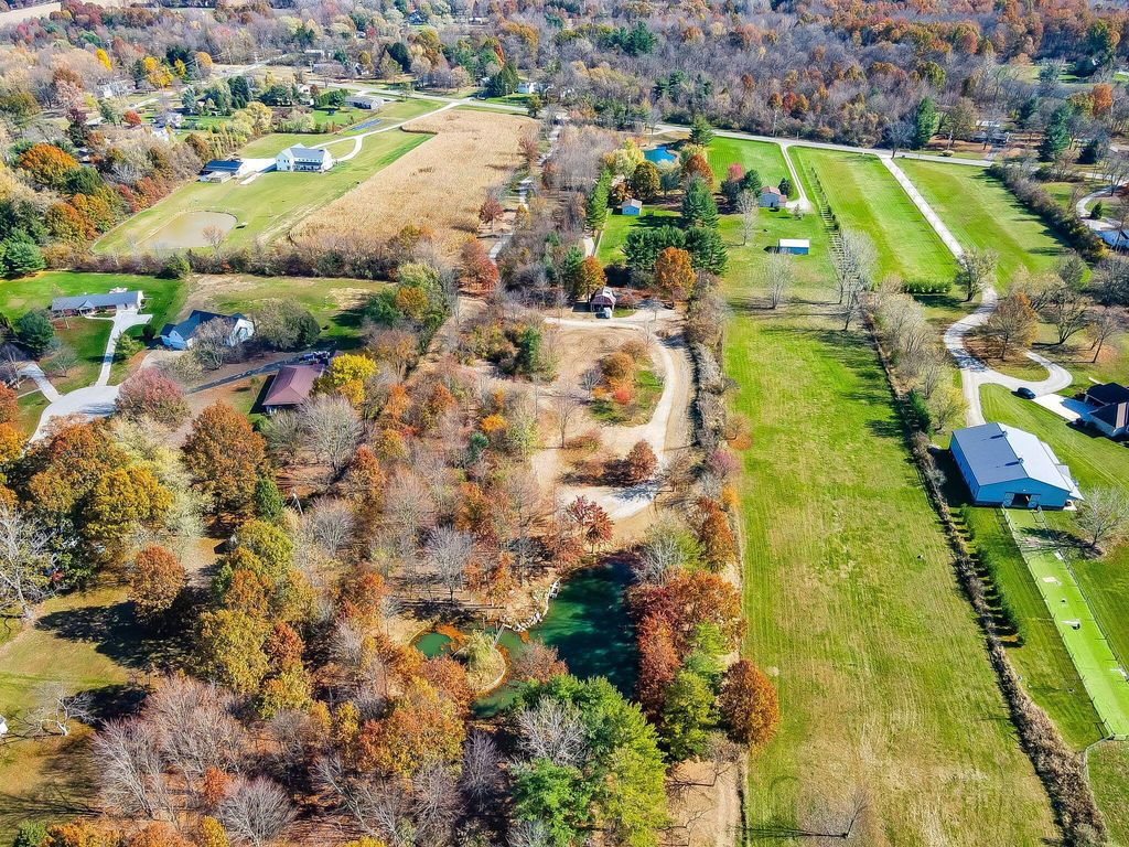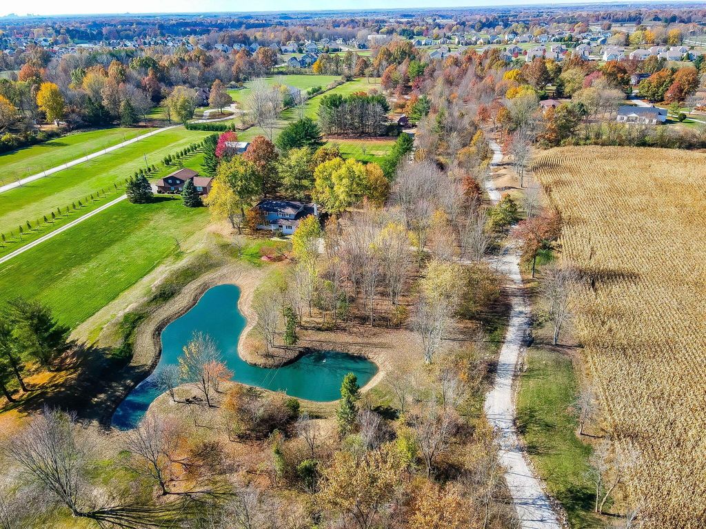 $100,000 Price Reduction! Motivated Seller. 12.218 acres in the City of New Albany offers a beautiful, serene, private setting with landscape berms, 2 ponds, a horseshoe drive, a mostly wooded lot, many mature trees, walking trails & a stream at the rear of the property. Nestled on the site is a 2 story, 4 bedroom, 2.5 bath home with 2,302 SF above grade with living, dining & family rooms, 4 season sunroom, eat-in kitchen, recreation/additional bedroom in the basement & attached 2 car garage and a 1.25-acre wood fenced rear lawn area off the rear of the house with a detached 720 SF (24'x30') outbuilding currently used as a small studio/game room with workshop/storage. Additionally, there is a separate 768 SF (24'x32') wood barn with loft. The lot is 343' x 1732' and backs up to New Albany Links golf course.