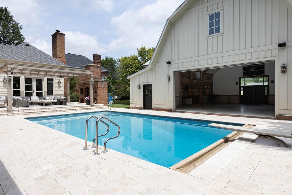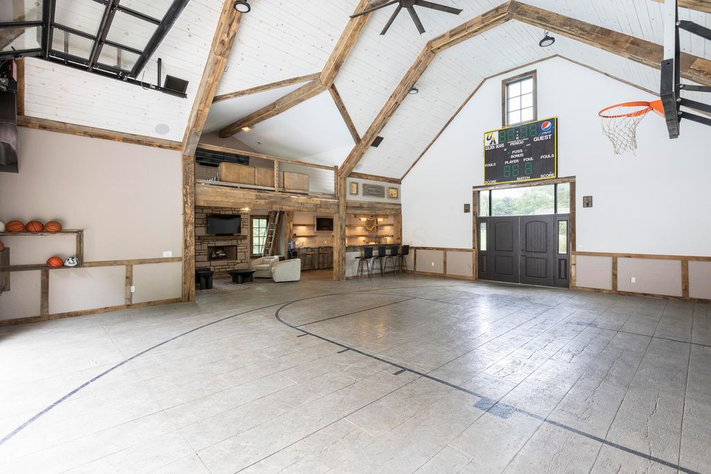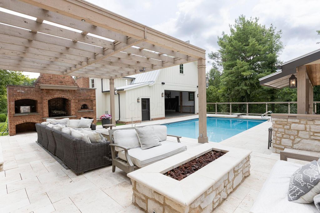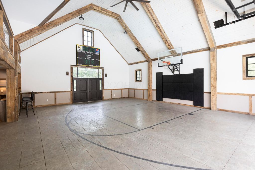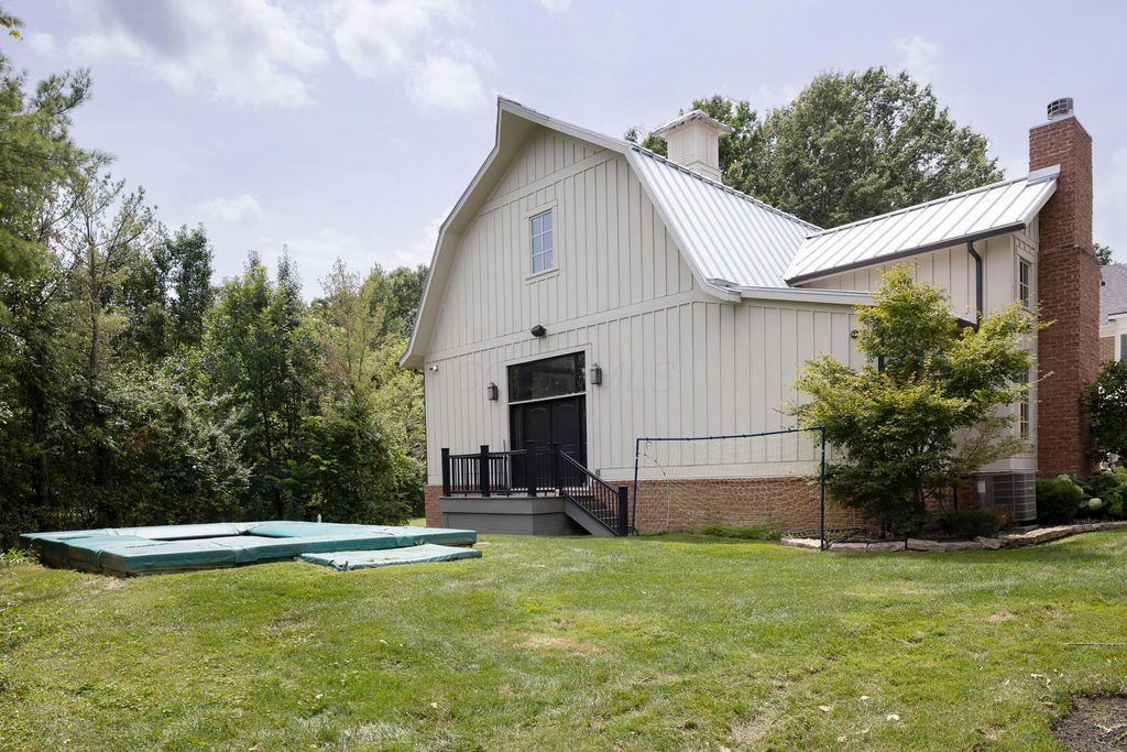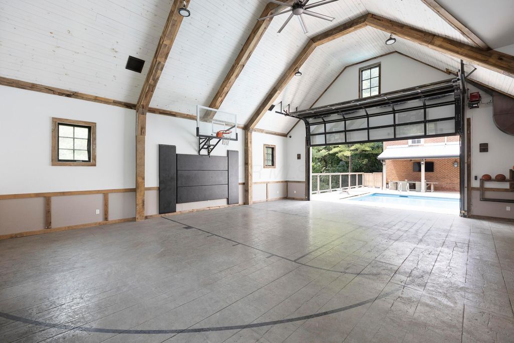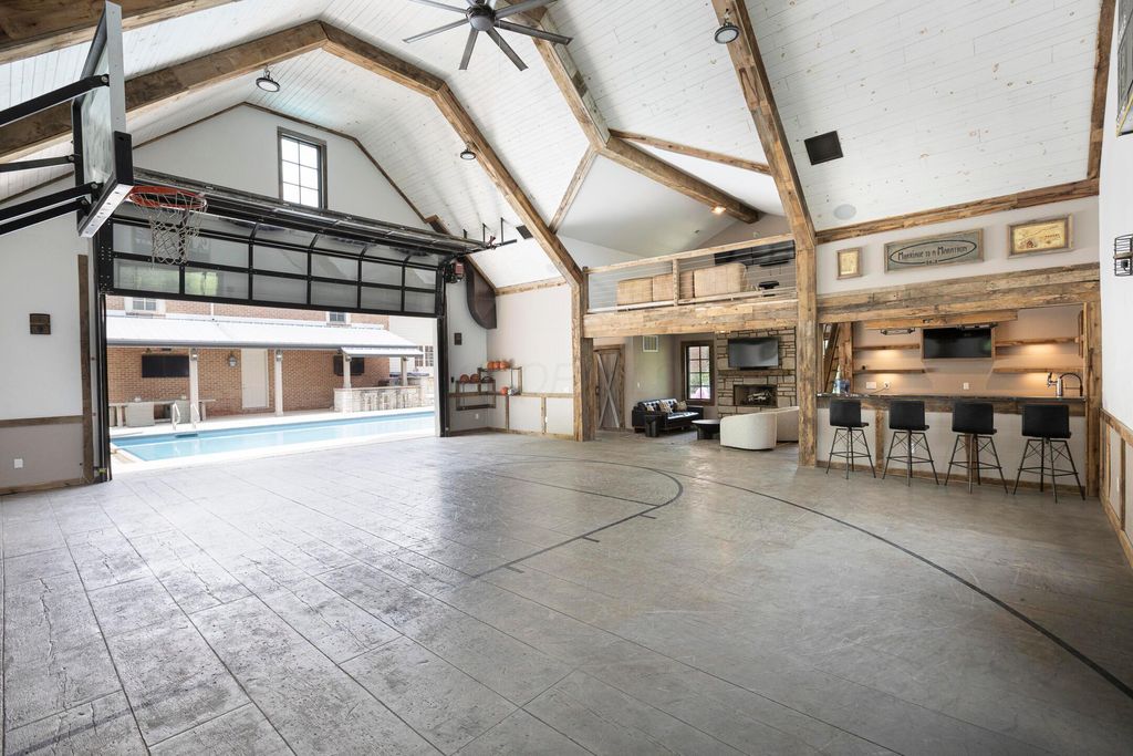 Situated on a private, wooded lot in one of New Albany Country Club's most exclusive enclaves, this one-of-a-kind property offers a rare opportunity to enjoy both the elegance of country club living and the fun of a private retreat"”right in the heart of New Albany. Plenty of living space throughout including a newly constructed entertainment barn, 6 spacious bedrooms, 5 full and 2 half baths, this home is thoughtfully designed for both everyday luxury and effortless entertaining. The heart of the home is the cook's kitchen"”anchored by an oversized granite island, professional-grade appliances, and abundant custom cabinetry. Fresh interior paint, new white oak flooring, and a fully integrated sound system throughout the entire home. A separate carriage suite provides a private retreat with its own kitchen and family room, while the finished lower level includes a full bedroom, bath, and flexible entertaining space. The newly constructed entertainment barn is a true showstopper"”complete with a full indoor basketball/pickleball court, kitchen, half bath, and a lofted lounge area ideal for guests or gatherings. A beautifully landscaped backyard featuring a pool with automatic cover, hot tub, covered patio with pergola, outdoor fireplace, brick pizza oven, fire pit, full outdoor grill station, projector screen, in-ground trampoline, and a turf play space.