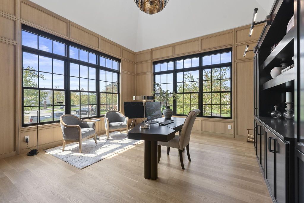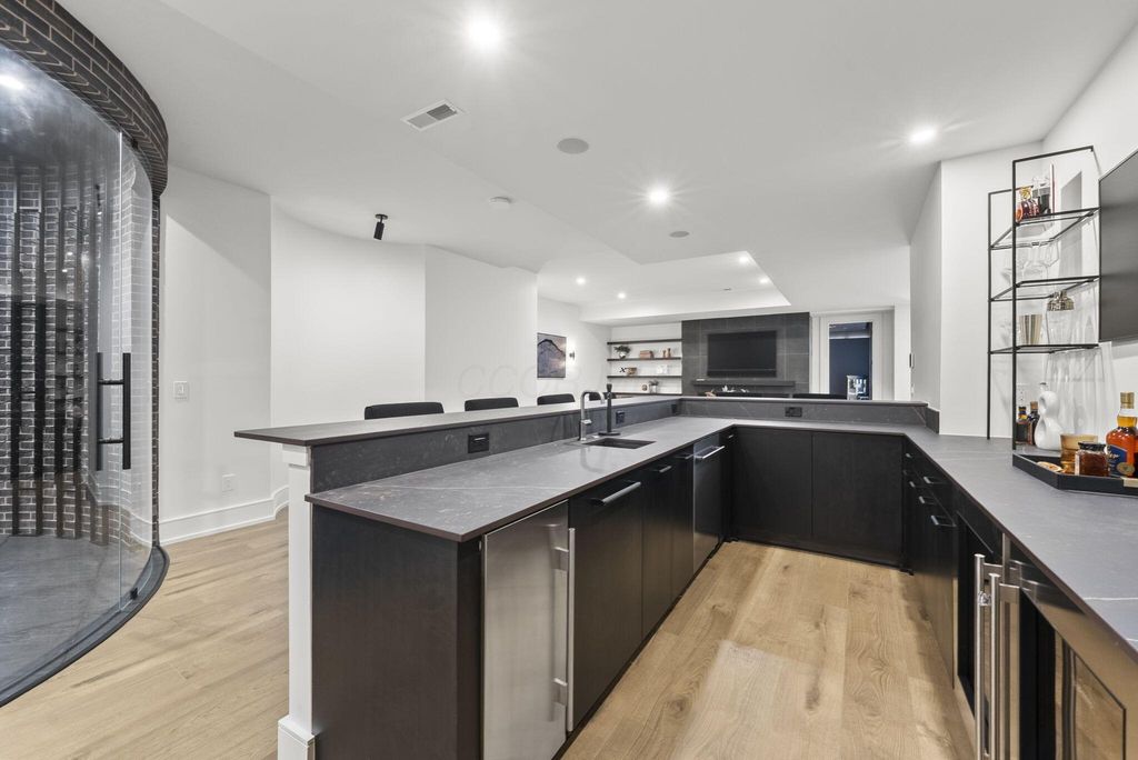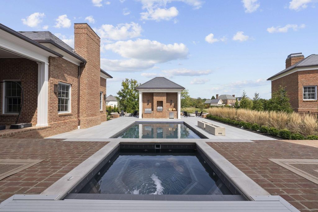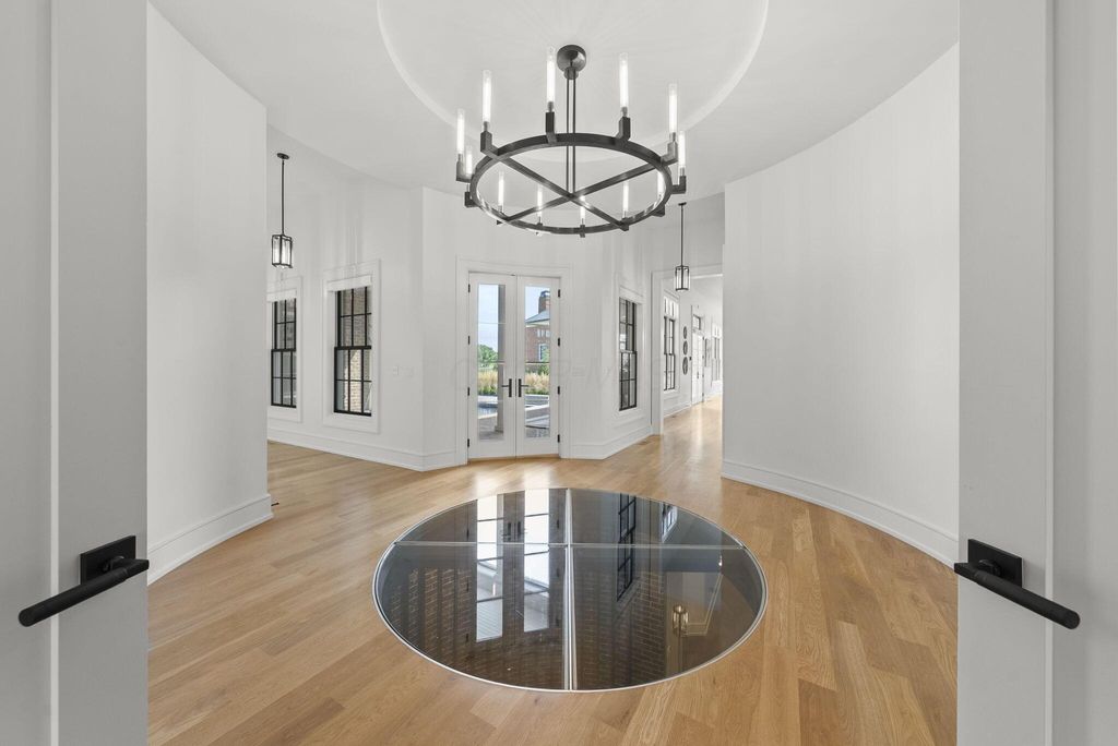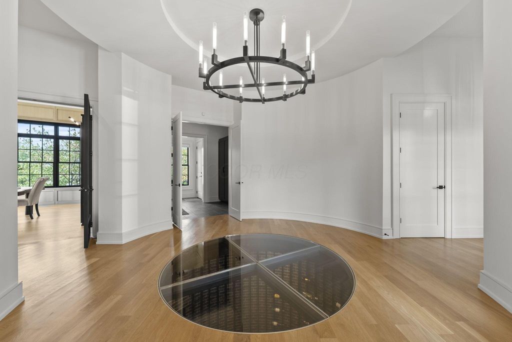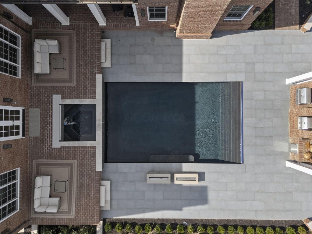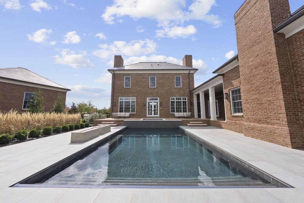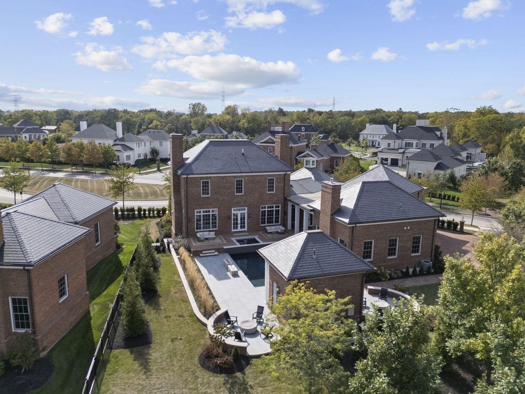 Experience timeless elegance with modern sophistication in this spectacular Georgian Manor, thoughtfully designed for both grand entertaining and everyday comfort. Completed in 2024, the residence offers a resort-style lifestyle with incredible outdoor living: pool, spa, full outdoor kitchen, and a dedicated pool house with half bath. A heated driveway and walkway provide ease of living during winter months, keeping snow and ice at bay. Inside, the home's expansive layout welcomes you with soaring ceilings and wide-open great room, dining, and kitchen spaces. The sleek chef's kitchen is outfitted with Wolf and Sub-Zero appliances, an oversized island, and a hidden scullery. A dramatic transition hall showcases a circular glass floor looking down to the temperature-controlled wine cellar, leading to a private office crowned by a vaulted cupola ceiling. Tucked away, a hidden bourbon room adds a unique touch of sophistication. The first-floor owner's suite is a private retreat with its own fireplace, spa-inspired bath, and a custom walk-in closet. Upstairs, three spacious bedrooms each feature their own en suite baths. The lower level is designed for entertainment and wellness, featuring a rec/media area with fireplace, a full theater room, bar, climate-controlled wine cellar, and a professional-grade gym with abundant storage. Perfectly situated on a picturesque lot overlooking a tranquil pond and the 18th fairway of New Albany Country Club, this home offers walkable access to the club's world-class amenities. A rare blend of architectural beauty and modern luxury, this is resort living at its finest.