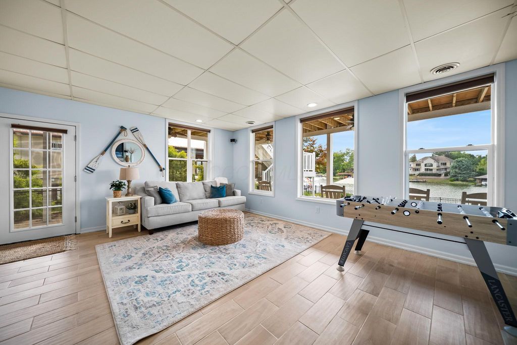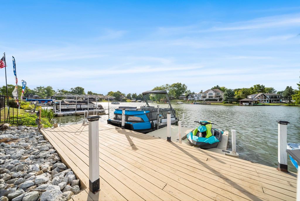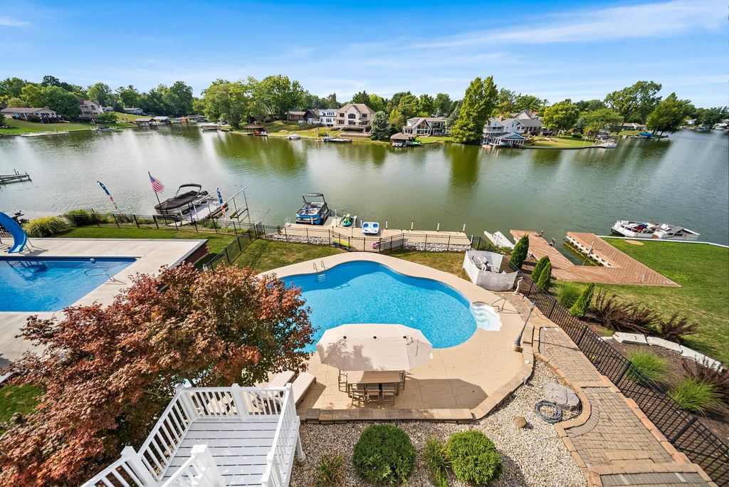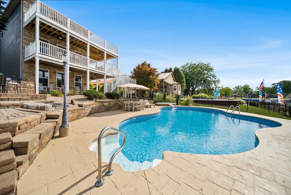 Welcome to one of Choctaw Lake's most iconic homes and a true standout in both style and setting. Nestled directly on the water, this stunning three-story retreat offers 3,700 square feet of beautifully designed space with four bedrooms plus a den/office (or a possible fifth bedroom) and three-and-a-half baths. The home captures attention with its striking presence and charm, inviting you to step into a lifestyle that feels like vacation every day. Being sold fully furnished, boat & lake toys included, this is a rare opportunity to enjoy lake living from day one. Sunlit interiors open to panoramic water views, while spacious gathering areas create the perfect backdrop for quiet moments & lively entertaining. Step outside to your private paradise featuring a sparkling pool with spillover spa, outdoor kitchenette, and take in breathtaking sunsets over the water on one of the two wraparound decks. The 3-car garage and storage shed ensure plenty of space for all your gear and adventures. Whether you're seeking a year-round residence or the ultimate weekend escape, this property offers the best of both worlds: luxury, leisure, and the magic of lakefront living.