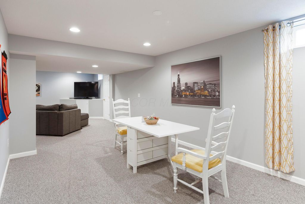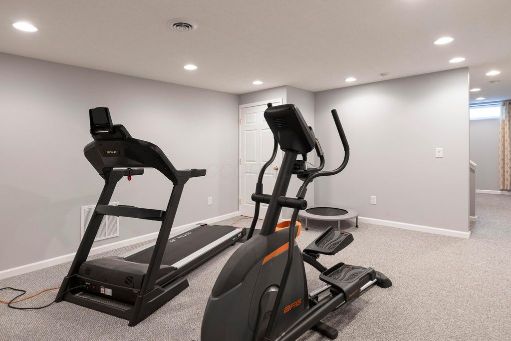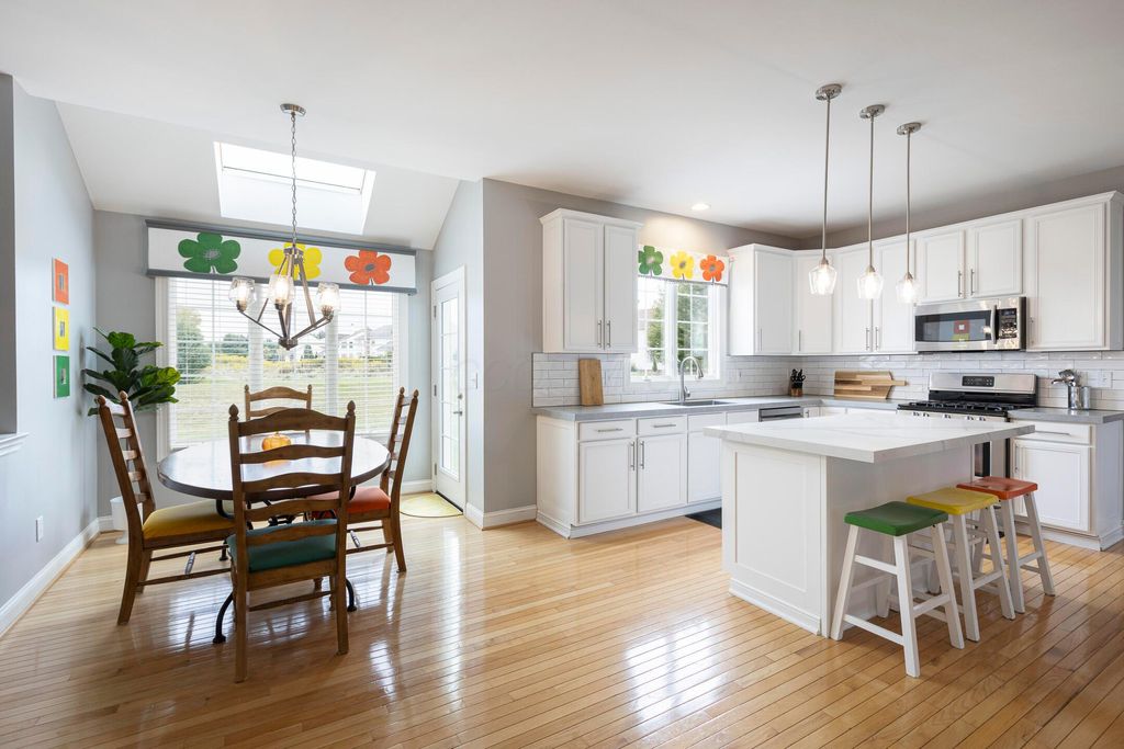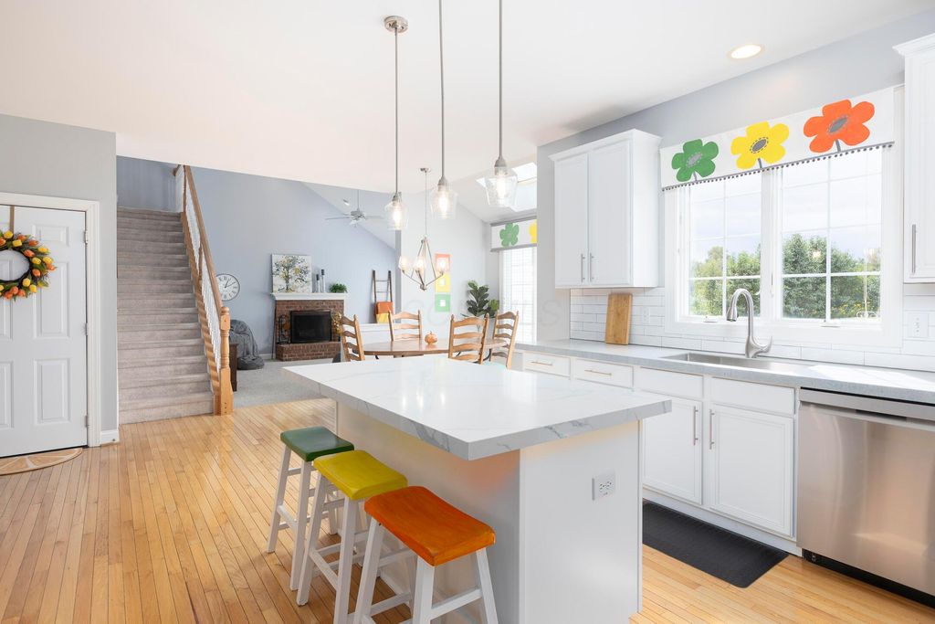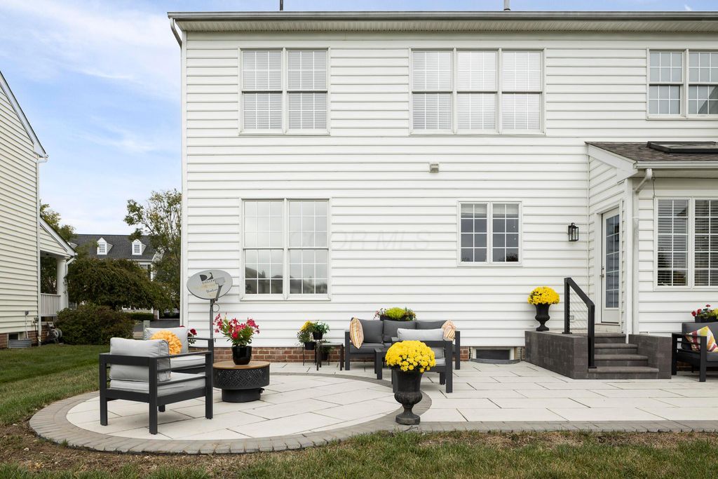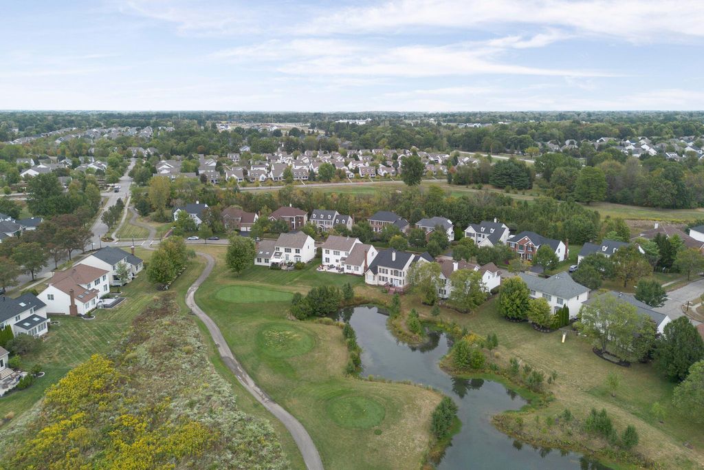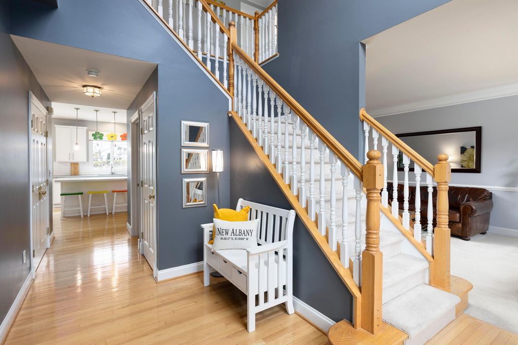 Beautiful 4 bedroom, 2.5 bath home in New Albany Links with 3,800+ sq ft of living space. A two-story foyer opens to a private home office, formal living room, and dining room with direct access to the kitchen. The kitchen offers stainless steel appliances, wood floors, a center island with bar seating, and an eating space with skylight, flowing into the family room with vaulted ceiling, loft overlook, and woodburning fireplace. A convenient first floor laundry and half bath complete the main level. Upstairs, the primary suite features a renovated bath with dual vanity, deluxe walk in shower, and spacious walk in closet. Three additional bedrooms, an updated full bath, and spacious loft complete the second floor. The finished lower level includes a home gym, media/rec space, and storage. Enjoy a large patio, generous backyard overlooking the golf course and pond, and a 2-car garage. Updates include new roof, whole-house paint, and kitchen remodel with back door (2020); new back patio, front entry and garage doors, renovated primary bath and closet (2024); and updated second-floor bath (2025).