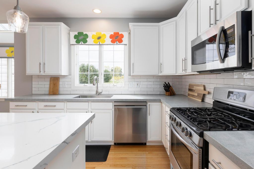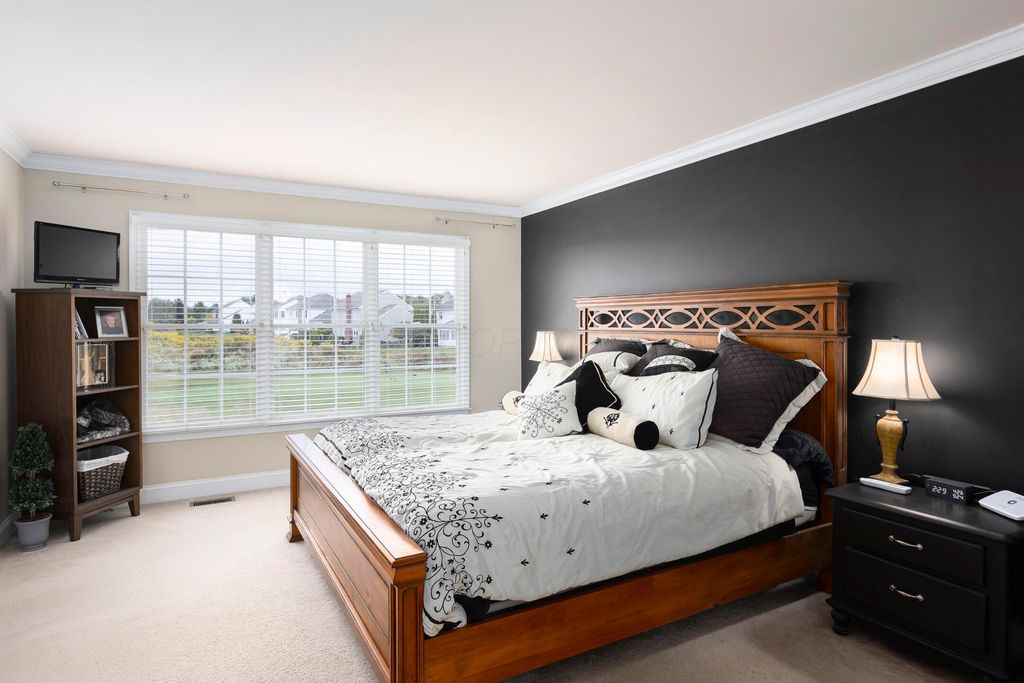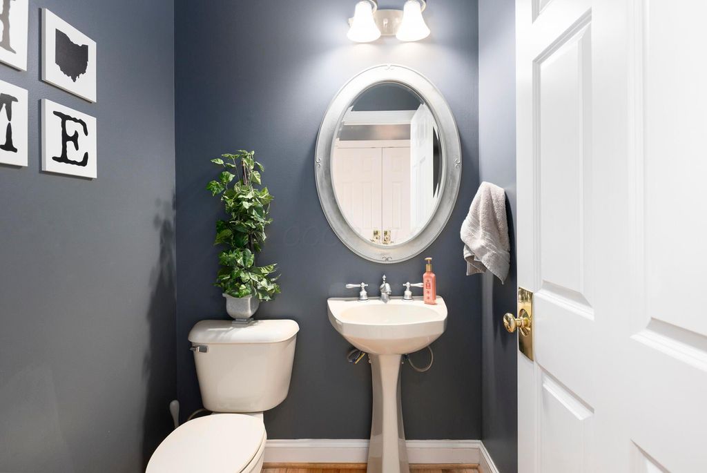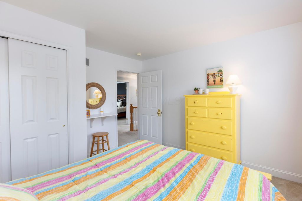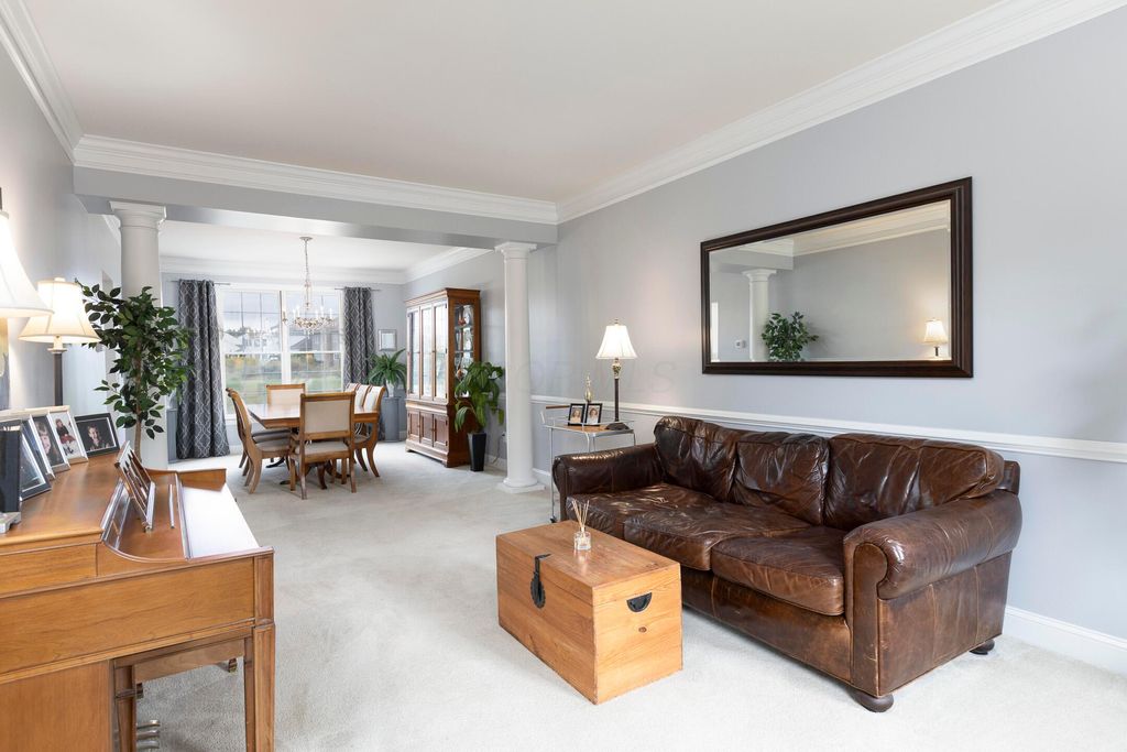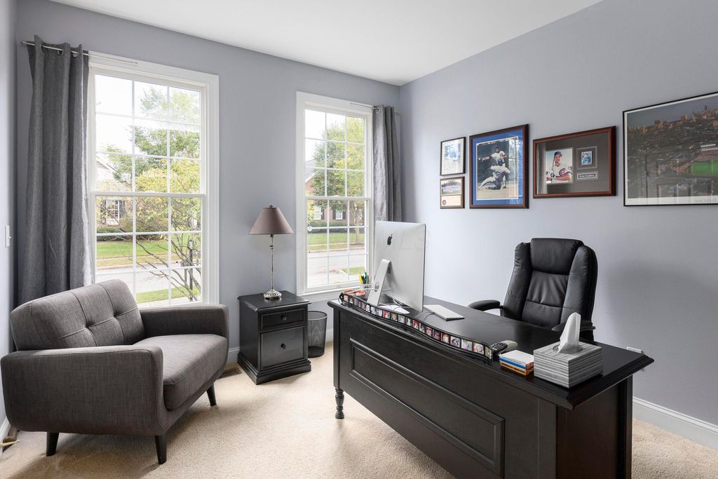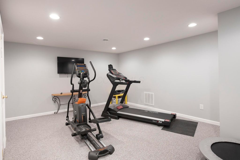 Beautiful 4 bedroom, 2.5 bath home in New Albany Links with 3,800+ sq ft of living space. A two-story foyer opens to a private home office, formal living room, and dining room with direct access to the kitchen. The kitchen offers stainless steel appliances, wood floors, a center island with bar seating, and an eating space with skylight, flowing into the family room with vaulted ceiling, loft overlook, and woodburning fireplace. A convenient first floor laundry and half bath complete the main level. Upstairs, the primary suite features a renovated bath with dual vanity, deluxe walk in shower, and spacious walk in closet. Three additional bedrooms, an updated full bath, and spacious loft complete the second floor. The finished lower level includes a home gym, media/rec space, and storage. Enjoy a large patio, generous backyard overlooking the golf course and pond, and a 2-car garage. Updates include new roof, whole-house paint, and kitchen remodel with back door (2020); new back patio, front entry and garage doors, renovated primary bath and closet (2024); and updated second-floor bath (2025).