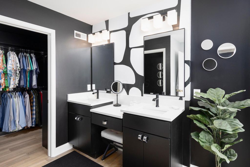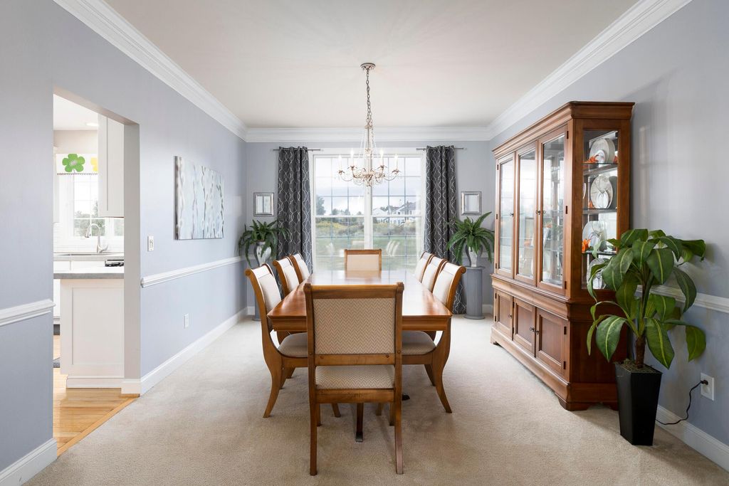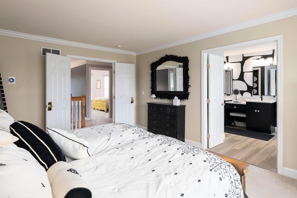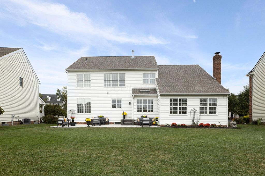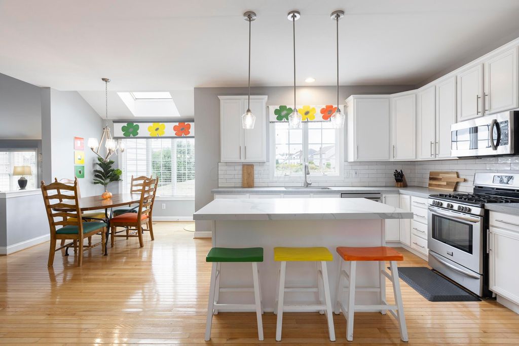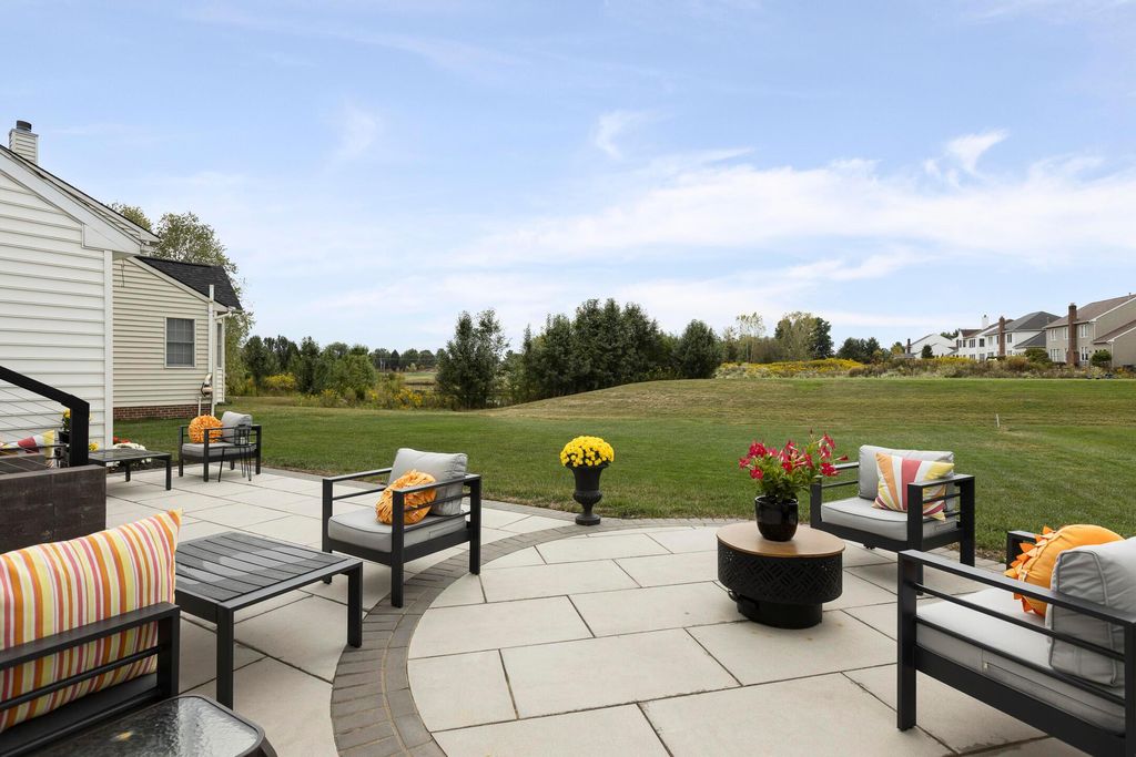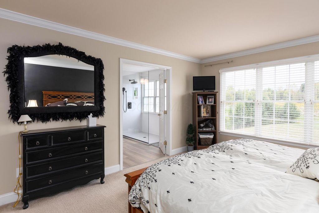 Beautiful 4 bedroom, 2.5 bath home in New Albany Links with 3,800+ sq ft of living space. A two-story foyer opens to a private home office, formal living room, and dining room with direct access to the kitchen. The kitchen offers stainless steel appliances, wood floors, a center island with bar seating, and an eating space with skylight, flowing into the family room with vaulted ceiling, loft overlook, and woodburning fireplace. A convenient first floor laundry and half bath complete the main level. Upstairs, the primary suite features a renovated bath with dual vanity, deluxe walk in shower, and spacious walk in closet. Three additional bedrooms, an updated full bath, and spacious loft complete the second floor. The finished lower level includes a home gym, media/rec space, and storage. Enjoy a large patio, generous backyard overlooking the golf course and pond, and a 2-car garage. Updates include new roof, whole-house paint, and kitchen remodel with back door (2020); new back patio, front entry and garage doors, renovated primary bath and closet (2024); and updated second-floor bath (2025).