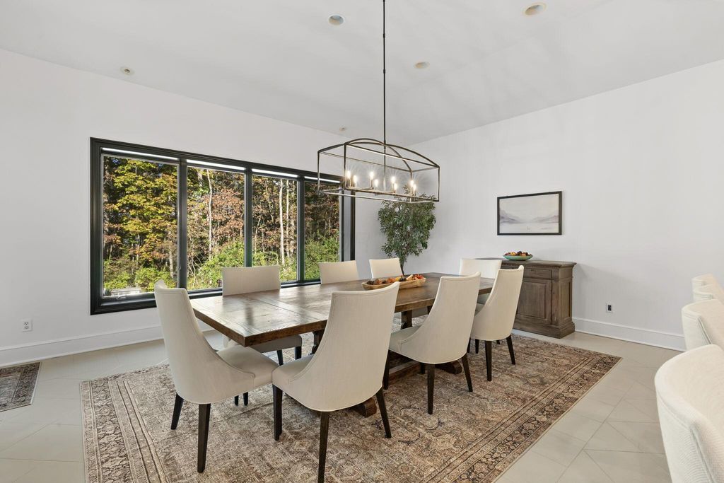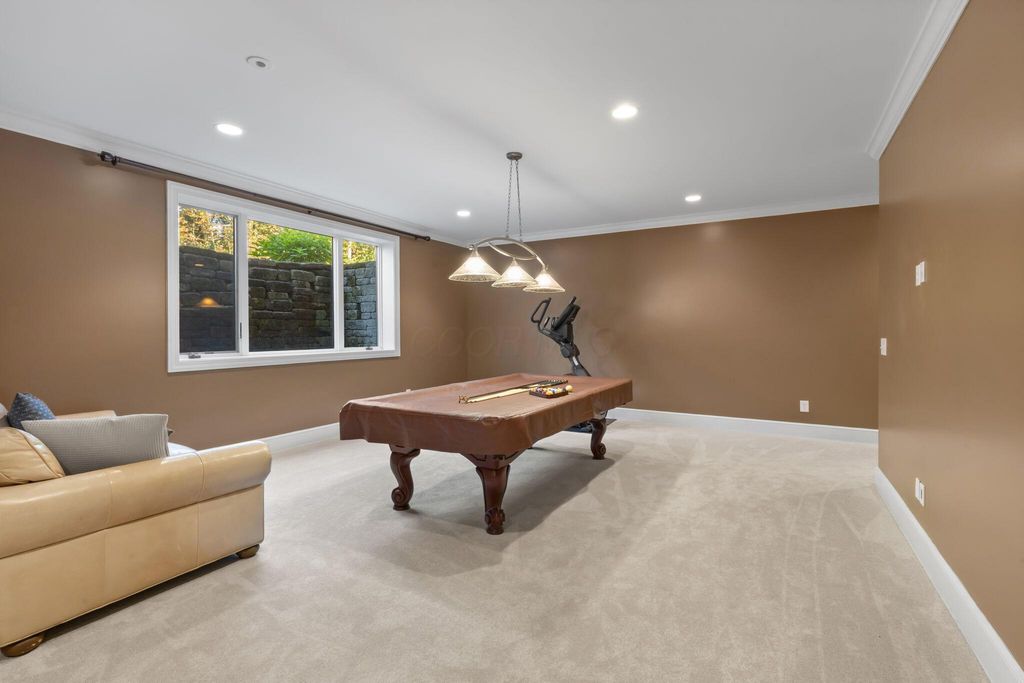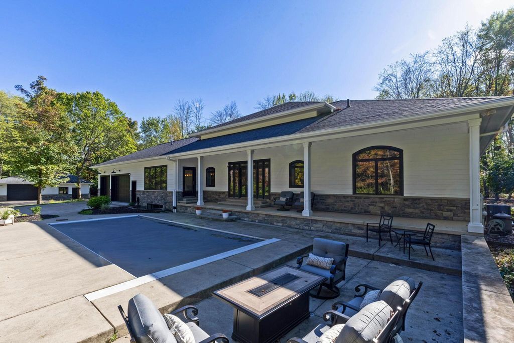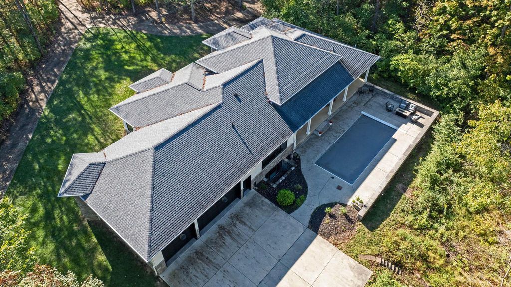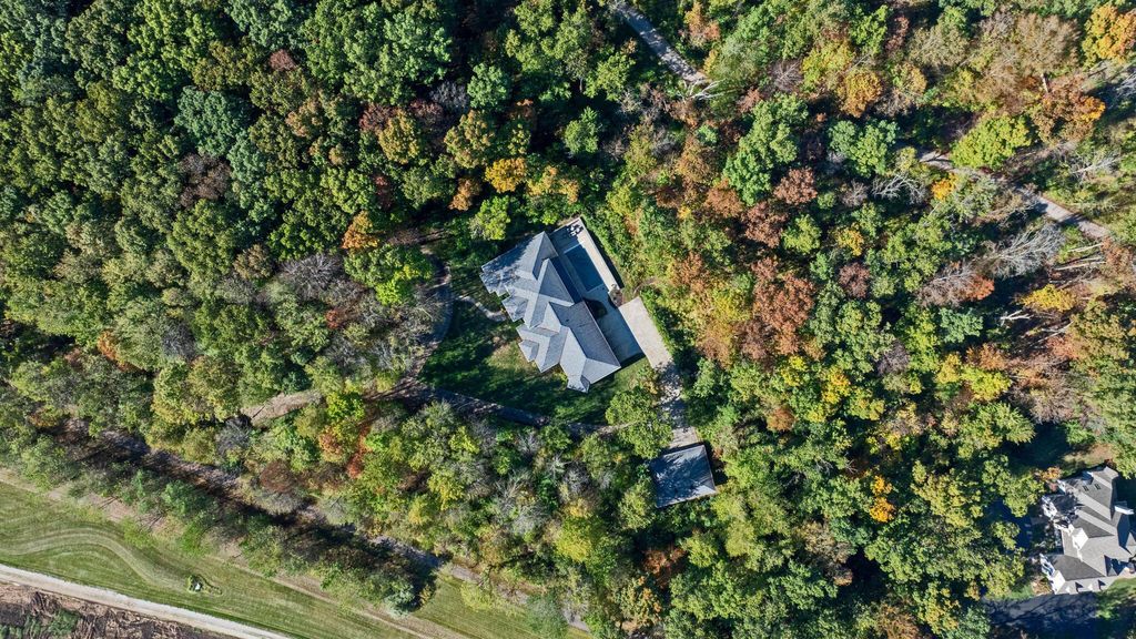 Experience 5 acres of privacy, comfort, and luxury in this one-of-a-kind custom ranch, perfectly tucked away on a wooded setting. Designed for both everyday living and entertaining, the home features an open-concept kitchen with recent remodel including new cabinetry and gorgeous island, and stunning views of the surrounding woods. The main level boasts spacious dining, and living areas. Retreat to the primary suite with a spa-like bath featuring a sunken soaking tub, step-in shower, and dual closets. Two additional bedrooms share a Jack-and-Jill bath, complemented by a den and large laundry room.The walk-up lower level is an entertainer's dream with a full bar, billiard area, possible theater room, spacious bedroom, and a full bath with soaking tub and attached laundry. New lower-level carpet adds a fresh touch throughout. Step outside to the expansive patio and your private backyard oasis, complete with a 32' heated saltwater pool, automatic cover, and scenic woodland backdrop. Recent tree clearing enhances the views and privacy, and freshly completed interior and exterior painting give the home a like-new feel.Additional highlights include a 3-car attached garage and a 1,200 sq. ft. detached garage/workshop with full bath, ideal for projects or hobbies. This energy-efficient estate is rare opportunity to own a secluded yet luxurious home with every amenity you could want.