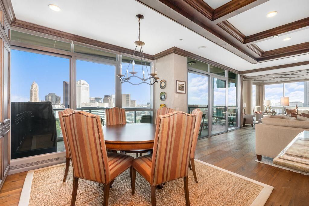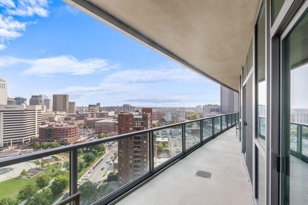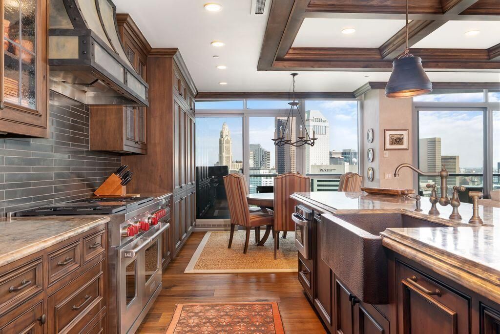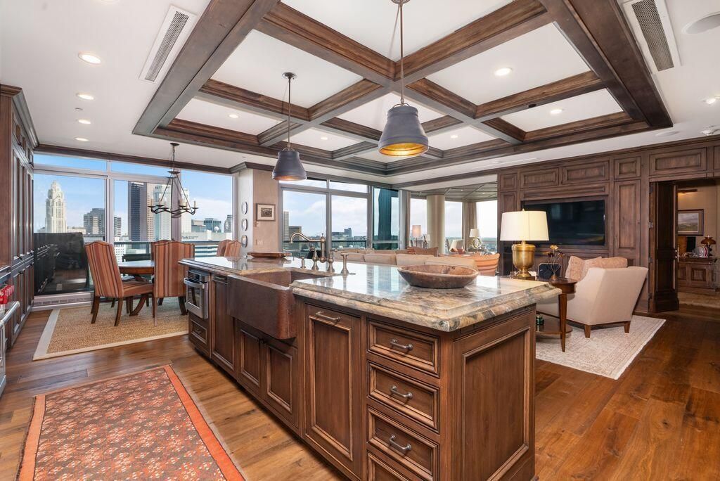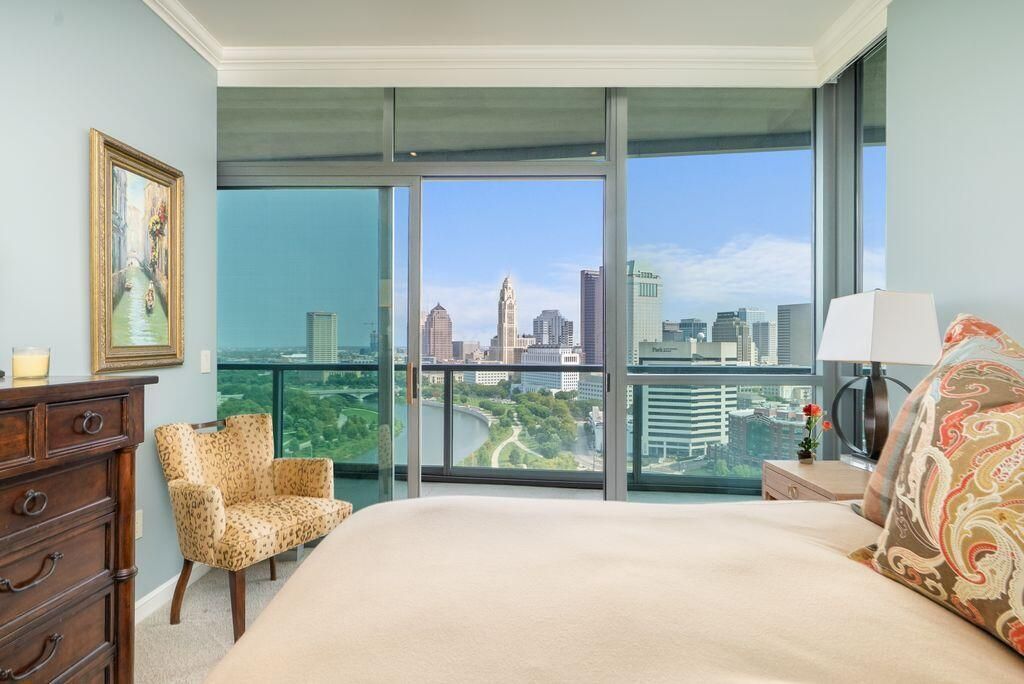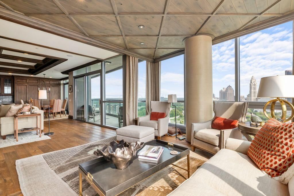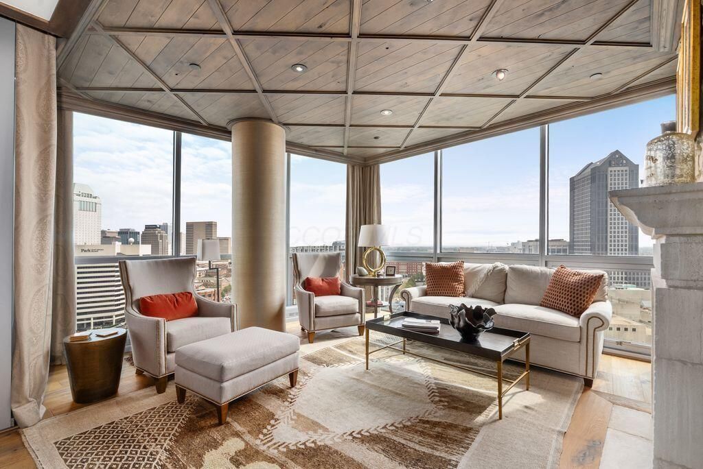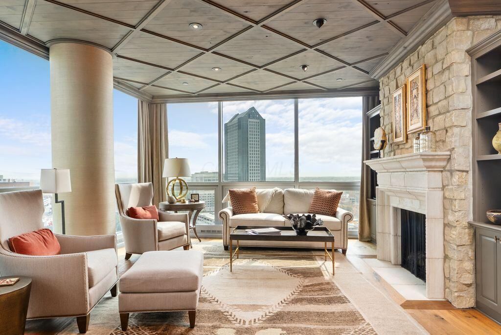 Absolutely immaculate, one-of-a-kind penthouse in the full-service Miranova building - located in the heart of downtown Columbus! No detail was overlooked in the buildout of this custom 3,100 sqft residence sprawling across the entire eastern corner of the 22nd floor. Three spacious bedrooms w/ensuite bathrooms, a den and two living rooms - one with gorgeous coffered ceilings w/matching built-ins & a wet bar - and the other with two walls of windows & a stone gas-log fireplace - both open to the Chef's kitchen that features an oversized island, Wolf range w/custom hood, paneled SubZero fridge & a walk-in pantry w/coffee station. Entry to the primary suite is through wood-paneled double doors and features a den/ seating area and a spa-like bathroom w/double sinks, a soaking tub walk-in shower & access to the laundry room. Enjoy breathtaking views of the Columbus skyline & Scioto River from every room or your private 42ft balcony! Plus, an enclosed two-car garage. Miranova amenities include: 24/7 doorman & concierge services, multiple resident lounges, fitness facility, swimming pool, guest apartment & so much more!