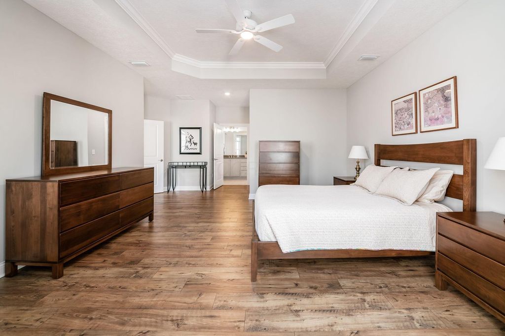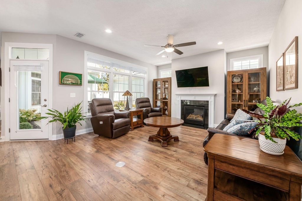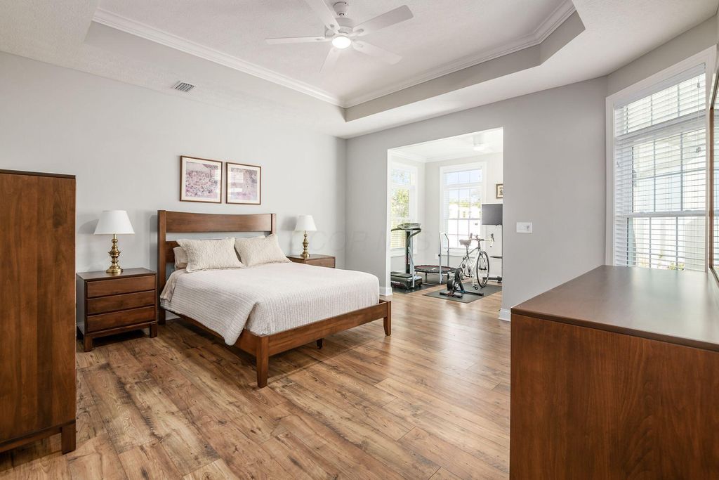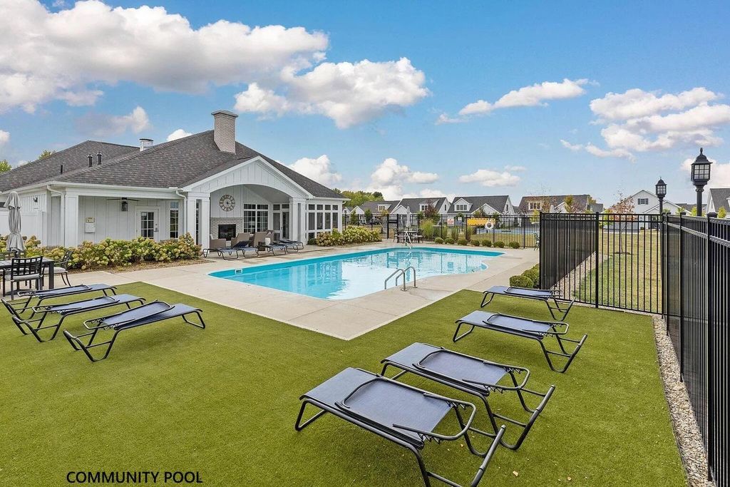 Exquisite home in premier 55+ Epcon community designed for single-level living with upstairs bonus suite! Features 3 bedrooms, 3 full baths, office/den, and open floor plan with high tray ceiling overlooking private courtyard. Gourmet kitchen boasts quartz countertops, large island with apron sink, stainless GE appliances, gas cooktop, and ample storage. Expansive Owner's Suite offers sitting area and spa-like bath with walk-in shower. Upstairs adds bed, bath, and rec/living space. Courtyard includes paver patio and low-maintenance landscaping. Community amenities: pool, clubhouse, fitness center, pickleball, and dog park.