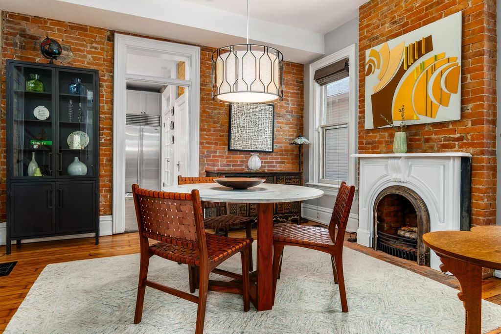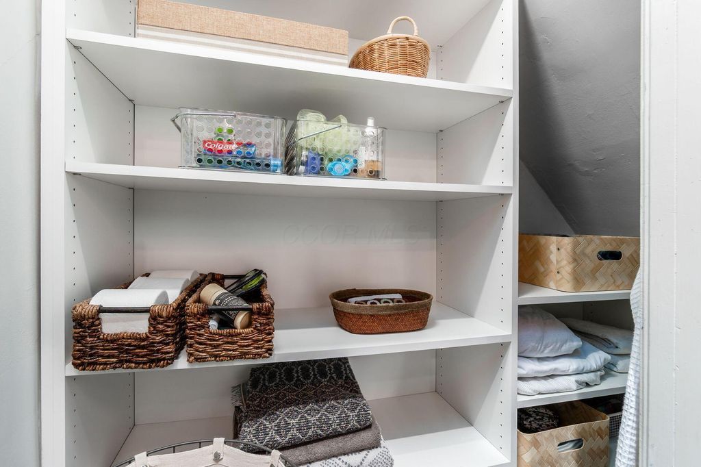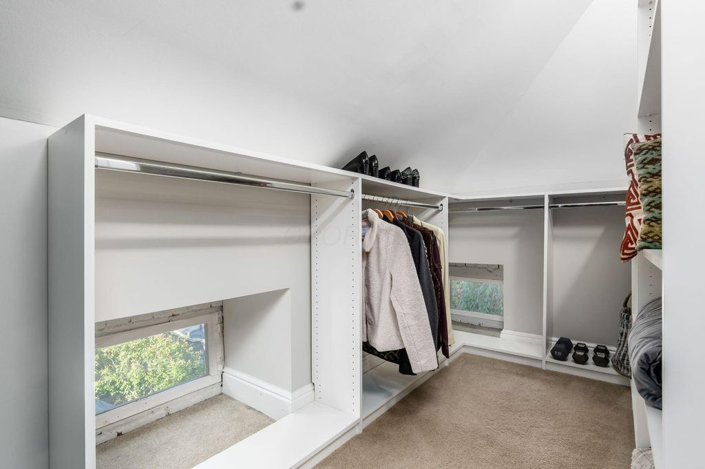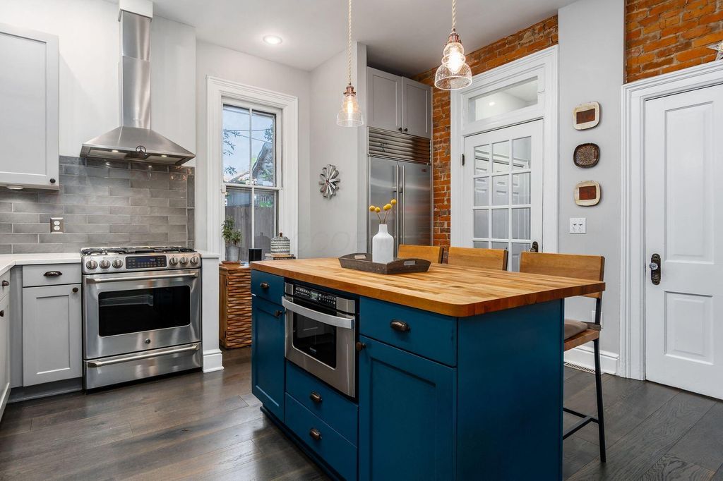 This 2-1/2 story, 3 bedroom, 2-1/2 bath brick Italiante home is located on a lushly tree-lined street in the heart of historic German Village within easy walking distance to restaurants, shops and Schiller Park. In addition to the charming living room and dining room, both with gas fireplace, the 1st floor features high ceilings, exceptionally tall windows, exposed brick, newly refinished hardwood floors & half bath with double-wide storage closet. The new laundry room, which includes LG stacked washer/dryer & generous storage, is adjacent to the open kitchen which features a large butcher block island & an abundance of Carrara marble counter-top space & shaker cabinetry. The primary suite has dual closets with organizers & includes a stunning, fully tiled, ensuite bath with spacious walk-in shower with seating, dual sinks with Carrera marble countertop and generous storage below, large storage closet & private W/C room. The 2nd floor skylight-lit guest room features a unique & unusually large walk-in closet room with window. The top floor is a charming guest bedroom with additional space perfect for a home office. There are skylights & yet another unusually large walk-in closet. Outside enjoy the tranquility of the fully-fenced private brick patio & the charming flag stone pavers area with water fountain. There is a one-car off-street parking space in addition to the one-car garage with Electric Vehicle charger.