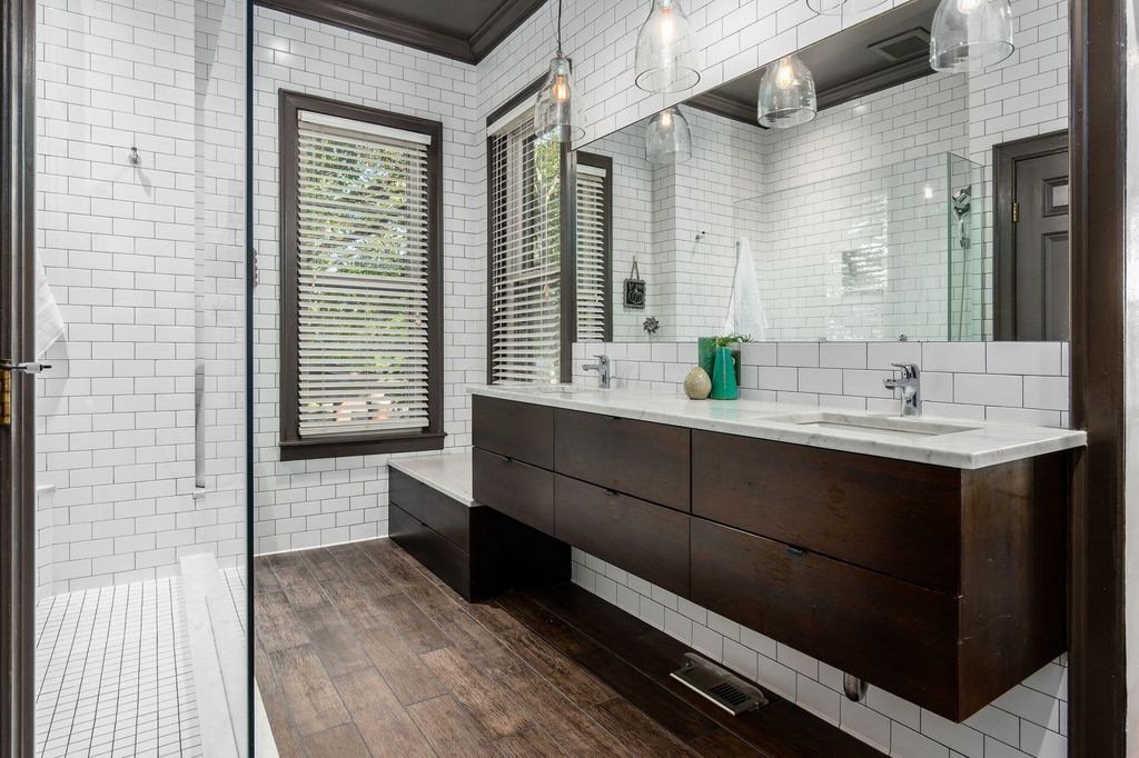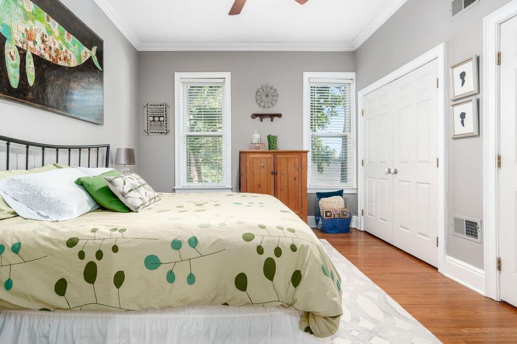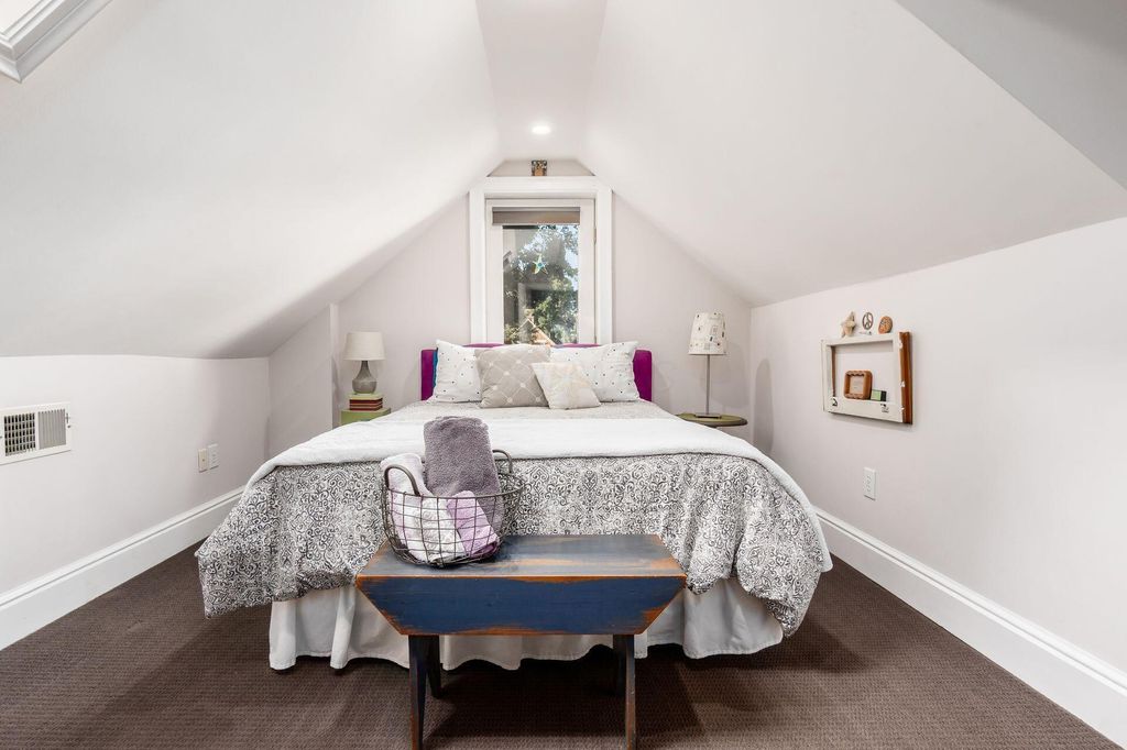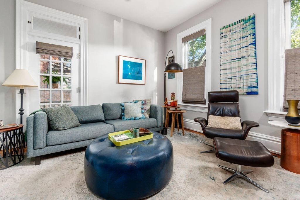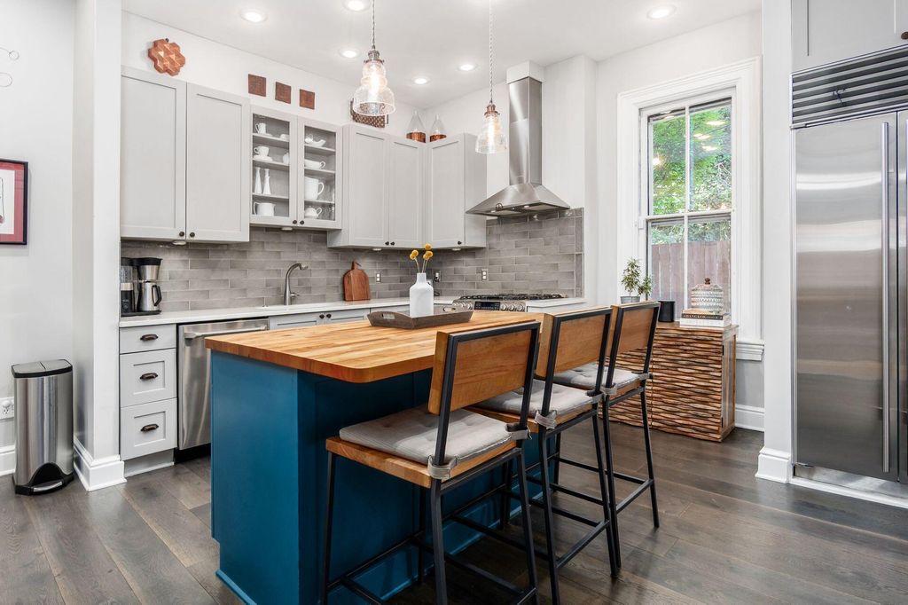 This 2-1/2 story, 3 bedroom, 2-1/2 bath brick Italiante home is located on a lushly tree-lined street in the heart of historic German Village within easy walking distance to restaurants, shops and Schiller Park. In addition to the charming living room and dining room, both with gas fireplace, the 1st floor features high ceilings, exceptionally tall windows, exposed brick, newly refinished hardwood floors & half bath with double-wide storage closet. The new laundry room, which includes LG stacked washer/dryer & generous storage, is adjacent to the open kitchen which features a large butcher block island & an abundance of Carrara marble counter-top space & shaker cabinetry. The primary suite has dual closets with organizers & includes a stunning, fully tiled, ensuite bath with spacious walk-in shower with seating, dual sinks with Carrera marble countertop and generous storage below, large storage closet & private W/C room. The 2nd floor skylight-lit guest room features a unique & unusually large walk-in closet room with window. The top floor is a charming guest bedroom with additional space perfect for a home office. There are skylights & yet another unusually large walk-in closet. Outside enjoy the tranquility of the fully-fenced private brick patio & the charming flag stone pavers area with water fountain. There is a one-car off-street parking space in addition to the one-car garage with Electric Vehicle charger.
