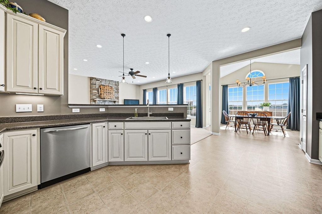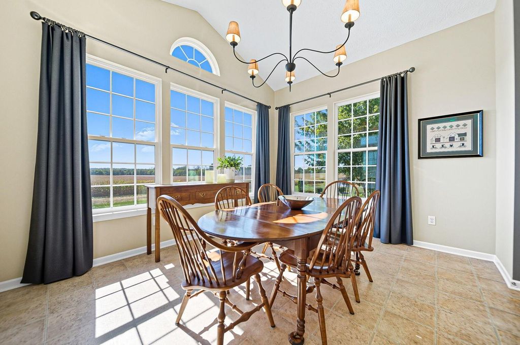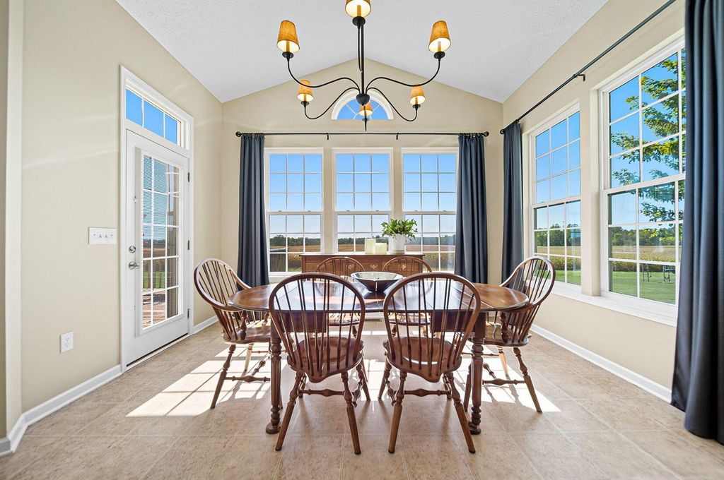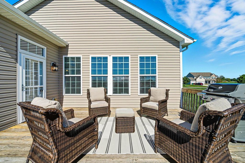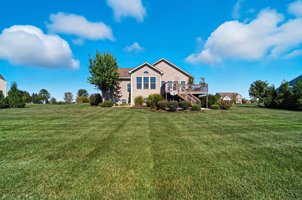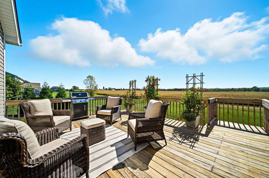 Welcome to York Gate Estates, where quiet convenience meets single-floor living on a picturesque one-acre lot. This 3-bedroom, 2.1-bath ranch offers nearly 4,000 square feet, including a completely finished lower level with remarkable light and versatility. At the heart of the home, the kitchen features 42'' cabinets and opens to the dining and family rooms, which together provide a wall of windows that flood the space with natural light. A door leads from the dining room to the deck, where you'll enjoy expansive views of the backyard, pine-lined privacy, and farm fields that ripple like waves in the breeze. The owner's suite includes two closets, a dual vanity, and a shower with bench seating. Downstairs, the open rec room is filled with natural light from a wall of windows"”perfect for entertaining, relaxing, or playing pool. A large half bath with laundry hookups and a dog wash station adds convenience, while a nearby nook is ideal for a future bar area. Ample storage keeps life organized. Outside, summer fireworks sparkle in every direction, and everyday sunsets are framed by peaceful fields. All of this just minutes from shopping, schools, all while nestled in the comfort of a sidewalk-lined neighborhood. Don't delay"”schedule your showing in this beautiful home ASAP!