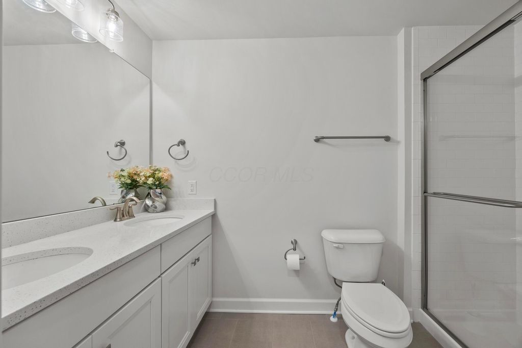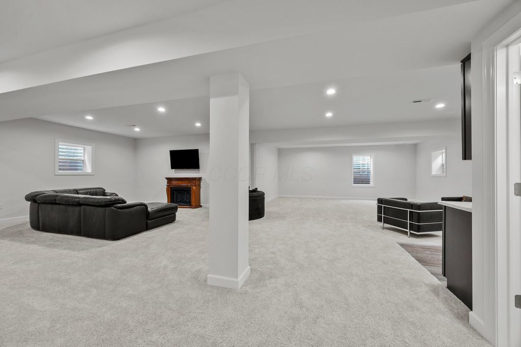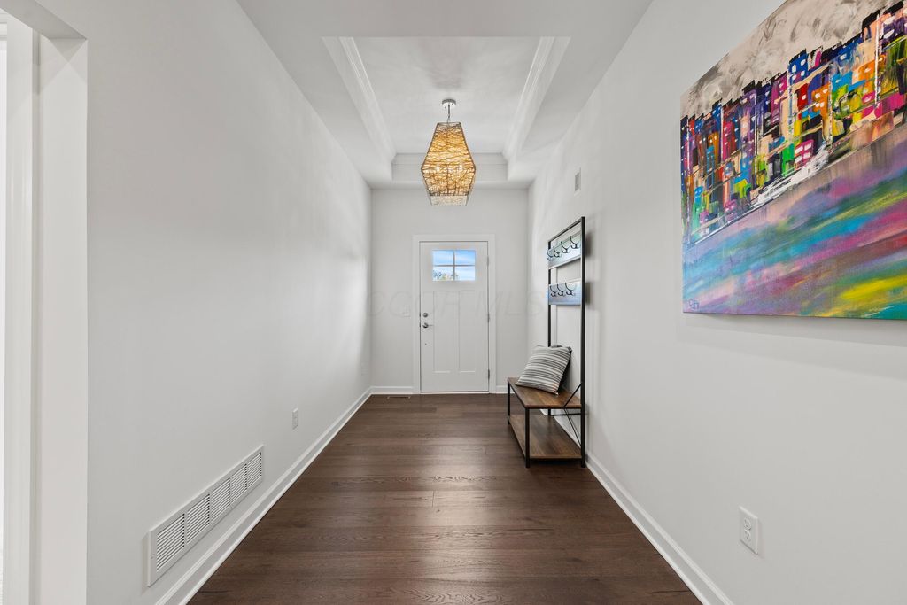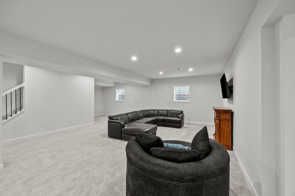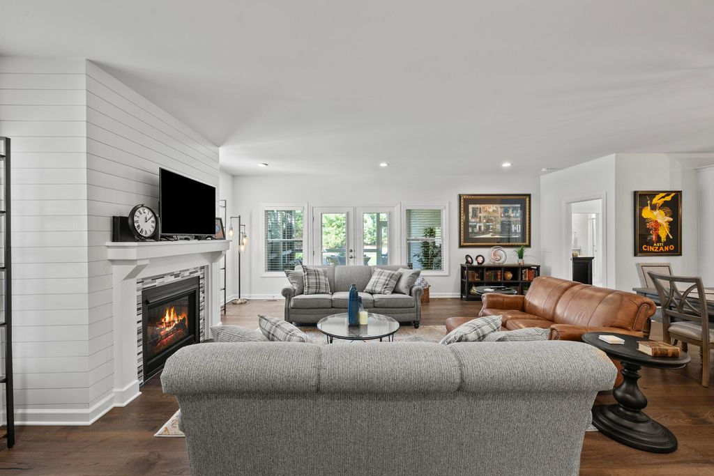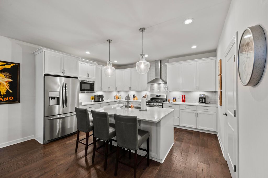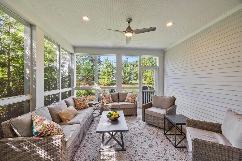 Welcome to this stunning former model home offering 3 bedrooms, 4 full baths, and nearly 3,900 square feet of beautifully finished living space. Every detail has been thoughtfully designed with quality finishes and timeless elegance. Inside, you'll find real hardwood floors, smooth ceilings, and custom woodwork throughout. The chef's kitchen features quartz counters, custom cabinetry with soft-close doors, under-cabinet lighting, stainless appliances, built-in microwave, and modern tile backsplash. The owner's suite is a true retreat, highlighted by oversized moldings, custom closet built-ins, quartz counters and tile flooring. Additional features include a gas log fireplace, private office with glass French doors, first-floor laundry with utility sink and cabinetry, and custom blinds throughout. The finished lower level is perfect for entertaining with a custom wet bar featuring quartz counters, a full bath, and several egress windows that allow for the option of a fourth bedroom. Step outside to your own backyard oasis with a screened-in porch, extended patio, gas line for grilling, and a sprinkler system to keep the landscaping lush. The covered front porch adds even more charm and curb appeal. This former model home combines luxury, function, and comfort in every space. It is truly move-in ready and designed for today's lifestyle. Don't miss your chance to make this exceptional property yours.