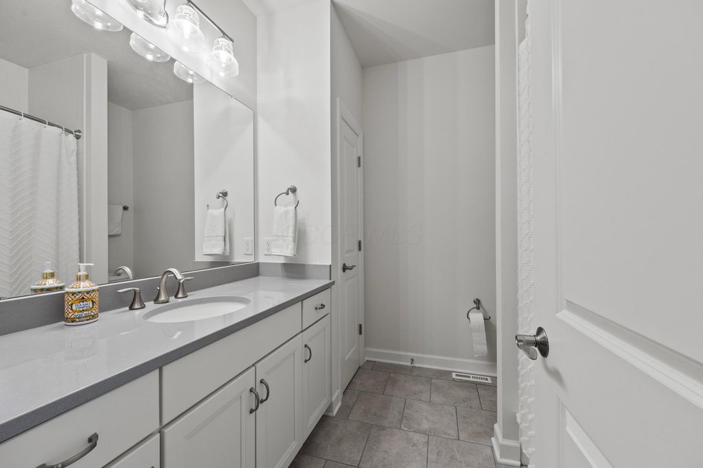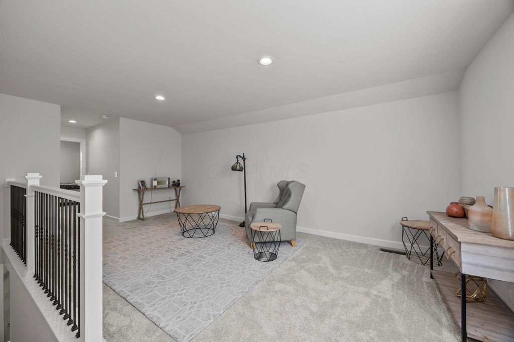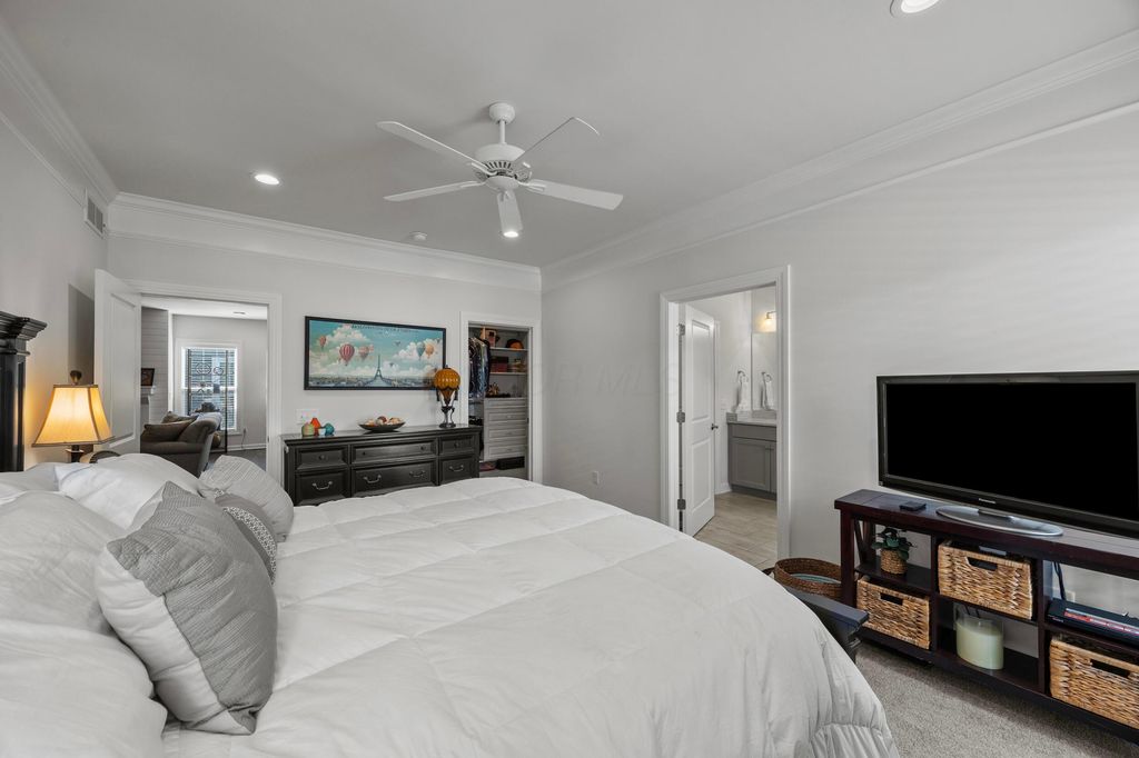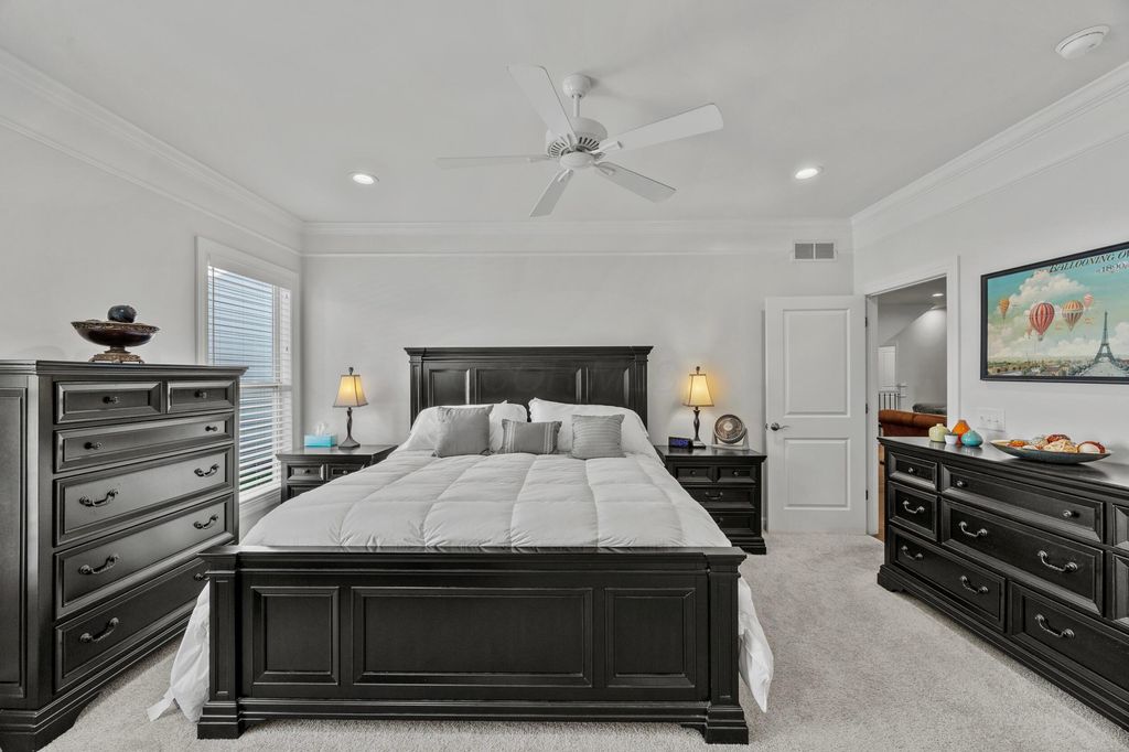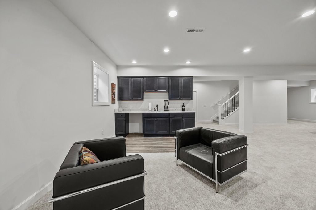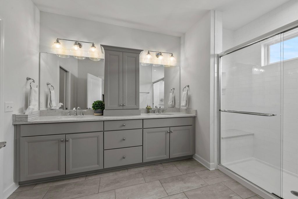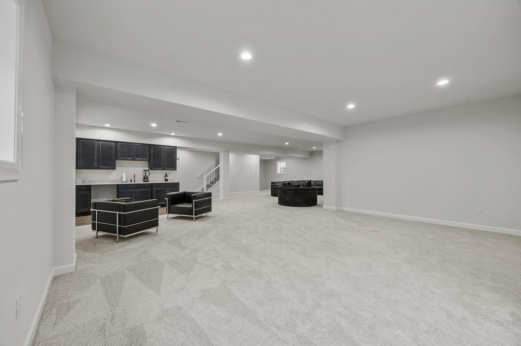 Welcome to this stunning former model home offering 3 bedrooms, 4 full baths, and nearly 3,900 square feet of beautifully finished living space. Every detail has been thoughtfully designed with quality finishes and timeless elegance. Inside, you'll find real hardwood floors, smooth ceilings, and custom woodwork throughout. The chef's kitchen features quartz counters, custom cabinetry with soft-close doors, under-cabinet lighting, stainless appliances, built-in microwave, and modern tile backsplash. The owner's suite is a true retreat, highlighted by oversized moldings, custom closet built-ins, quartz counters and tile flooring. Additional features include a gas log fireplace, private office with glass French doors, first-floor laundry with utility sink and cabinetry, and custom blinds throughout. The finished lower level is perfect for entertaining with a custom wet bar featuring quartz counters, a full bath, and several egress windows that allow for the option of a fourth bedroom. Step outside to your own backyard oasis with a screened-in porch, extended patio, gas line for grilling, and a sprinkler system to keep the landscaping lush. The covered front porch adds even more charm and curb appeal. This former model home combines luxury, function, and comfort in every space. It is truly move-in ready and designed for today's lifestyle. Don't miss your chance to make this exceptional property yours.