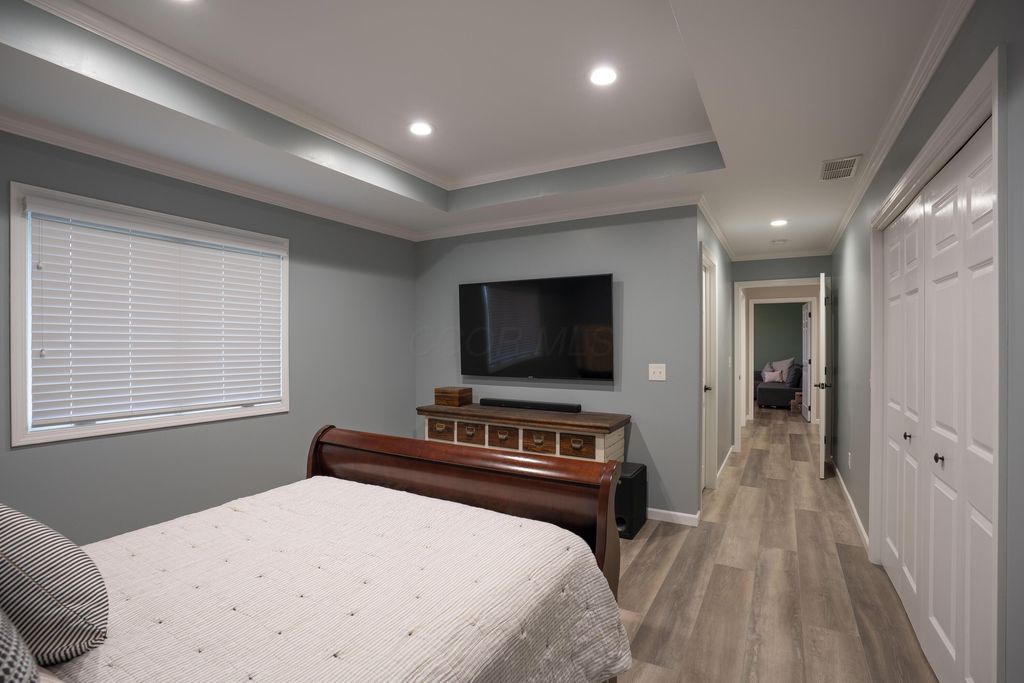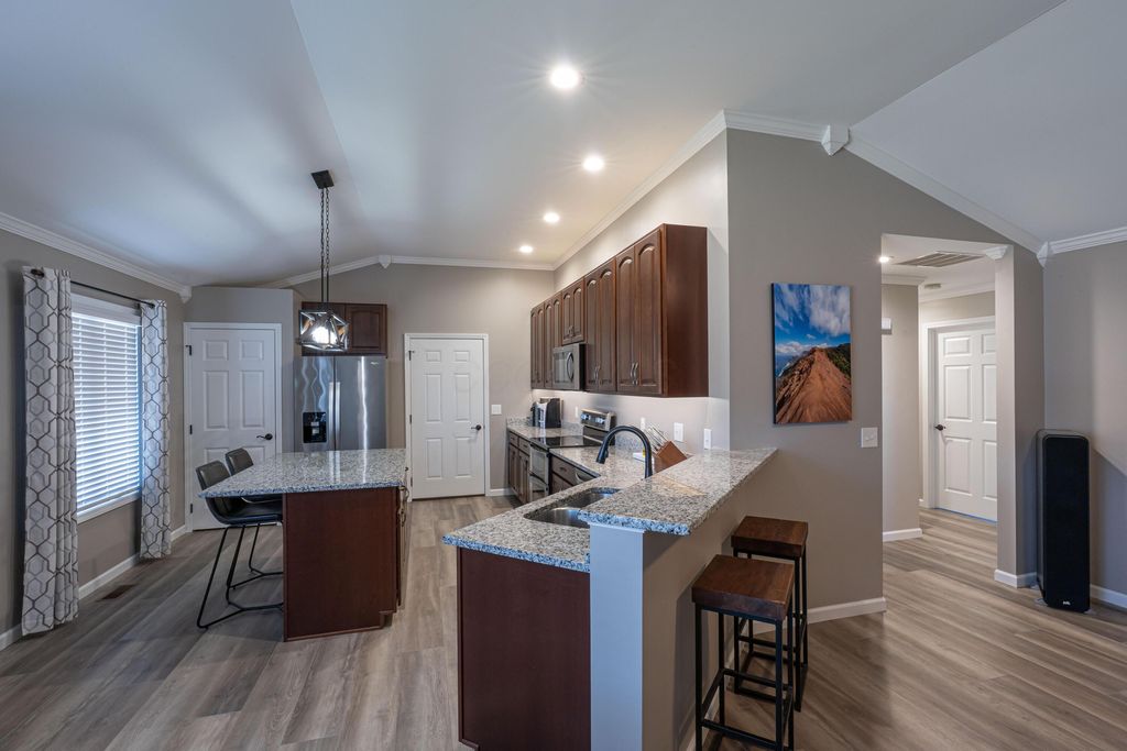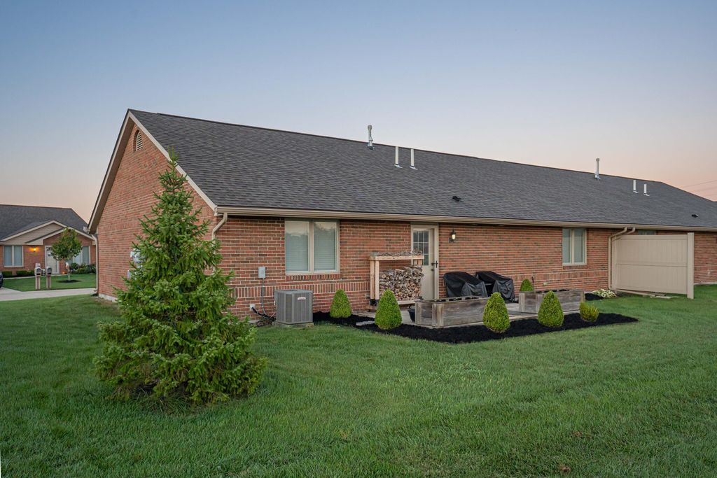 Welcome home to a luxurious modern brick ranch condo in the desirable Village at Timber Lakes II. Designed with style and function in mind, the open floor plan features vaulted ceilings in the kitchen, living room and tray ceiling in the master bedroom. The homeowner worked with the builder to design a custom kitchen and master bath layout unique to only 1 of the 43 units in the community. Many other exclusive finishes include crown molding throughout the entire home, kitchen island, double oven, seamless LVP flooring, solid cherry cabinets, water softener, smooth ceilings, easy lift blinds. Also the only unit with electrical service upgrades supporting simultaneous charging of 2 electric vehicles. Enjoy peaceful and breathtaking sunrises/sunsets and wildlife on the premium waterfront lot!