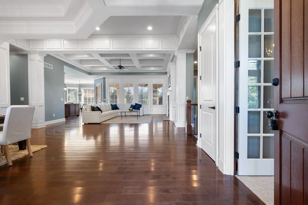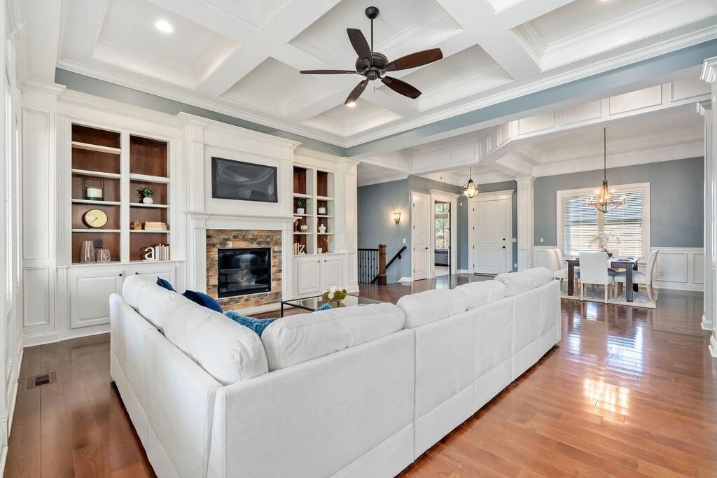 Experience refined living in this beautifully designed home tucked within a private gated community. Every detail was crafted for comfort and connection"”from the open floor plan with coffered ceilings and rich hardwood floors to the gourmet kitchen featuring a gas range, double ovens, granite countertops, and a large island perfect for entertaining. The great room's custom built-ins and fireplace create an elegant yet relaxed gathering space, while French doors open to a quiet home office. The first-floor primary suite offers a spa-inspired bath with dual granite vanities, a double-head shower, and a custom walk-in closet. A second main-floor suite provides flexibility for guests. The finished lower level includes a spacious recreation room, wet bar, kitchenette, home theater, bedroom, and full bath. Step outside to a covered patio with ceiling fans and stone details overlooking the private, tree-lined yard"”ideal for evenings spent dining or unwinding outdoors.