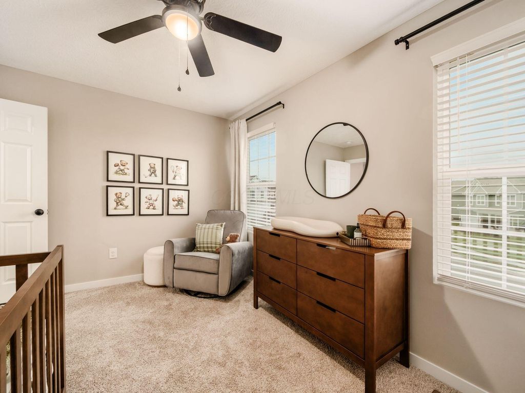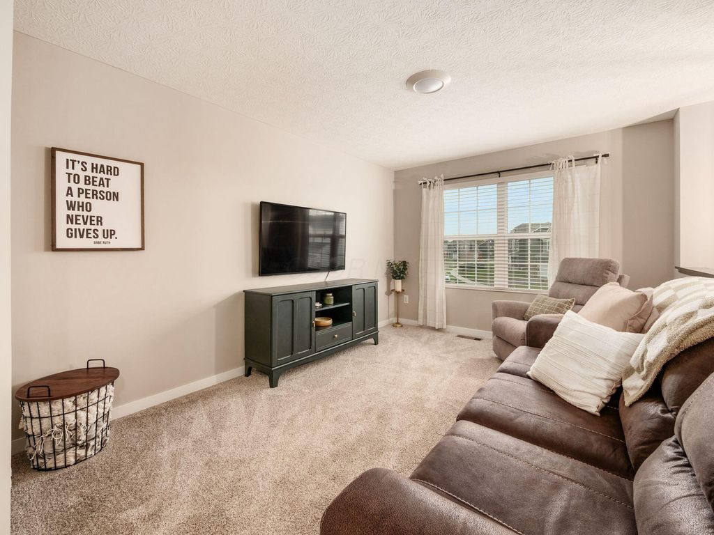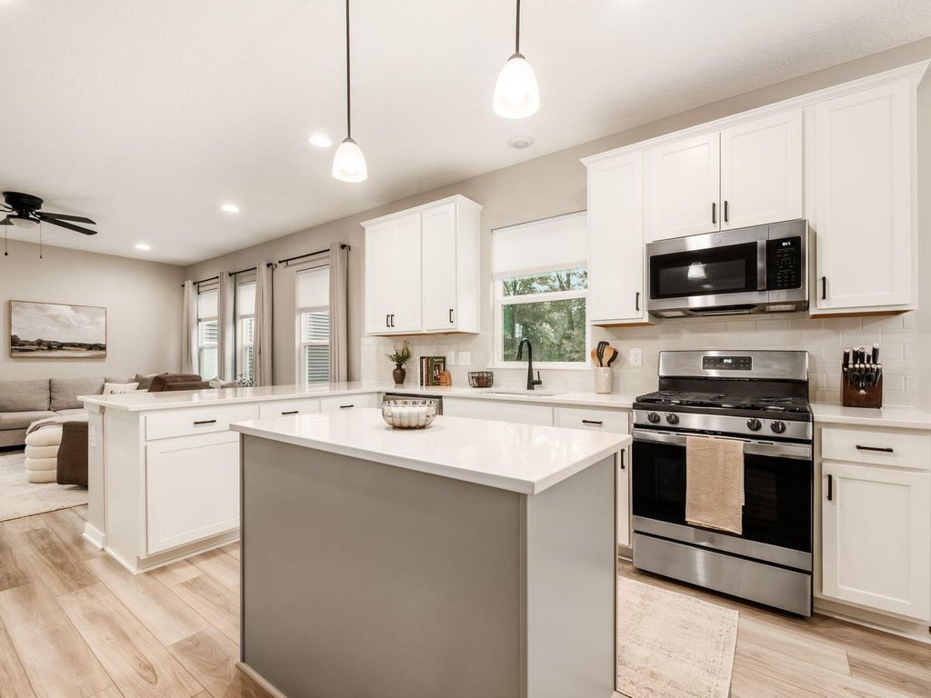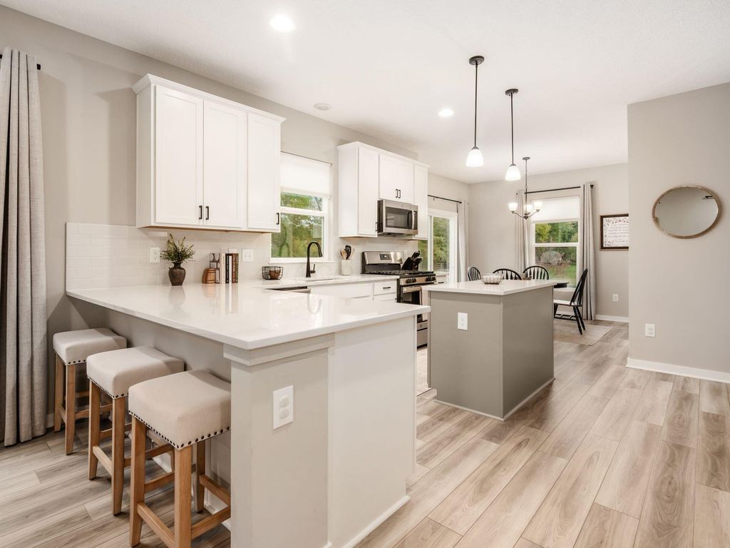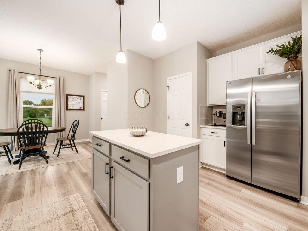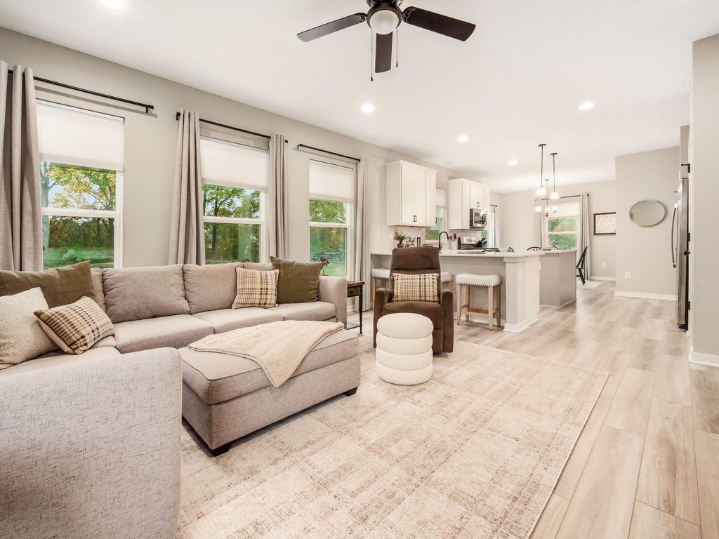 Sellers relocating! Nearly new Dearborn floor plan"”just 1 year old and priced below replication. Features 3 bedrooms, 2.5 baths, plus a rough-in for a full bath in the LL. The first floor offers a private den and open-concept living with LVP flooring. The kitchen boasts white cabinets, quartz countertops, island, stainless steel appliances including gas range, and a sliding glass door to the patio and flat, tree-lined yard"”one of the largest lots in Liberty Grand. Upstairs includes a loft, 2nd-floor laundry, and owner's suite with vaulted ceiling, walk-in closets, and oversized shower. Rare garage bump-out adds valuable storage or workspace. Updated lighting and window blinds throughout. Fast close"”just in time for the holidays!