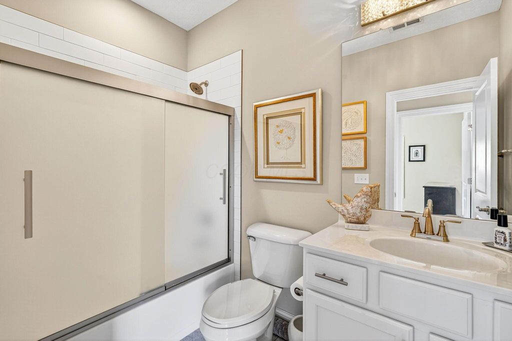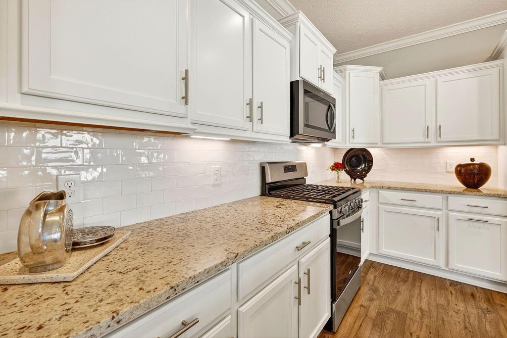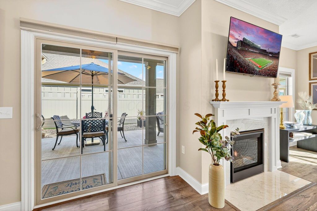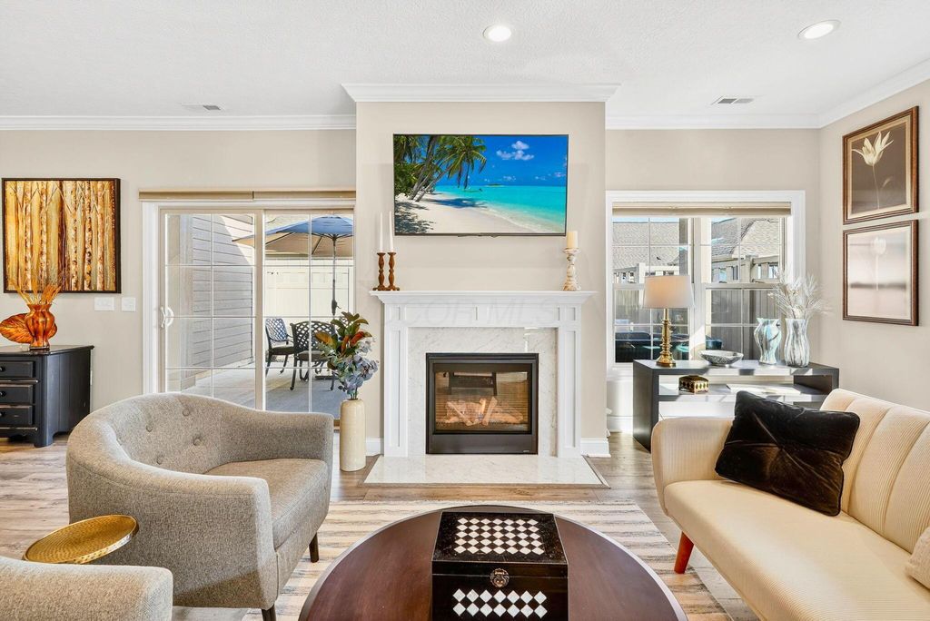Immaculate 3 bedroom condo in Powell! This Epcon built home offers an open floor plan with tons of natural light and upgrades throughout. The kitchen features staggered white cabinetry with granite counter tops, tile back splash, newer Whirlpool appliances (2024), a large island with single bowl sink, pendant lighting & a large pantry. The spacious living room has a 32' gas log fireplace with mantel & tech tube for wall mounted television, Mohawk luxury plank flooring, large windows with views of the back yard, and a patio door leading to the fenced courtyard. Also conveniently located on the first floor you will find the primary bedroom and a guest bedroom, which can be used as a den or home office, 2 full bathrooms and a laundry room with built in cabinetry and storage. Upstairs you will discover a large bonus room/flex space, another bedroom & full bathroom and even more storage. Other features in this home include a full view storm door, upgraded trim package throughout, upgraded lighting, custom window treatments, upgraded carpeting & pad in bedrooms, large walk in closets, added storage in closets, pantry and garage, an expanded courtyard for additional outdoor living space and a 2.5 car attached garage. Community amenities include a large clubhouse with gathering room, fitness room, swimming pool, pickle ball and bocce ball courts - enjoy a low maintenance lifestyle in a very active community located close to downtown Powell with great shopping and restaurants. Possession can be at closing!