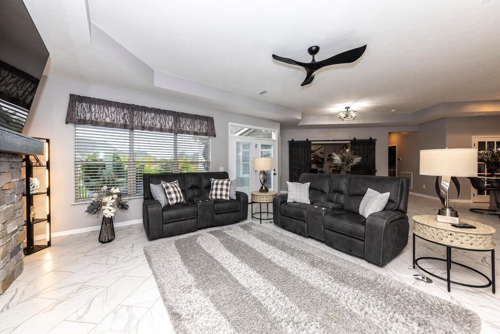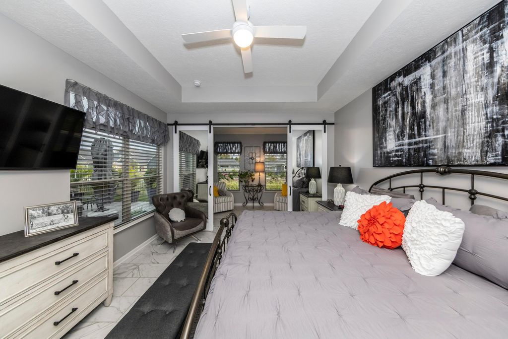 Welcome to this stunning free-standing Epcon Promenade condominium in desirable Courtyards at River Bluff. This spacious, open floor plan features 2 bedrooms, a four seasons room/den, a sitting room off the primary suite, 2 ½ bathrooms, laundry room with custom built cabinets, custom sink and quartz counter. Enjoy extras like your private gated, tiled courtyard and a 2.5 car attached garage featuring a Polyaspartic floor for ease in cleaning. The home Interior features a universal design layout with wider doors & hallways with a zero threshold at the front door. Upgraded tile flooring throughout the entire living area. The den features two windows with transom for natural lighting and custom barn doors. The living area features trayed ceilings and a rustic stone fireplace with gas log and striking wood mantel. Enjoy the ease and convenience of arranging furniture and lighting per the installed floor outlets strategically set in the living area. The kitchen features the deluxe layout option with staggered 42'' cabinetry, tile back splash, Quartz counter tops, upgraded hardware, pendant lighting, upgraded SS appliances including double ovens, microwave, gas cook-top & a French door refrigerator. The oversized island has a deep sink with built in shelving and the California closet design pantry affords abundant storage. Combine this outstanding kitchen design and the two skylights offering an array of sunlight makes this the perfect space for entertaining family and friends while overlooking your private courtyard. The primary suite has tray ceilings, a peaceful sitting room with patio doors leading to the courtyard, and custom barn doors with full mirrors for privacy. The custom California style closet in the main bedroom affords more storage and hanging space. The primary bath has raised vanity sinks, quartz countertops, a zero-entry shower & a transom window for natural light.