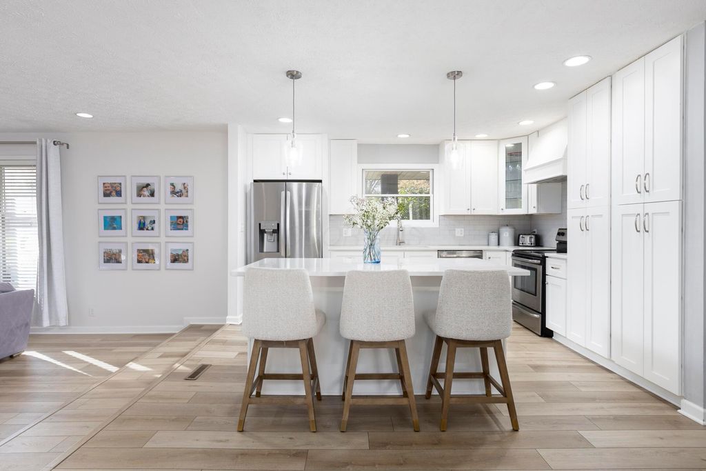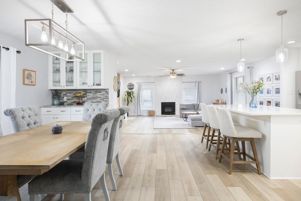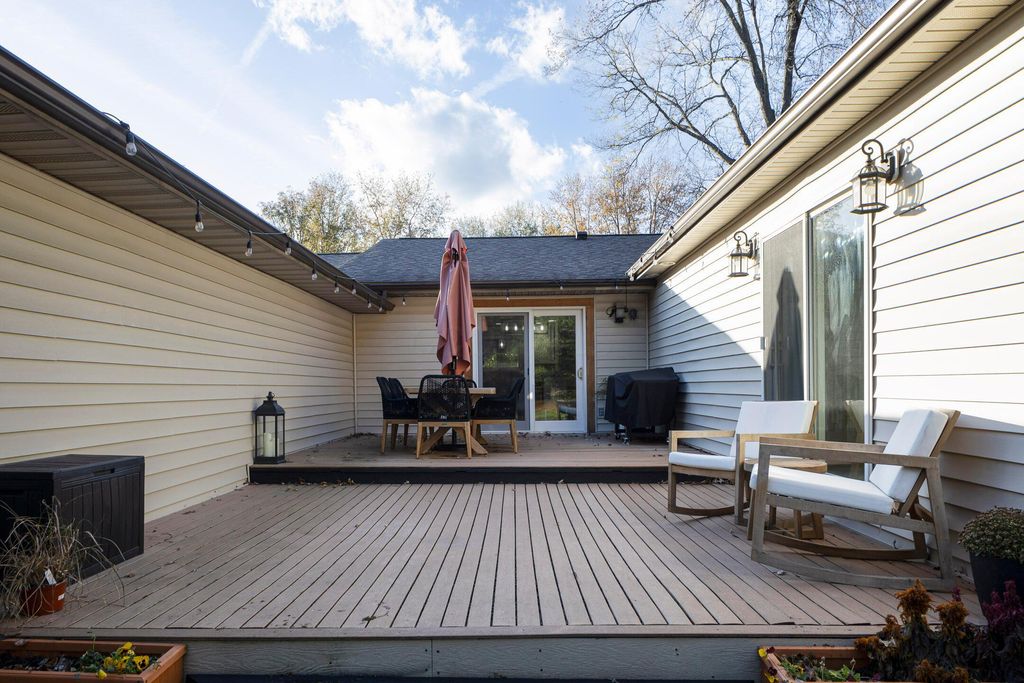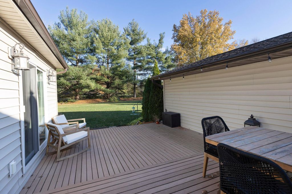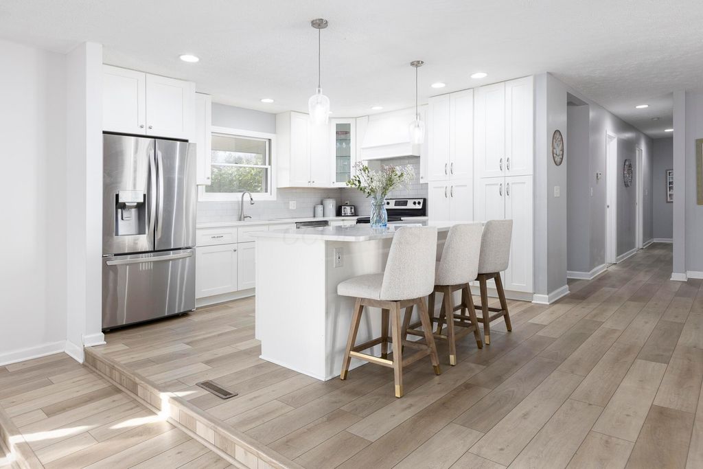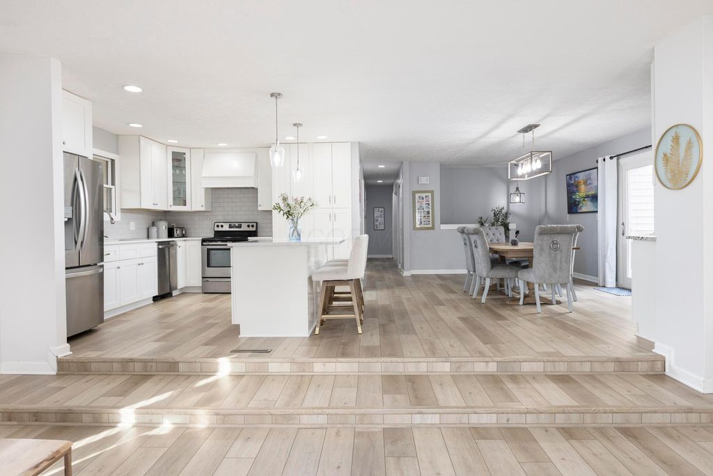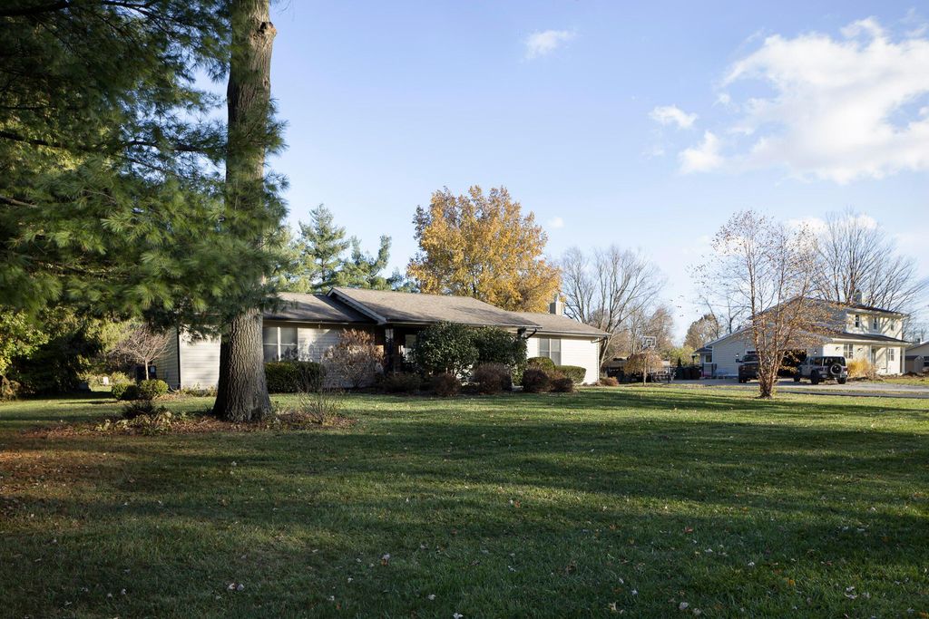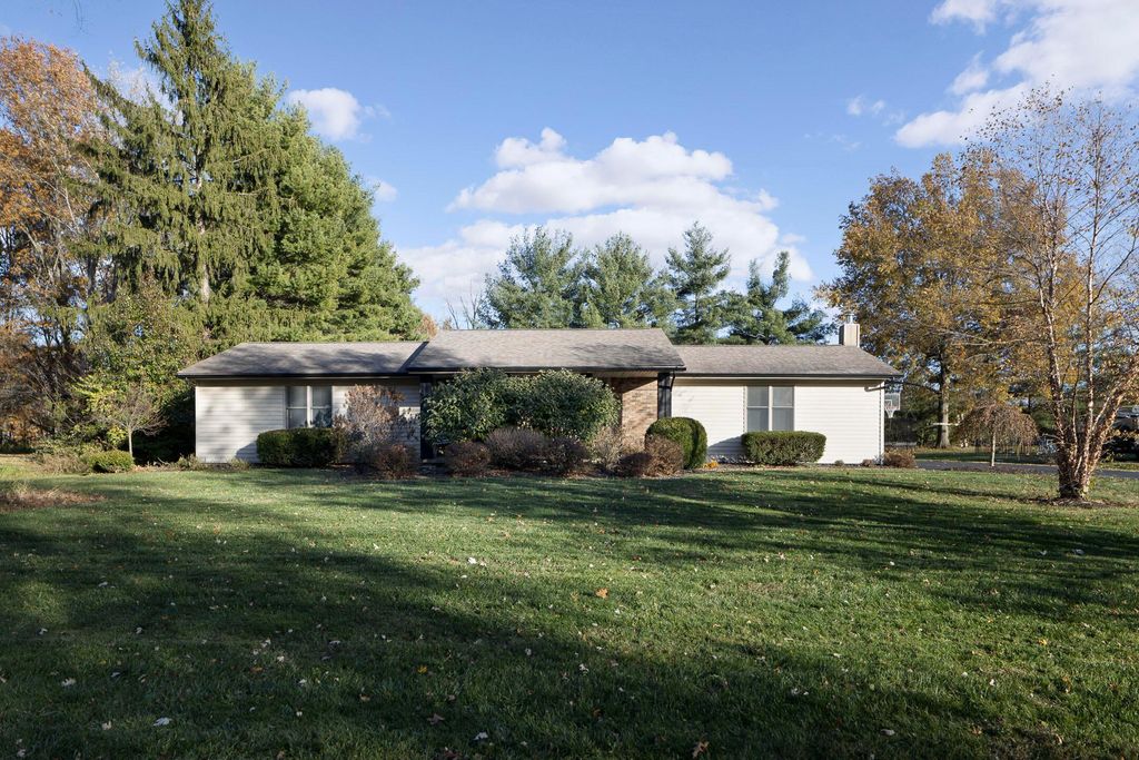 Located in the quiet Pine Meadow neighborhood and within New Albany Schools, this 3 bedroom, 3 bath ranch sits on a .61-acre, tree-lined lot with a large deck, offering plenty of space for outdoor living and entertaining. Inside, the open main floor features new wood floors and new carpet, a spacious living room with a wood burning fireplace, updated tile accent wall, and a warm wood feature surrounding the TV. The dining area connects to a remodeled kitchen with stainless steel appliances, a center island with bar seating, and abundant natural light. A coffee bar sits just off the dining space. The primary suite offers a sitting room, walk-in closet, ensuite bath with soaking tub and shower, dual vanity, and direct access to the deck. Two additional bedrooms complete the main level one with an ensuite bath, plus an additional full bath. The finished lower level adds a generous rec room with full bar, flex space, and utility room, providing even more room for everyday living.
