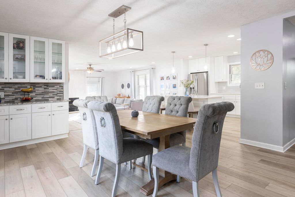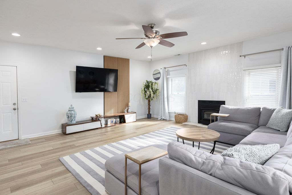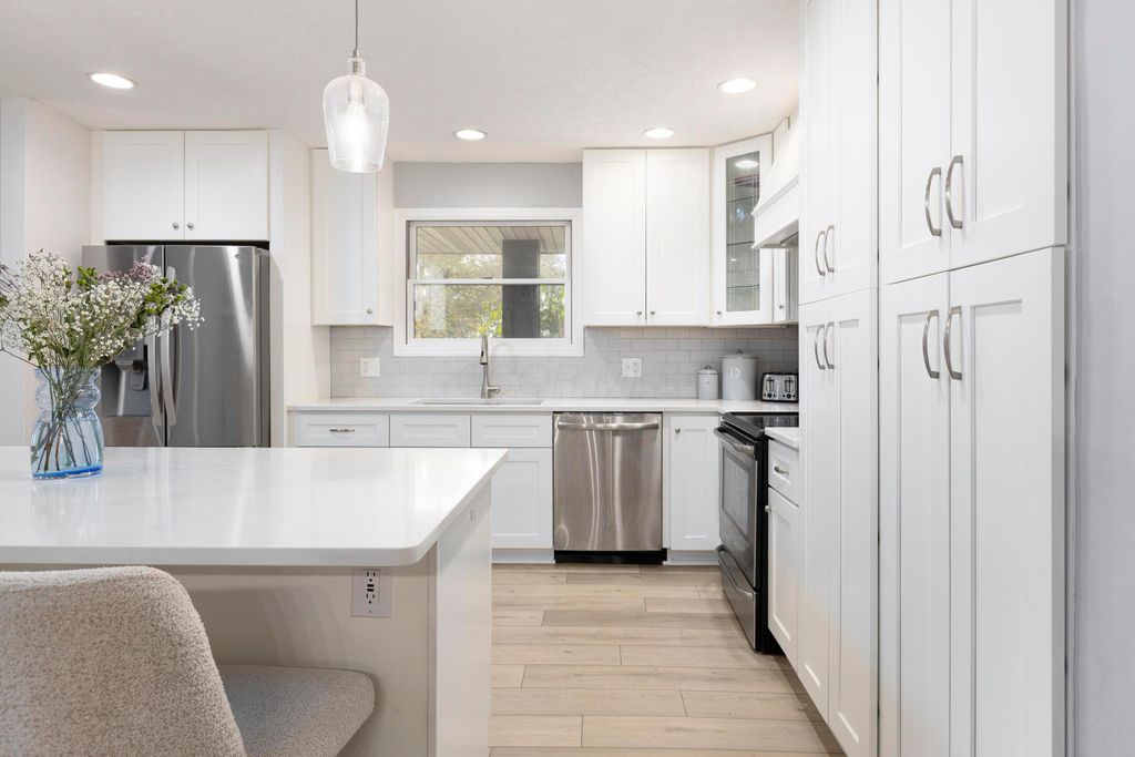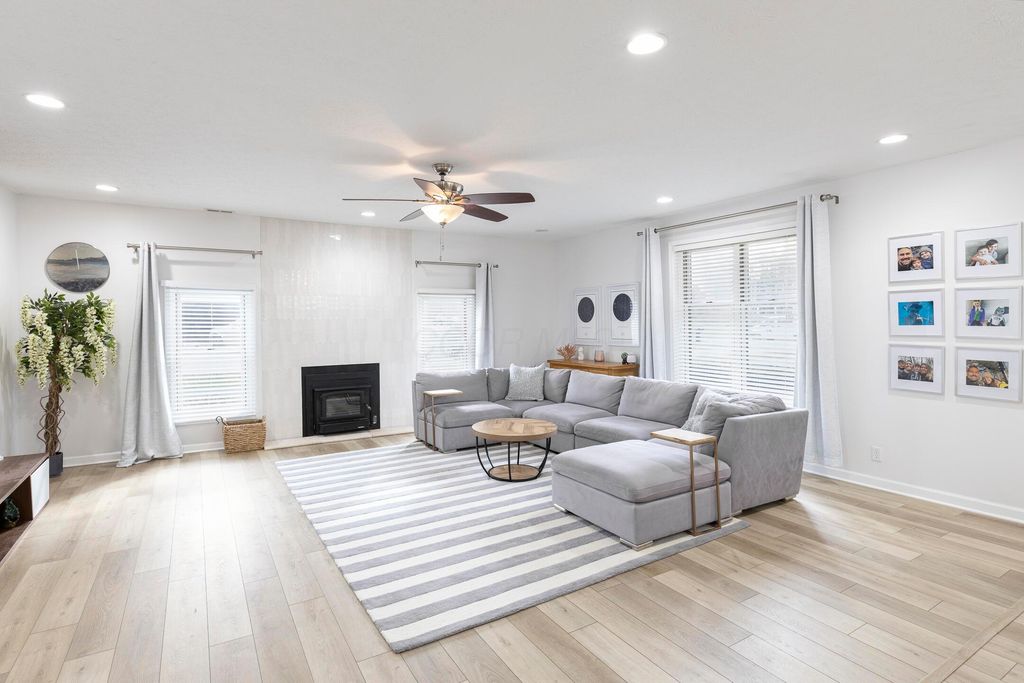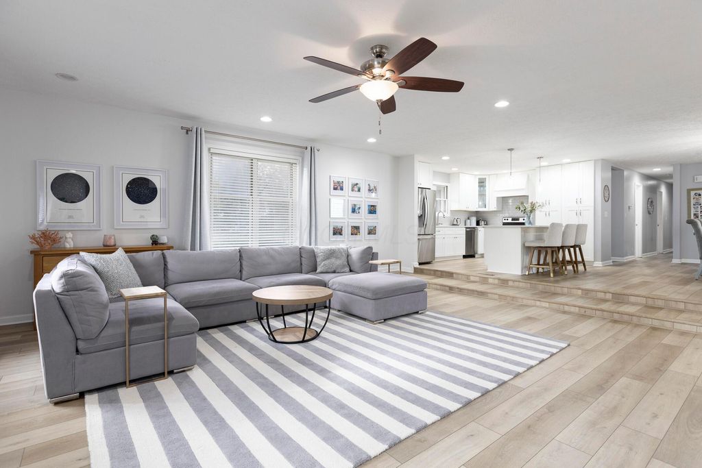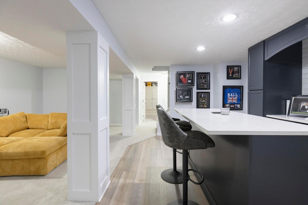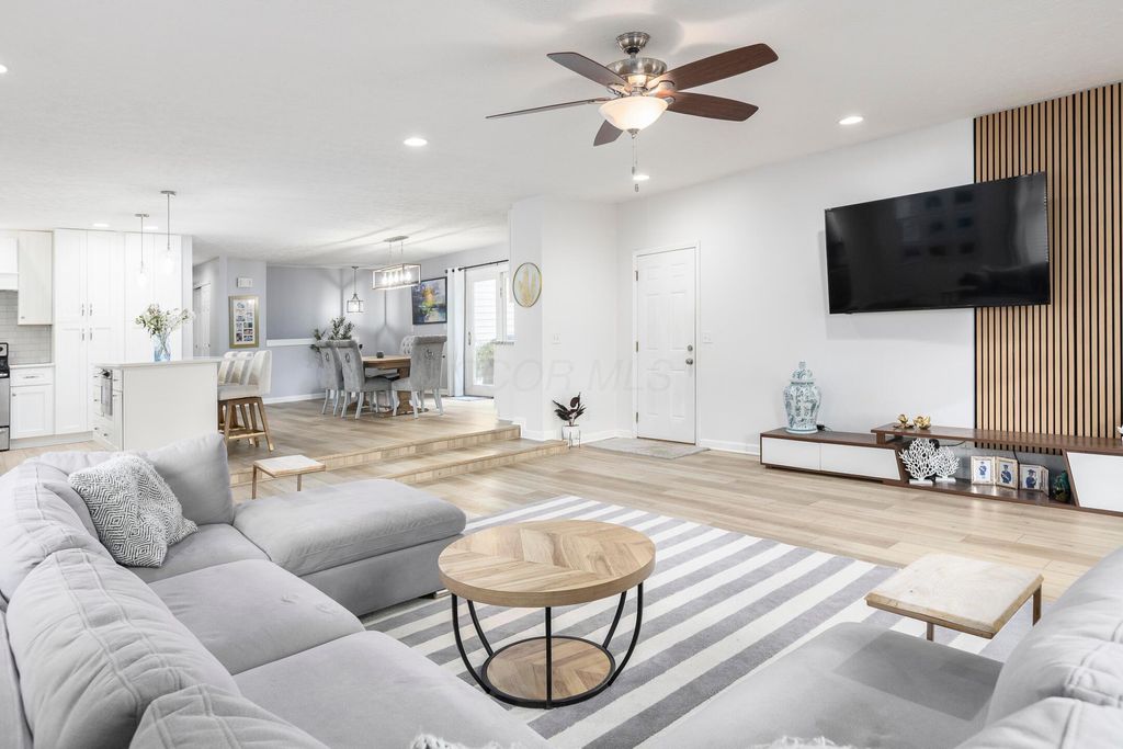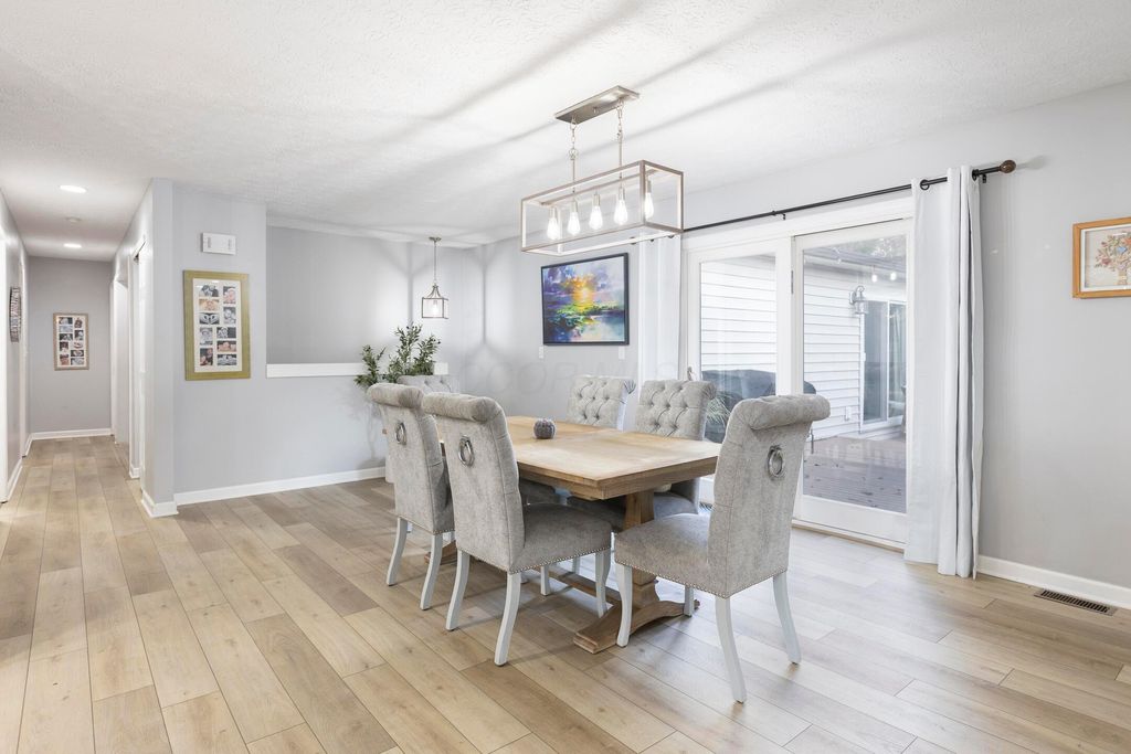 Located in the quiet Pine Meadow neighborhood and within New Albany Schools, this 3 bedroom, 3 bath ranch sits on a .61-acre, tree-lined lot with a large deck, offering plenty of space for outdoor living and entertaining. Inside, the open main floor features new wood floors and new carpet, a spacious living room with a wood burning fireplace, updated tile accent wall, and a warm wood feature surrounding the TV. The dining area connects to a remodeled kitchen with stainless steel appliances, a center island with bar seating, and abundant natural light. A coffee bar sits just off the dining space. The primary suite offers a sitting room, walk-in closet, ensuite bath with soaking tub and shower, dual vanity, and direct access to the deck. Two additional bedrooms complete the main level one with an ensuite bath, plus an additional full bath. The finished lower level adds a generous rec room with full bar, flex space, and utility room, providing even more room for everyday living.
