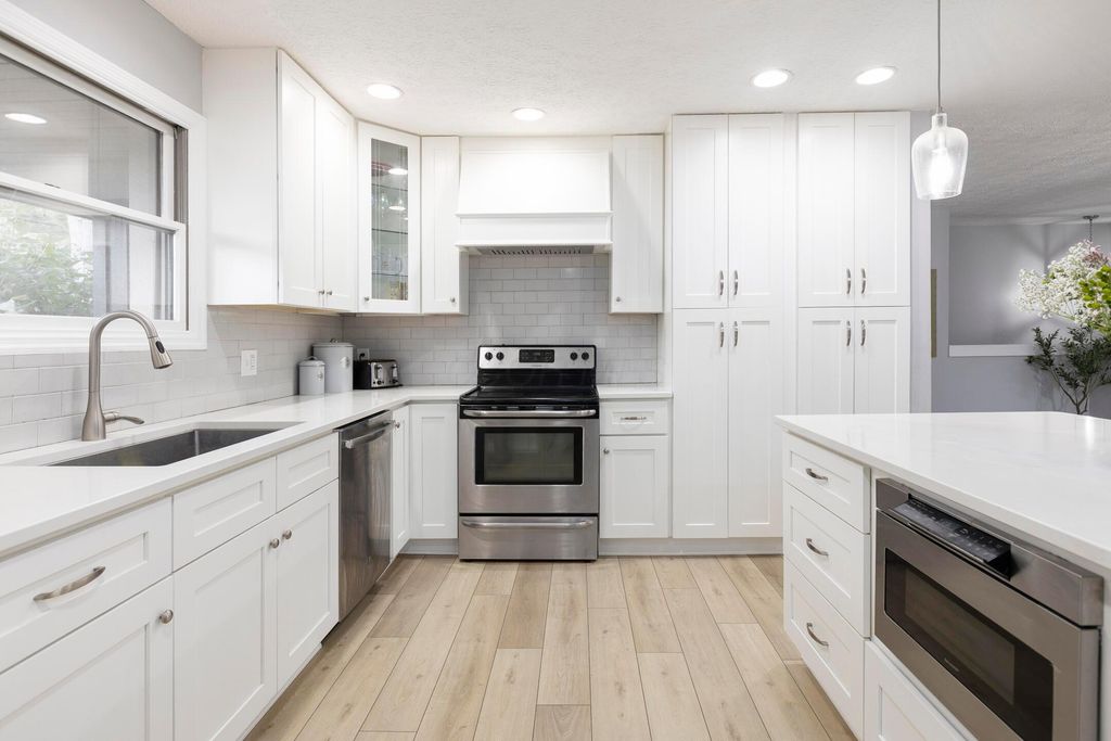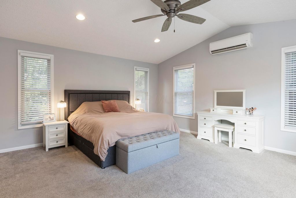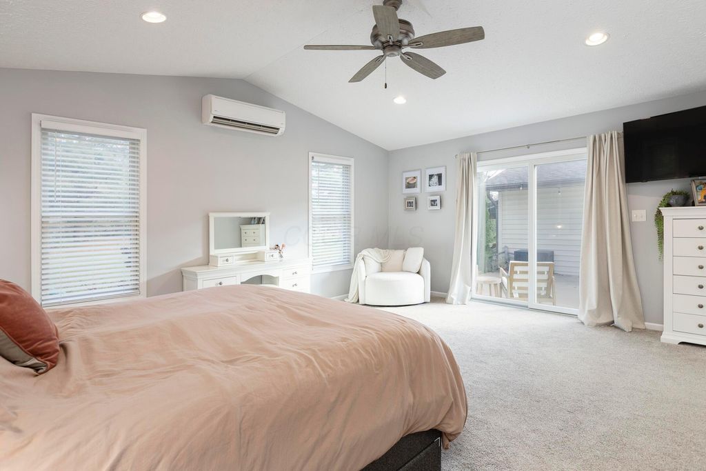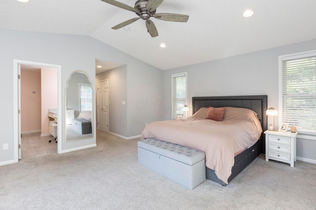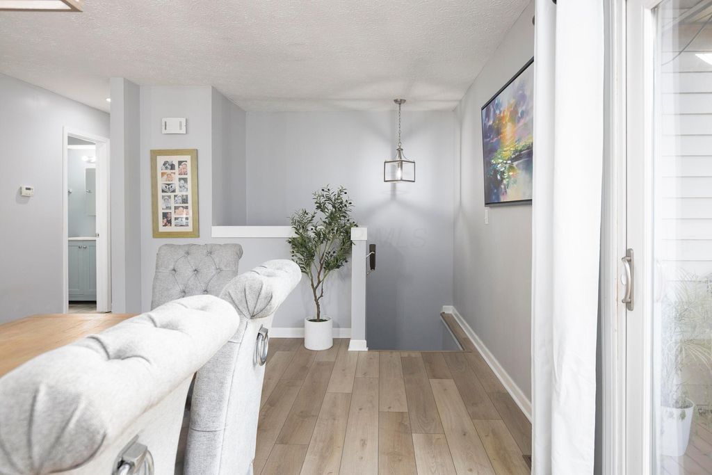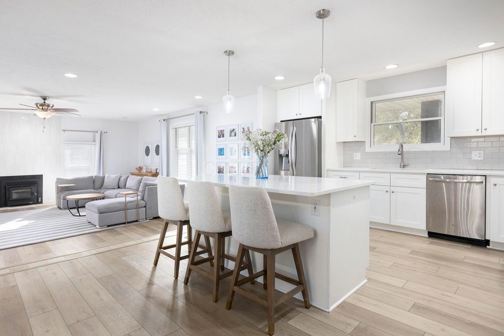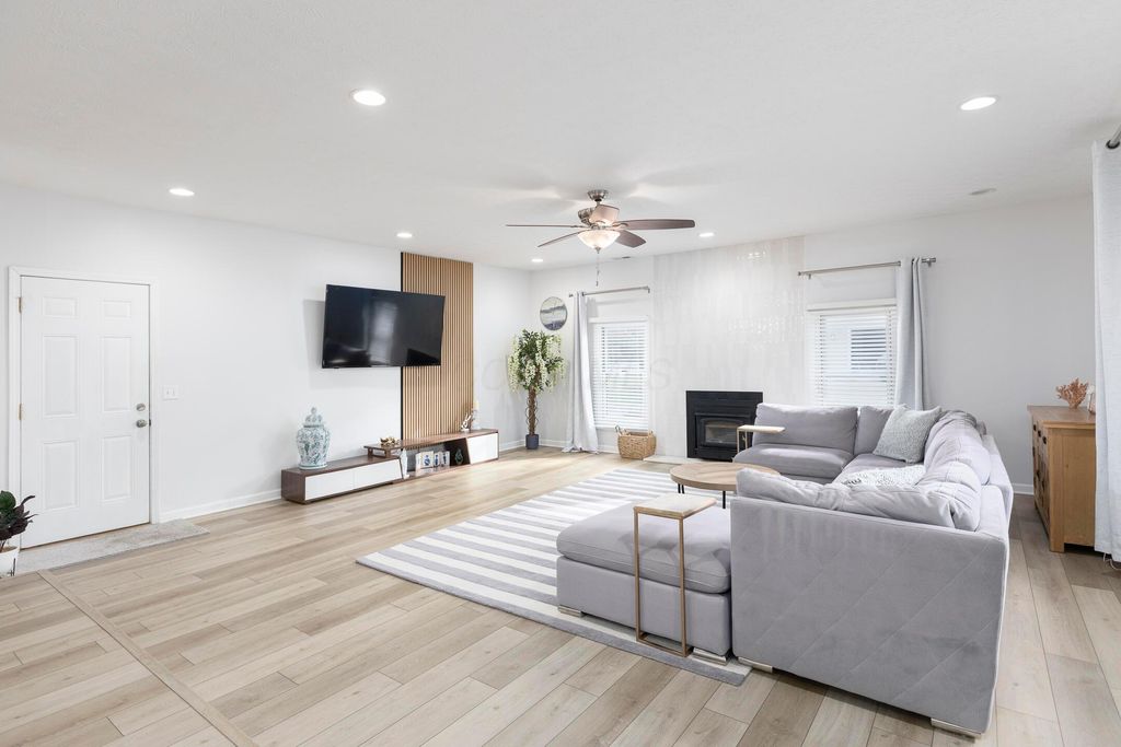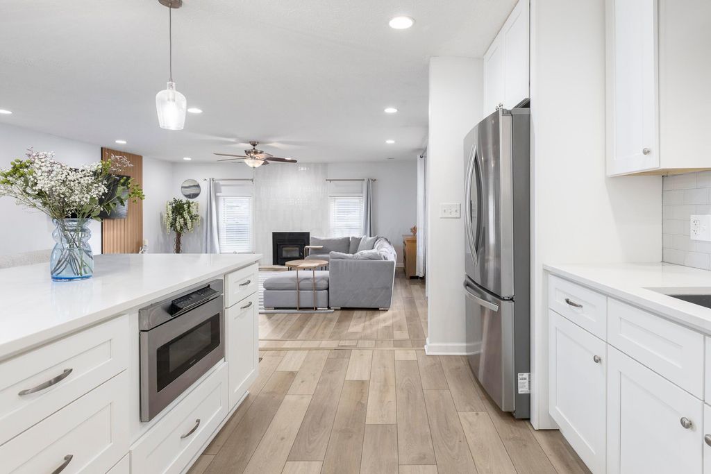Located in the quiet Pine Meadow neighborhood and within New Albany Schools, this 3 bedroom, 3 bath ranch sits on a .61-acre, tree-lined lot with a large deck, offering plenty of space for outdoor living and entertaining. Inside, the open main floor features new wood floors and new carpet, a spacious living room with a wood burning fireplace, updated tile accent wall, and a warm wood feature surrounding the TV. The dining area connects to a remodeled kitchen with stainless steel appliances, a center island with bar seating, and abundant natural light. A coffee bar sits just off the dining space. The primary suite offers a sitting room, walk-in closet, ensuite bath with soaking tub and shower, dual vanity, and direct access to the deck. Two additional bedrooms complete the main level one with an ensuite bath, plus an additional full bath. The finished lower level adds a generous rec room with full bar, flex space, and utility room, providing even more room for everyday living.