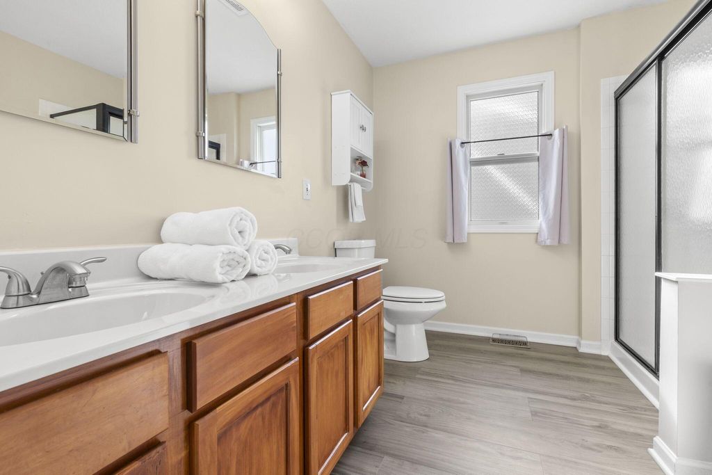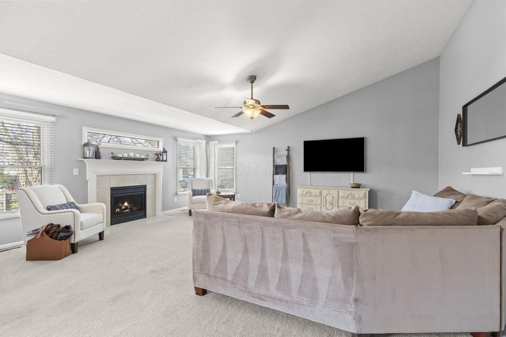 Welcome to this inviting 4-bedroom, 2.5-bath, 2-story home offering 2,288 square feet of comfortable living space in Sunbury Mills within the Big Walnut Local School District. Set on a .19-acre lot, the property features a welcoming front porch, a 2-car attached garage, and a spacious fenced backyard complete with a deck and storage shed. Inside, the main level includes a convenient first-floor laundry and a half bath enhanced by a sliding barn door. The well-appointed kitchen boasts a center island and stainless steel appliances, opening to a HUGE vaulted great room with a ceiling fan/light fixture and a gas fireplace, creating an airy and inviting gathering space. Upstairs, the vaulted owner's suite serves as a relaxing retreat with a ceiling fan/light fixture, soaking tub, separate shower, and 2 walk-in closets. Three additional bedrooms and a full bath complete the upper level, offering flexible space for a variety of needs. Recent updates include a new hot water tank in 2024 and a new sump pump in 2023. Convenient to shopping, restaurants, parks, schools, and all that Sunbury has to offer, this well-maintained home blends comfort, functionality, and an excellent location.
