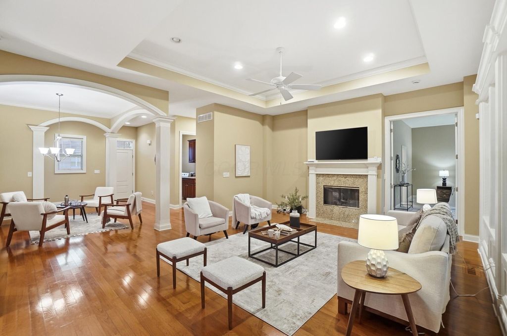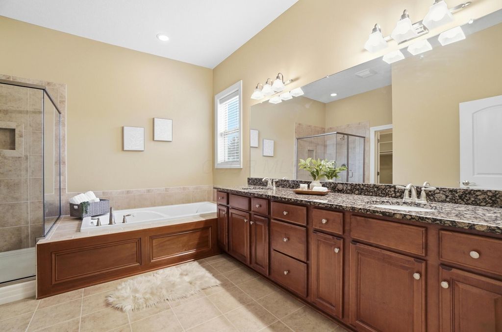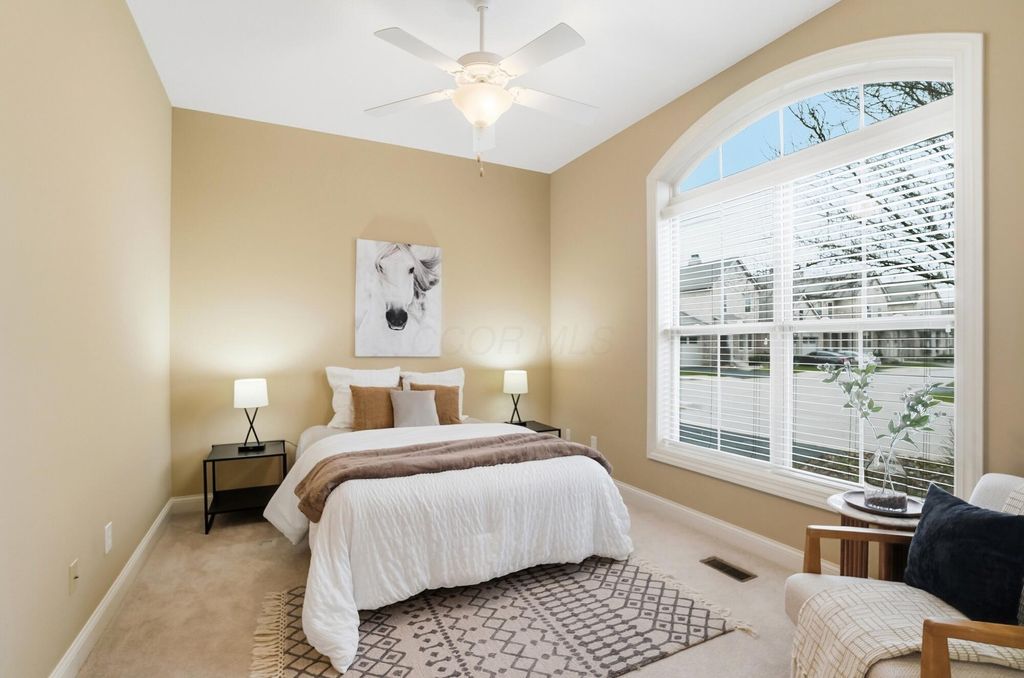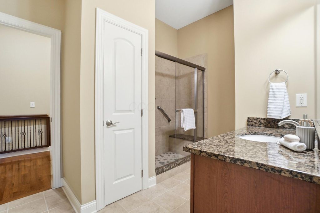 Welcome to this exceptional end-unit condo that perfectly balances elegance with practicality. This former model home showcases the superior craftsmanship that Romanelli and Hughes are renowned for, featuring thoughtful upgrades throughout that elevate everyday living. The heart of the home boasts custom maple cabinets paired with stunning granite countertops, creating a kitchen that's both beautiful and functional. Rich hardwood floors flow seamlessly through the foyer, great room, and kitchen areas, while newer carpeting adds warmth to the remaining spaces. The spacious primary suite opens directly to a delightful screened porch, offering a private retreat where morning coffee tastes even better. The primary bathroom pampers with a luxurious whirlpool tub, perfect for unwinding after long days. The basement truly sets this property apart, featuring a massive recreation room, dedicated office space, workout area, and full bathroom - essentially a second living area with endless possibilities. Additional unfinished space provides generous storage for life's necessities. Practical touches include a Generac whole house generator, ensuring comfort regardless of weather surprises. Privacy is afforded by this thoughtfully positioned end unit, while the meticulously maintained community offers resort-style amenities including a clubhouse, fitness facility, and sparkling pool. The location provides convenient access to Powell's charming downtown restaurants and shopping, combining suburban tranquility with urban convenience. This two-bedroom, two-bathroom home represents quality construction, thoughtful design, and move-in readiness - a rare combination that transforms houses into homes and creates the foundation for countless future memories.