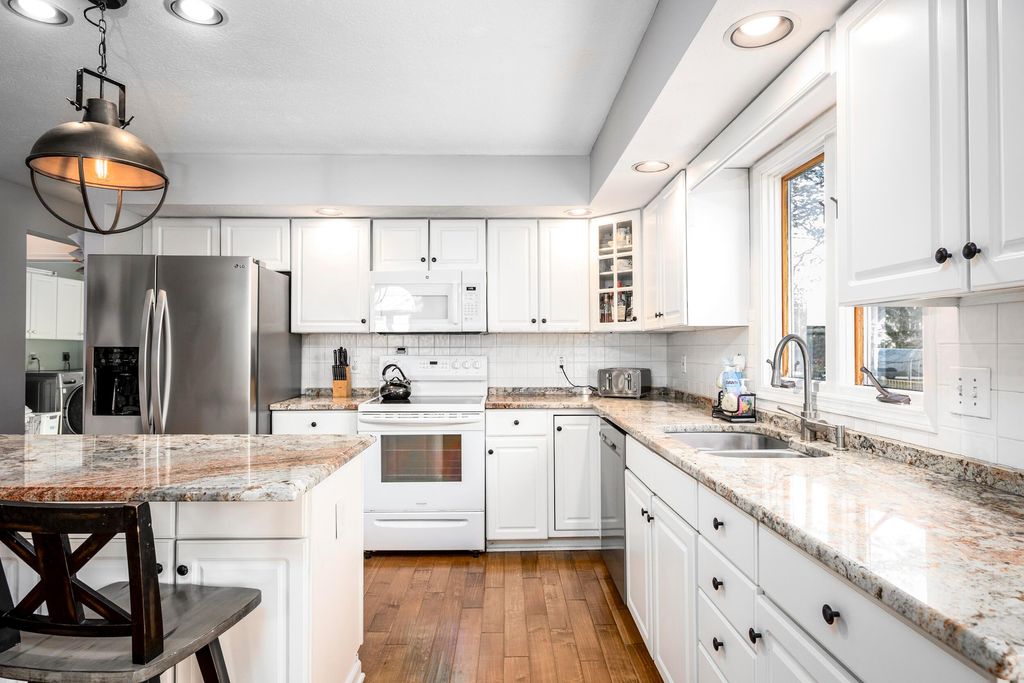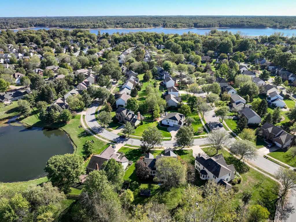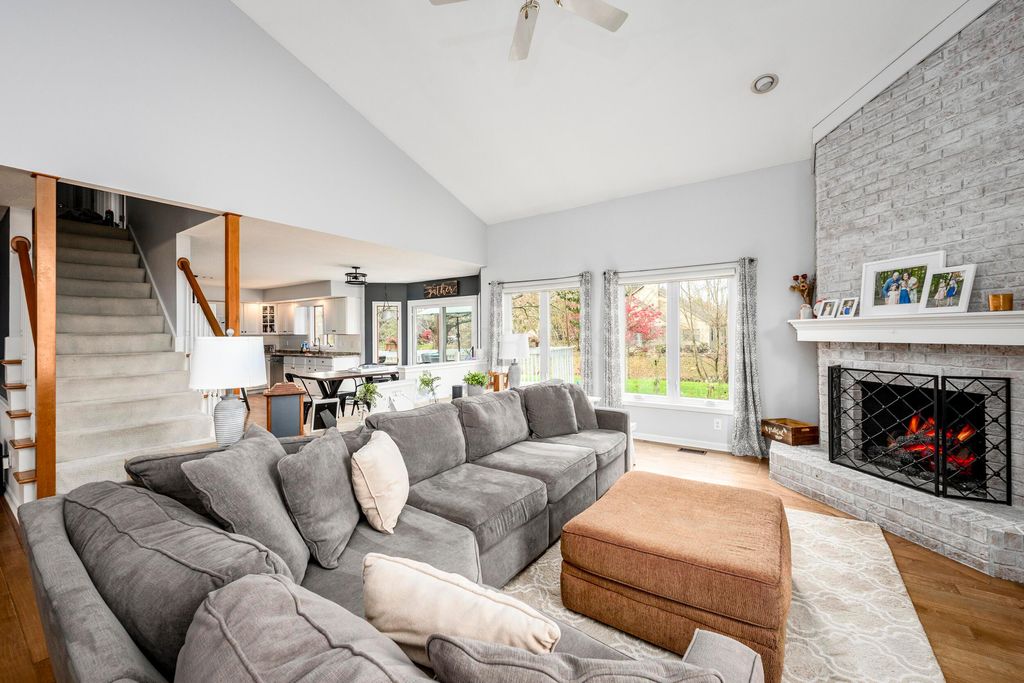 This attractive stone-front home in Mariner's Cove is in one of Westerville's most desirable neighborhoods that hosts a variety of family-friendly gatherings, such as summer family movie nights, food trucks, and holiday horse-drawn carriage rides! The first floor open floor plan with vaulted great room creates a bright and airy atmosphere. The main living area with its hardwood flooring and brick gas log fireplace flows into the kitchen with spacious eating area, white cabinets, an island, and granite counters. For ultimate flexibility, the main level includes a formal dining room, private den, a guest bedroom, a full bath (perfect for guests or an in-law suite), and a first-floor laundry room. The second floor offers a good-sized owner's bedroom with a spacious en-suite bath and large walk-in closet as well as two secondary bedrooms and the home's third full bath. The huge full basement, currently used as a TV/movie room, a kids' play area, and exercise area, still has ample space for hobbies, workshops, storage, etc. Owners have freshly painted the interior, basement, and deck; upgraded the gas fireplace (2021); replaced windows in the great room and den (2023); and installed a new sliding glass door (2023). The outdoor deck overlooks a nature-lover's paradise with a peaceful stream that attracts regular visits from migratory birds, deer, ducks, and other wildlife. Located steps from a community pond perfect for fishing in summer and ice skating in winter. Conveniently located less than a 5-minute drive away from Robert Frost Elementary, Heritage Middle, and Westerville North High Schools and perfectly situated to take advantage of the recreational activities of hiking, boating, and fishing opportunities at nearby Hoover Reservoir. Don't miss this opportunity to become part of a community with little turnover and call this wonderful place ''home.''