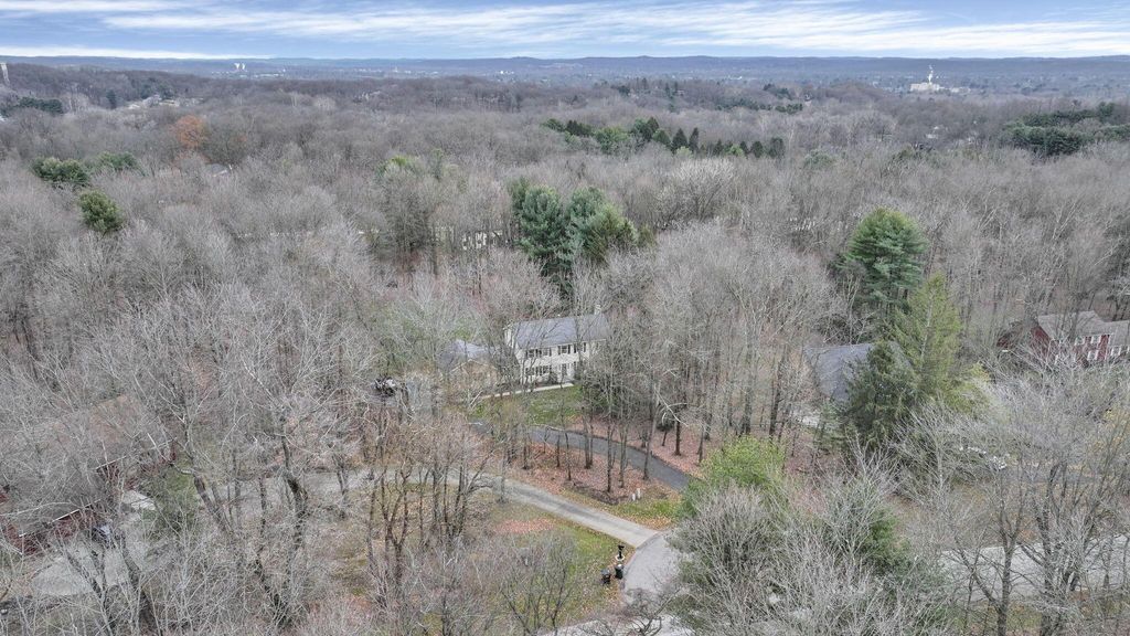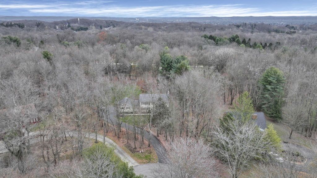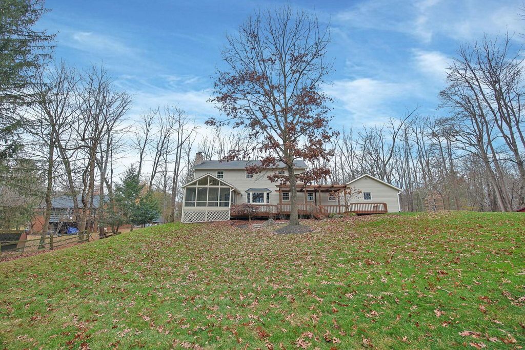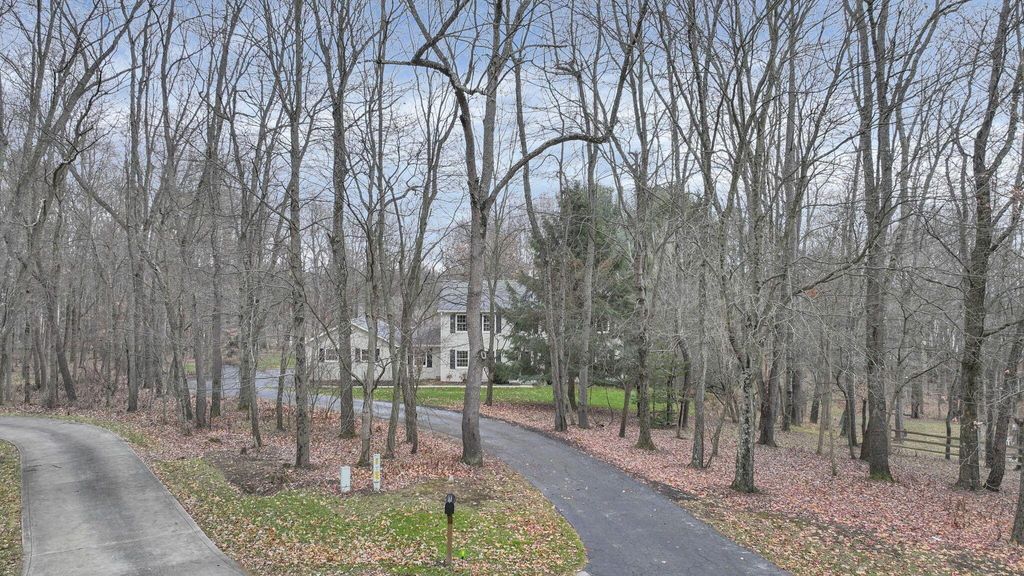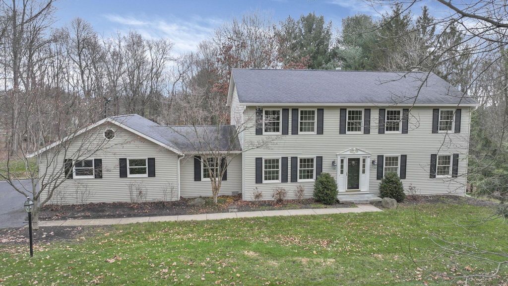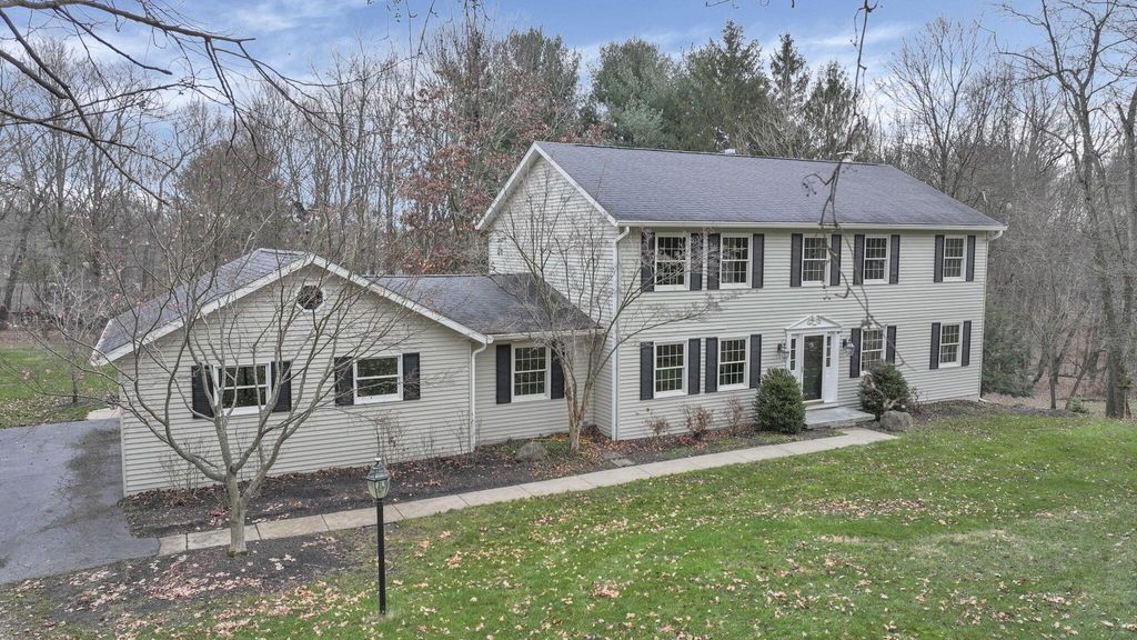 Step inside this warm and inviting quality built home featuring spacious rooms, generous windows showcasing scenic views, neutral colors, lovely hardwood floors, and exceptional outdoor living. The family room offers a cozy wood-burning fireplace and French doors that open to the vaulted three-season room overlooking the picturesque private yard. A large front living room and spacious dining room provide wonderful spaces for gatherings. The well-appointed, nicely updated kitchen features a center island, double oven, and stainless-steel appliances, and opens to a bright eating area. A first-floor den with a built-in desk (ideal for a home office or possible bedroom) and an adjacent laundry room & half bath add everyday convenience. Additional updates include a new deck, newer roof, and HVAC. Upstairs, you'll find four bedrooms, including a primary en-suite with a spacious walk-in closet, an additional full bath, and abundant storage. The nicely finished lower level offers flexible living space along with an unfinished area for additional storage. Enjoy outdoor living on an expansive deck with a pergola overlooking beautiful, mature trees. This property boasts a gorgeous setting on a 2.08-acre cul-de-sac lot, offering privacy and serenity. An oversized 2+ car garage completes this wonderful 2-story home.