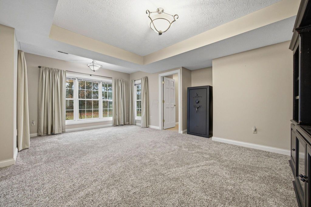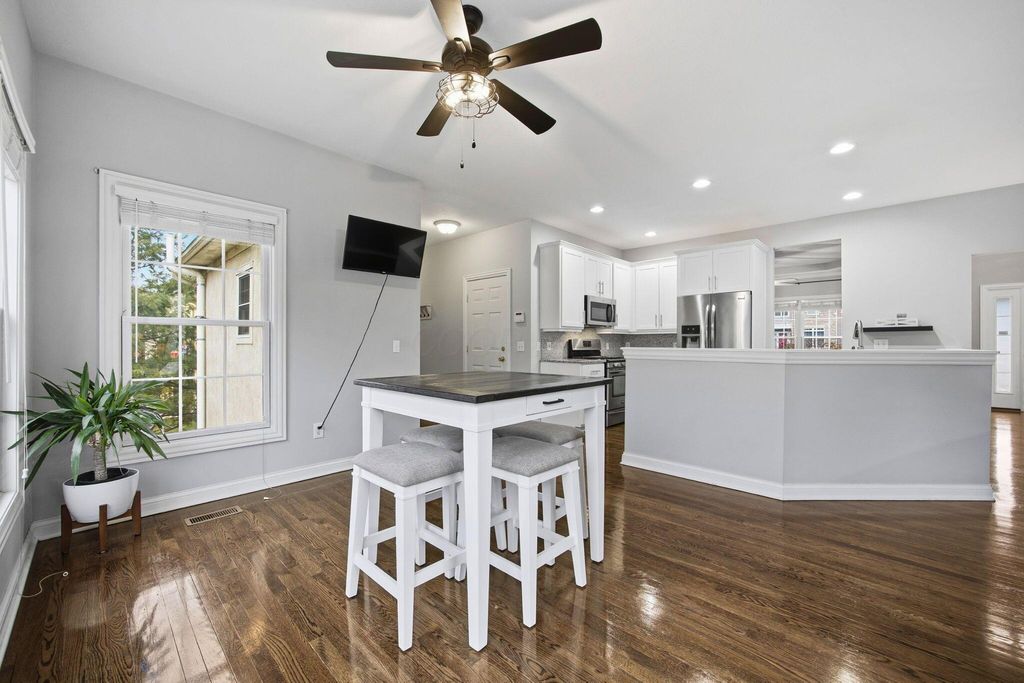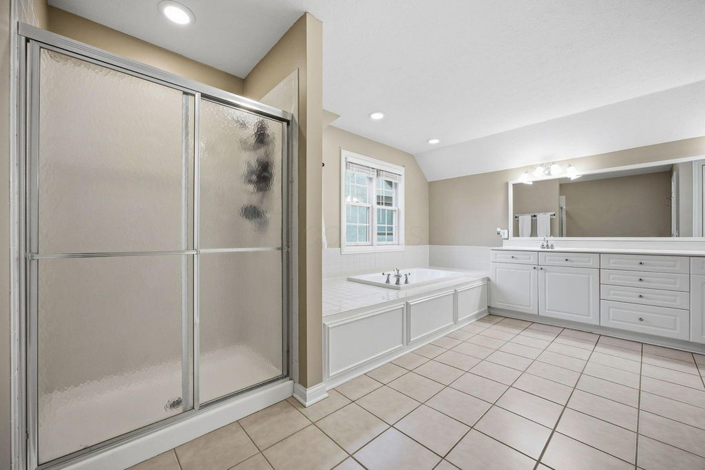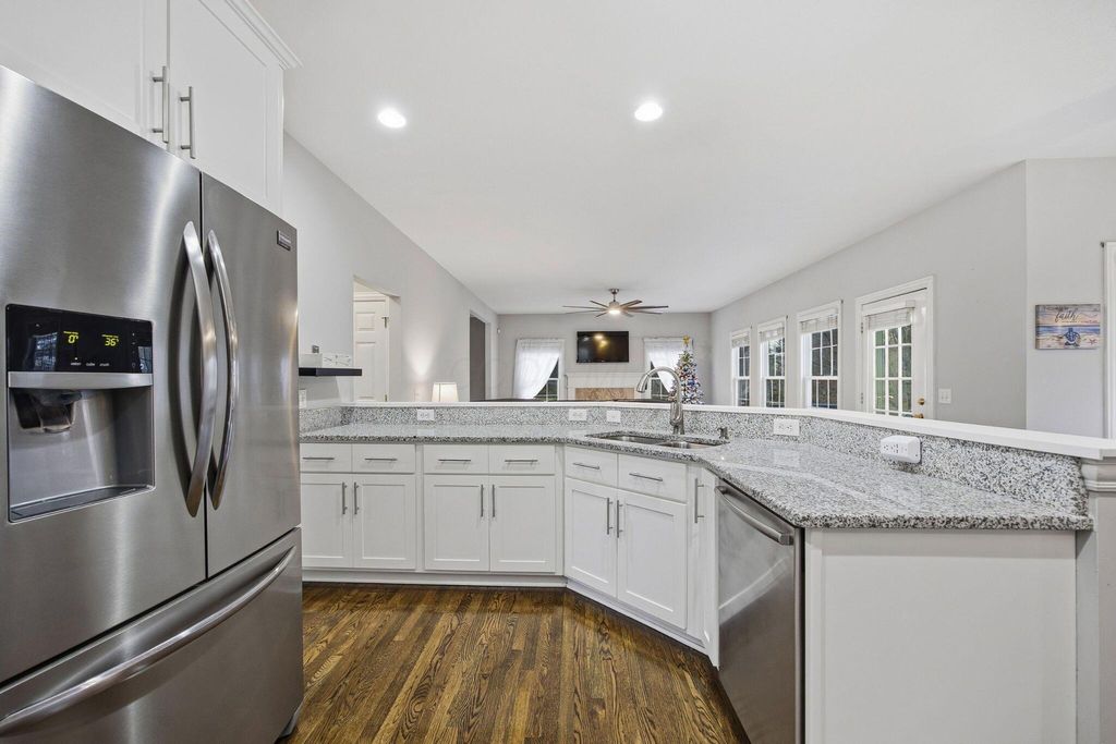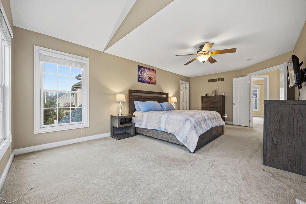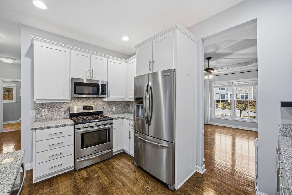 An entertainer's dream home featuring a corner lot with both wooded and fountain views. This more than 4,000 square foot home opens to a soaring entry way, dining room, second living room/office space, as well as a chef's dream kitchen with granite counters and backsplash, stainless steel appliances, including a gas range, two pantries, and beautiful hardwood floors, as well as first floor laundry and half-bath. The main open living room has a beautiful fireplace with a door leading out to the recently refreshed and painted three-tier deck. The upstairs boasts three spacious bedrooms with a jack and jill bath, walk-in linen closet, and a spacious primary suite with a bump out great for reading or lounging, an oversized bath with two walk-in closets, a linen closet, dual vanity, shower, and jetted soaking tub. The finished lower level is an multi-generational suite with a full bath and massive flex area with a walk-out to the private paver patio with lush landscaping. New roof, water heater, and radon mitigation system. Close to shopping, dining, and schools.