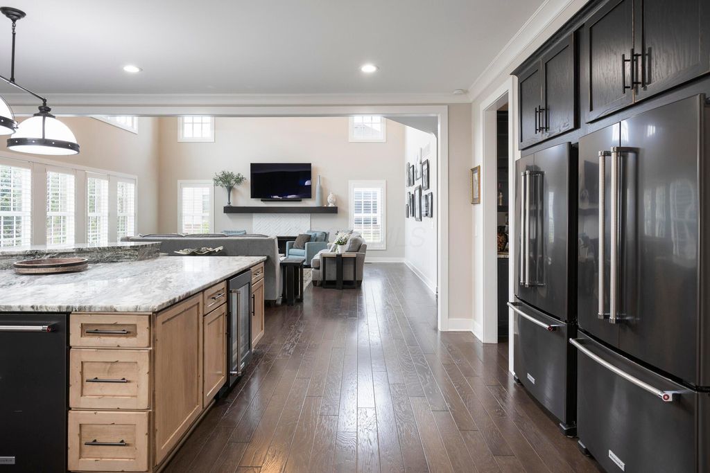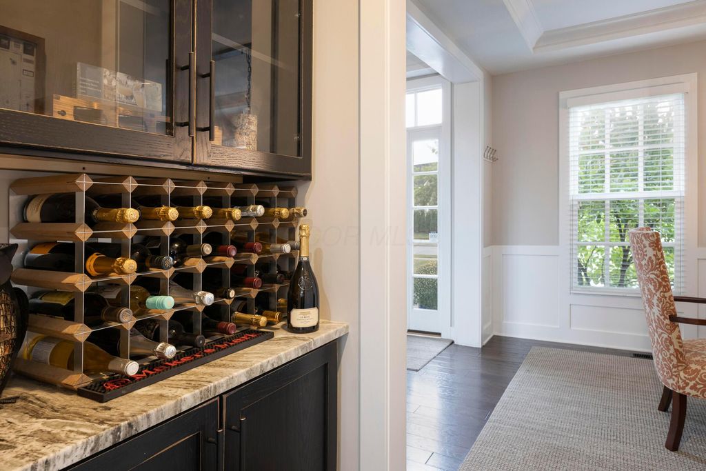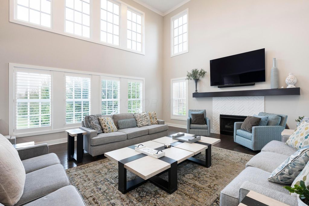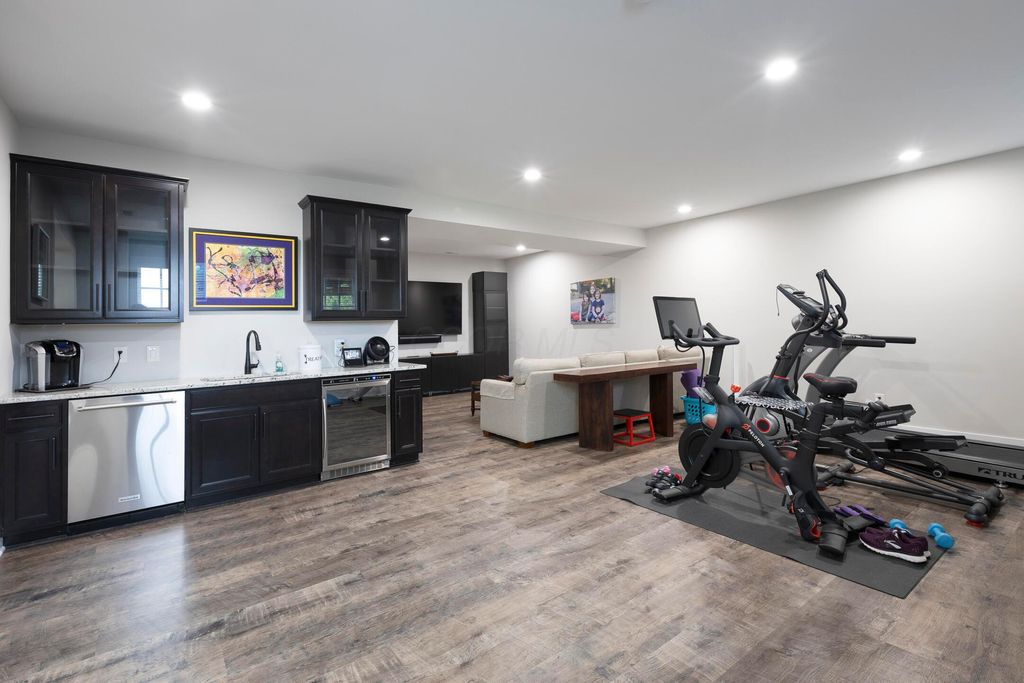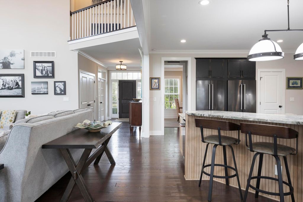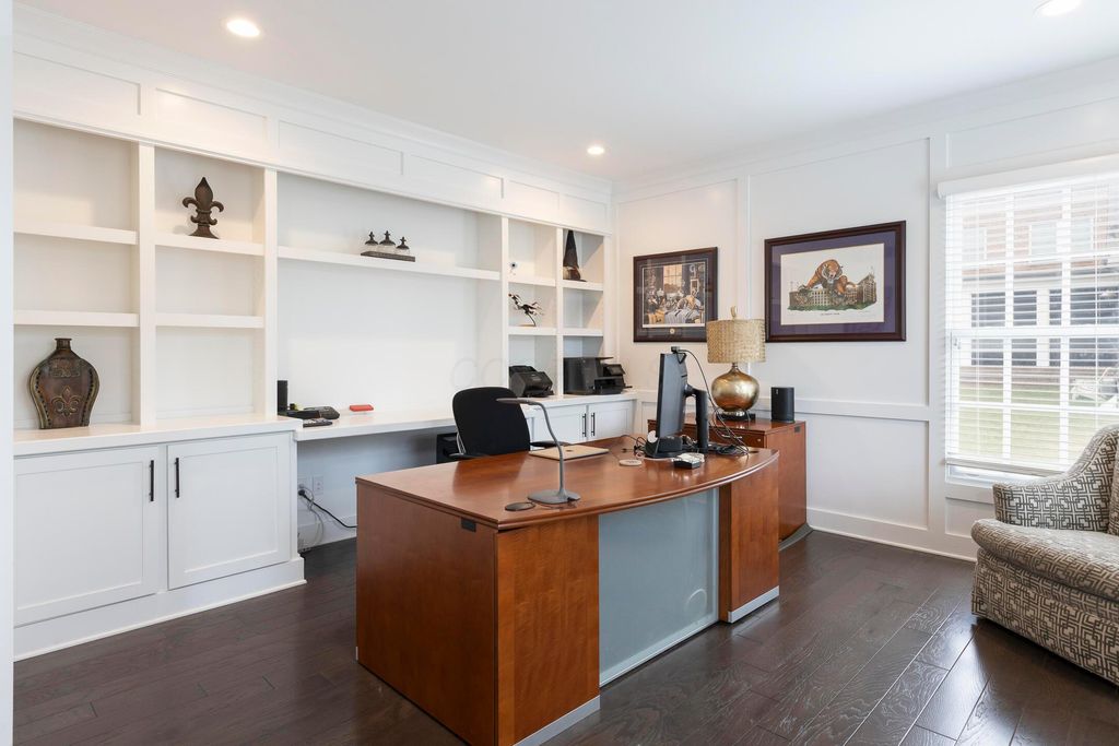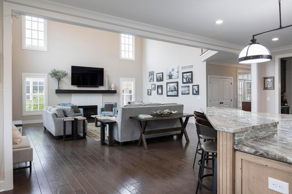 This magnificent five-level split offers a rare and refined floor plan in the New Albany Country Club community. A soaring two-story great room anchors the main level and flows seamlessly into a gourmet kitchen featuring new titanium black appliances, custom cabinetry, and an adjacent custom workspace perfect for managing household tasks. A dedicated first-floor office provides privacy for remote work, while a nearby flex room offers versatility for formal dining or play. The oversized mudroom off the garage impresses with custom cabinetry, multiple closets, and smart storage throughout. On the first level up, you will find the primary suite with dual walk-in closets and a spa-inspired bath. Just above, three generously sized bedrooms include one with a private en-suite and two that share a Jack-and-Jill bath and a convenient second-floor laundry room. One level down from the main, a spacious bonus room with bar provides flexible space for exercise, media, or play. The finished lower level is designed for entertaining, with a large recreation area and a full bedroom with en-suite bath and private access, ideal for guests or multi-generational living. Step outside to enjoy the covered patio, designed for year-round use with a built-in fireplace and custom grilling and smoking station. The fully fenced yard offers added privacy and peace of mind for outdoor living. With rich hardwood floors, designer tile, and premium finishes throughout, this home delivers exceptional style, comfort, and convenience, just steps from a neighborhood park and play area.