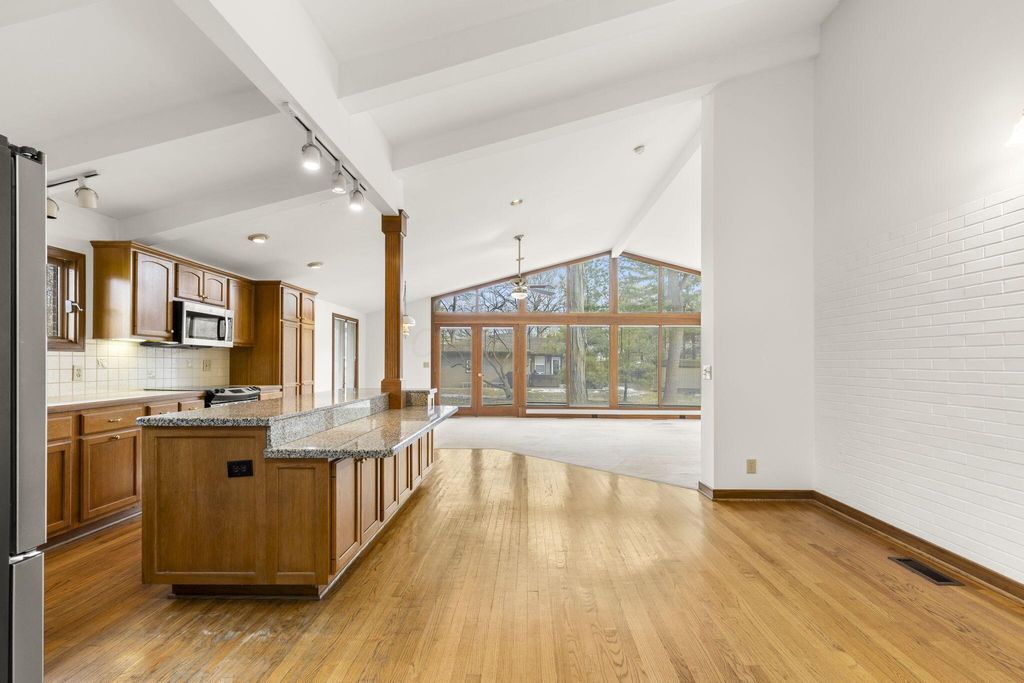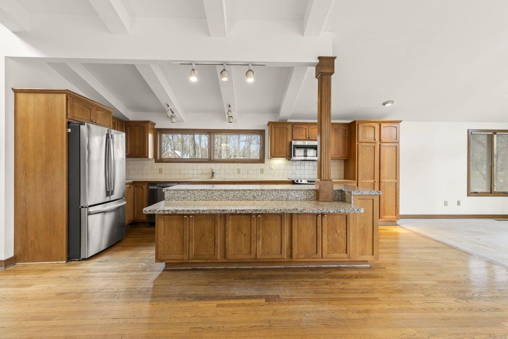 Dream Home Alert! Your wait for your dream home in Brookside Estates is finally over! Nestled in what many regard as the most sought-after section of Brookside Estates, this stunning, over 3200 sq. ft. home, sits on a generous 0.6-acre lot--perfect for entertaining and/or nature lovers The spacious first floor features a true open-concept design that seamlessly connects the family room, kitchen, and expansive great room. The family room features a floor-to-ceiling brick fireplace, exposed ceiling beams, and real hardwood floors. The central kitchen boasts a granite island w/ breakfast bar, solid wood cabinets, modern stainless steel appliances, and an elegant tiled backsplash. The oversized great room is highlighted by soaring vaulted ceilings and it's wall of windows that showcases the serene wooded backdrop. Enjoy flexible living options with 3-4 bedrooms. The luxurious two-room owner's suite features vaulted ceilings, walk-in closet, and en-suite bath. The two bedrooms on the second floor share a second full bath with soaking tub, and then the possible 4th bedroom could be a true in-law/teen/2nd owner's suite with it's own entrance and attached full bath. The walk-out level opens to a sunken patio and an additional large ground-level concrete patio--perfect for outdoor entertaining. The sizeable 4-car attached garage has both front and side entries making it ideal for several vehicles and your golf cart(s), riding mower, and/or other toys. All of this and located in acclaimed Worthington Schools! Don't miss this exceptional opportunity!