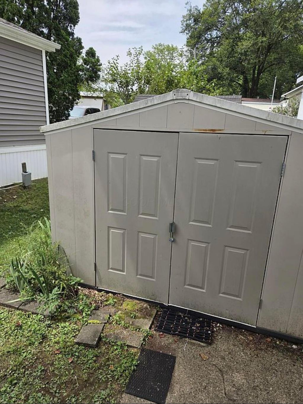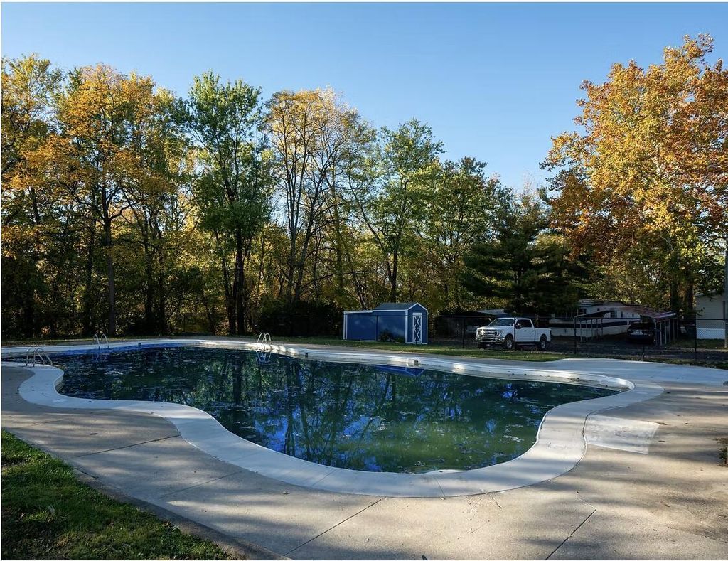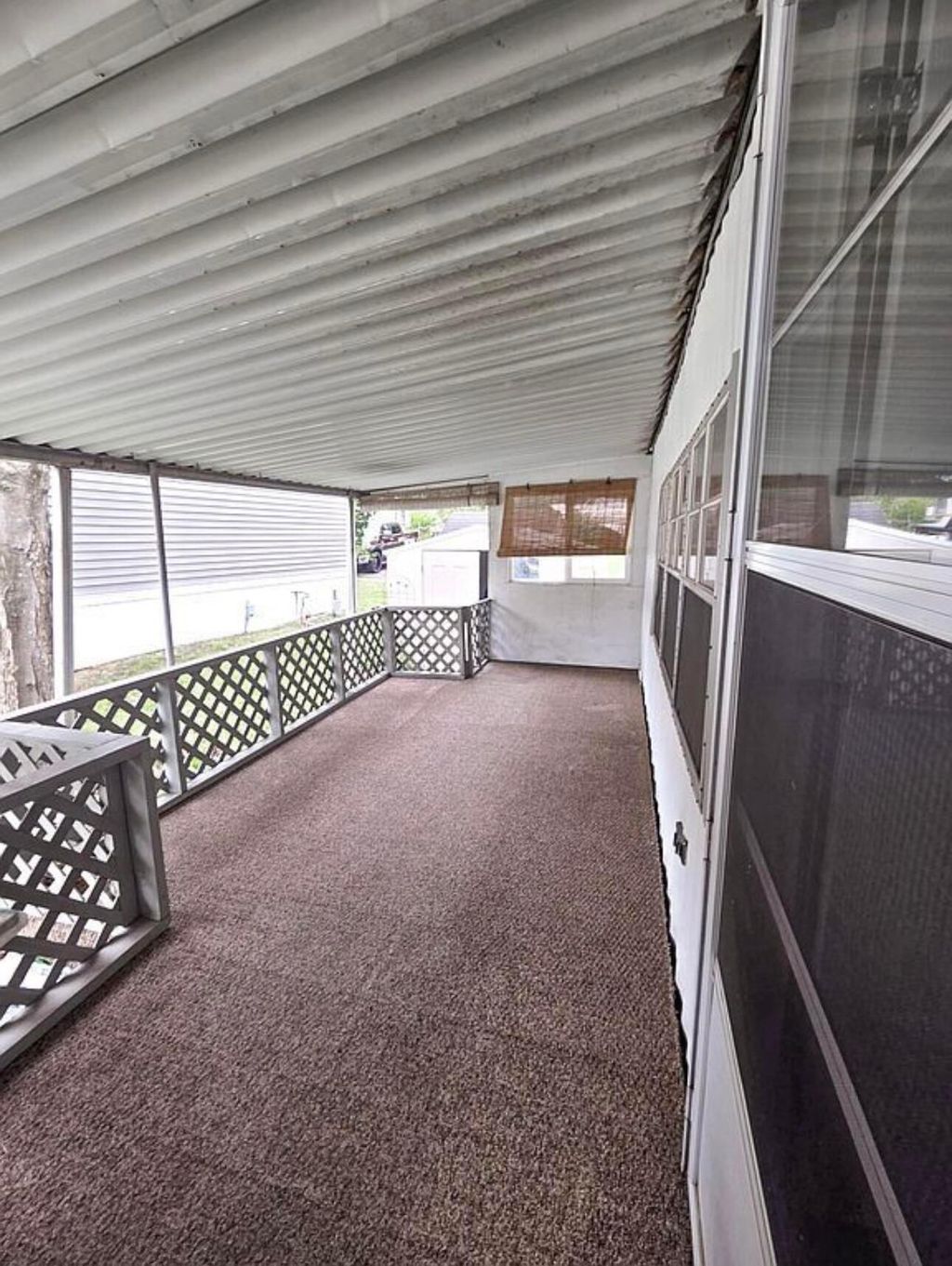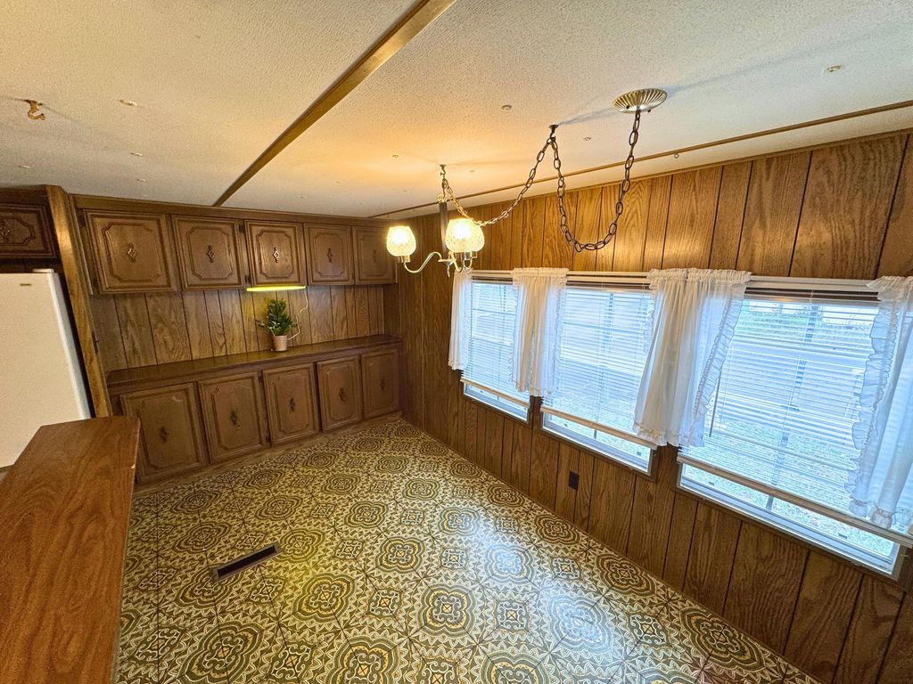 One-owner 1973 Magna mobile home (65' x 14', approx. 910 sq ft) in well-maintained condition with excellent storage throughout. Home offers 2 bedrooms and 1 updated full bathroom with walk-in shower and laundry nook. Primary bedroom features built-in shelving and TV stand. Second bedroom (approx. 9'7'' x 7'', excluding closet wall) includes built-in drawers, shelving, and closet. Living room has windows on both sides of the home for natural light. Additional features include double-pane storm-insulated windows, bar area with extra sink, and original owner manuals and maintenance records. Exterior includes covered front porch with two staircases and gates, two storage sheds, storage under porch with hinged access, and two-car driveway. True Character Upgrade - the community pool!