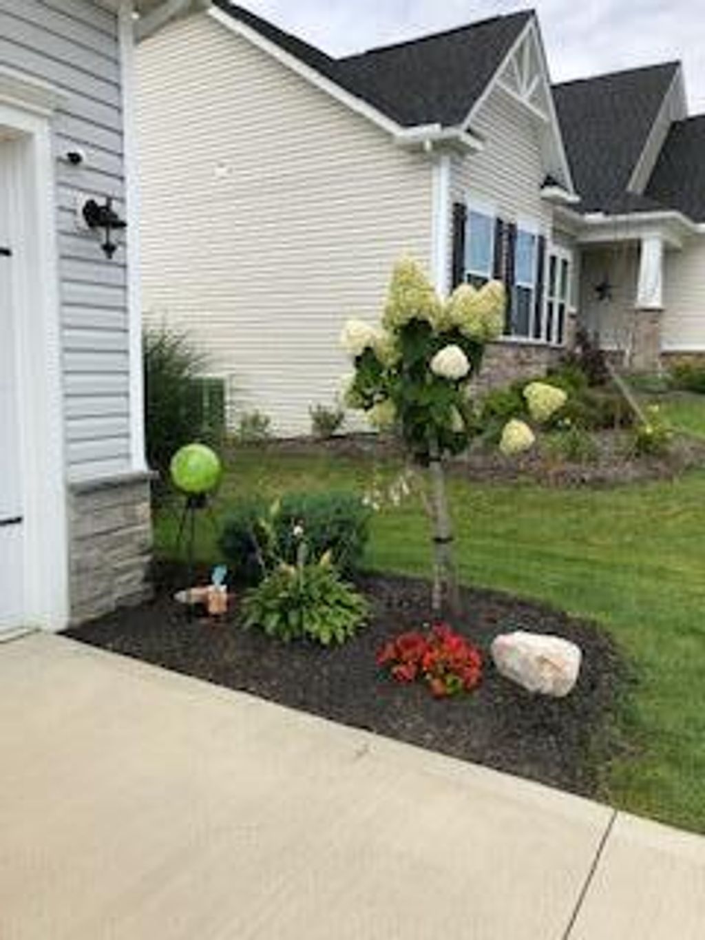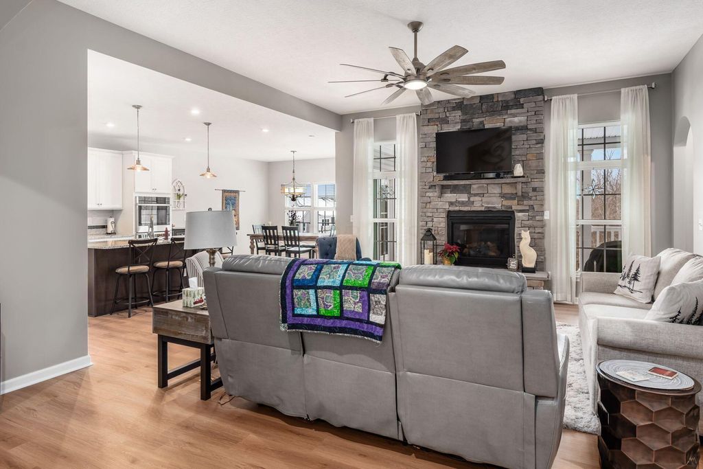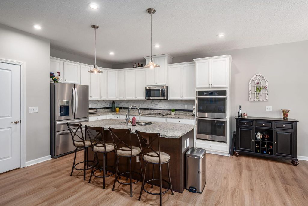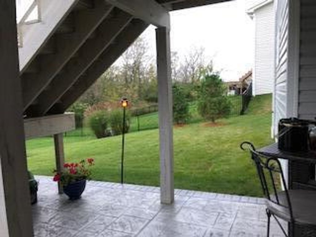 Stunning, like-new ''Carolina'' ranch floor plan in desirable Terra Alta, located on premium, treed lot has a finished, walk-out lower level. Total is over 2500 SF in upgraded living space. Stone & low-maintenance vinyl exterior, beautifully landscaped, 3-car insulated & dry-walled garage w/epoxy floor. Enter to welcoming foyer w/upgraded, wood-look LVP flooring throughout. Upgrades include 9' ceilings, 2'' custom blinds on the windows, newer flooring, white doors w/brushed silver ''lever'' hardware. Den/DR flex living space has French door entry & lighted ceiling fan.LG,Open Great Room has 10' ceilings, flr to ceiling stone fireplace - gas flame heats the whole room. Upgraded lighted ceiling fan. Luxury kitchen features spacious granite island eating bar, 42'' white cabinets, tile backsplash, pendant lighting over the island, Stainless steel appliances including electric smooth top range, Double oven, built in microwave, and refrigerator (negotiable.) Casual sun-filled eat-in area opens to covered deck overlooks wooded .32 acre lot & stamped concrete patio w/designer wall. Guest BR has large closet, lighted ceiling fan and adjacent bath with upgraded lighting and mirror, tub/shower combination. Owner's suite features tray ceiling w/ crown molding, '''his'' closet, luxury bath with dual sinks, extra large shower, walk-in closet with additional shelving. Main floor laundry with cabinets. Finished lower level features upgraded newer carpet, BR w/generous closet space, egress window, recreation room, & third full bath. Spacious unfinished area for storage or additional finished living space. Sliding glass door opens to patio and rear lot. very large closet at the back of the recreation room, as well as the bedroom large closet and other unfinished areas for storage Over $50,000 in after-market upgrades in this spectacular home.
