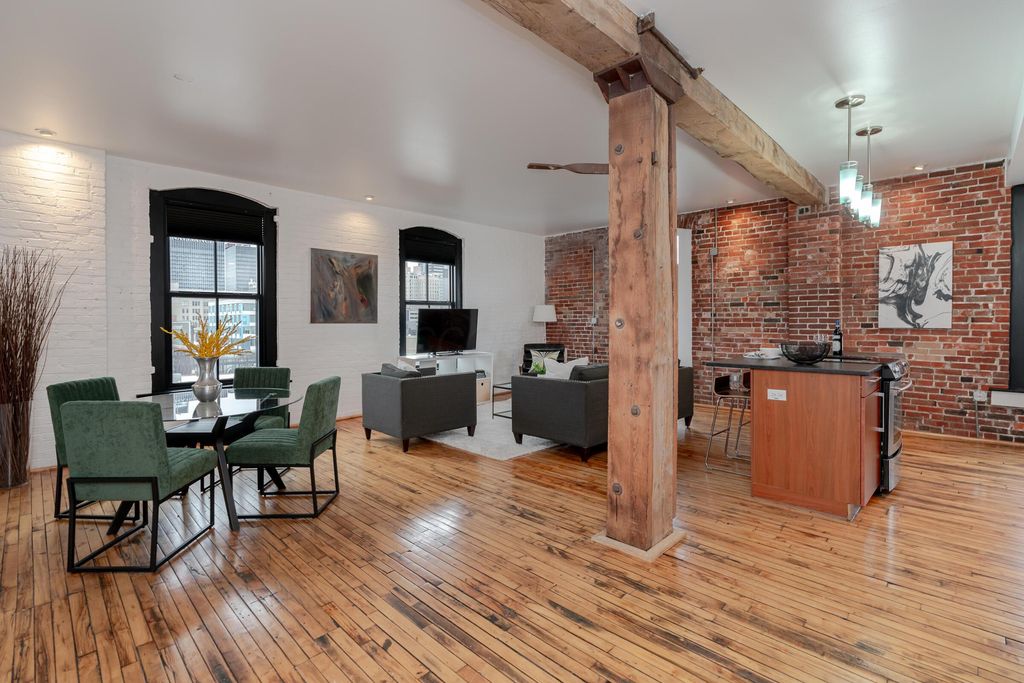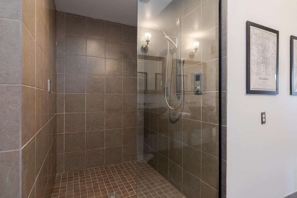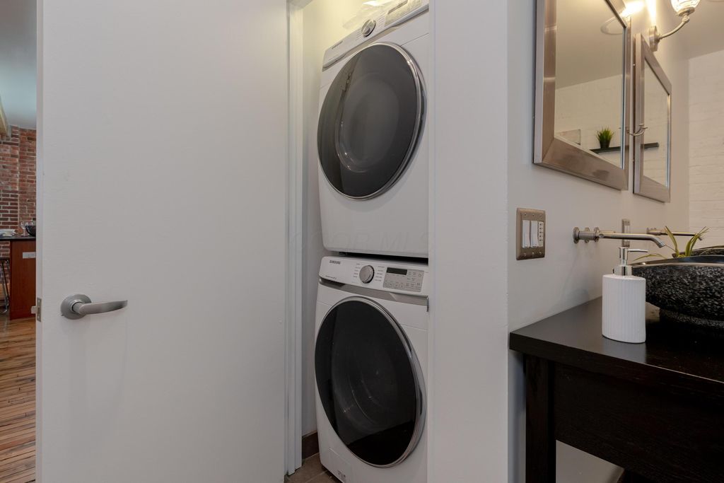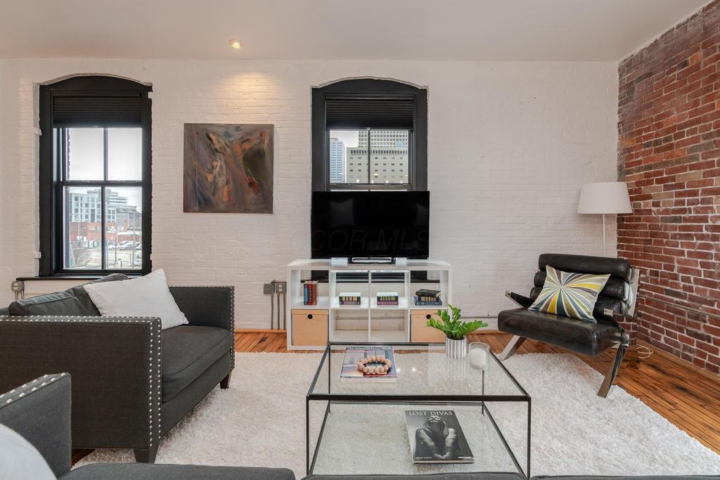 This urban condo is not your typical downtown drywall box. Originally a shoe factory, this iconic building was reimagined in 2006 into a boutique loft community that blends historic character with modern design. This southwest-facing condo is located in the original building and delivers a true urban-loft vibe with reclaimed hickory floors, exposed brick, post-and-beam construction, and soaring ceilings. Sunlight pours in from every angle, with skyline views from nearly every room and a private balcony to take it all in. The oversized one-bedroom layout features an open, flexible floor plan anchored by a sleek kitchen with Studio Becker cabinetry in a contemporary cherry finish, new black granite countertops, a large seating island, and stainless steel appliances"”perfect for entertaining or everyday living. The spa-inspired bathroom elevates daily routines with a double vanity and a dramatic 5' x 5' glass-and-tile shower with six shower heads. Modern perks include in-unit laundry with full tied stackable washer & Dryer, secure attached garage parking with an EV charger, elevator access, and dedicated storage. Set in the heart of the Discovery District, you're steps from Wolf's Ridge Brewing, Jackie O's, and the Gay Street arts corridor, with the Short North just a quick 0.7 mile walk away. Urban living with history, style, and energy. Roof 2020, HVAC 2023, Water Heater 2025.
