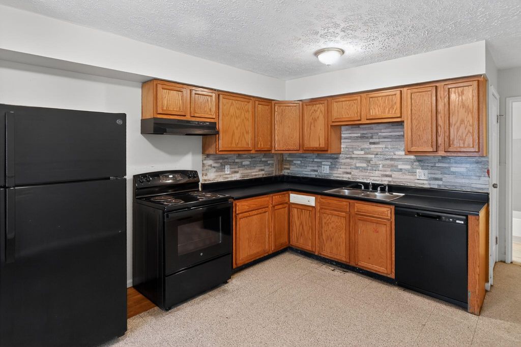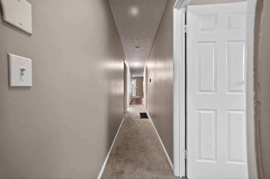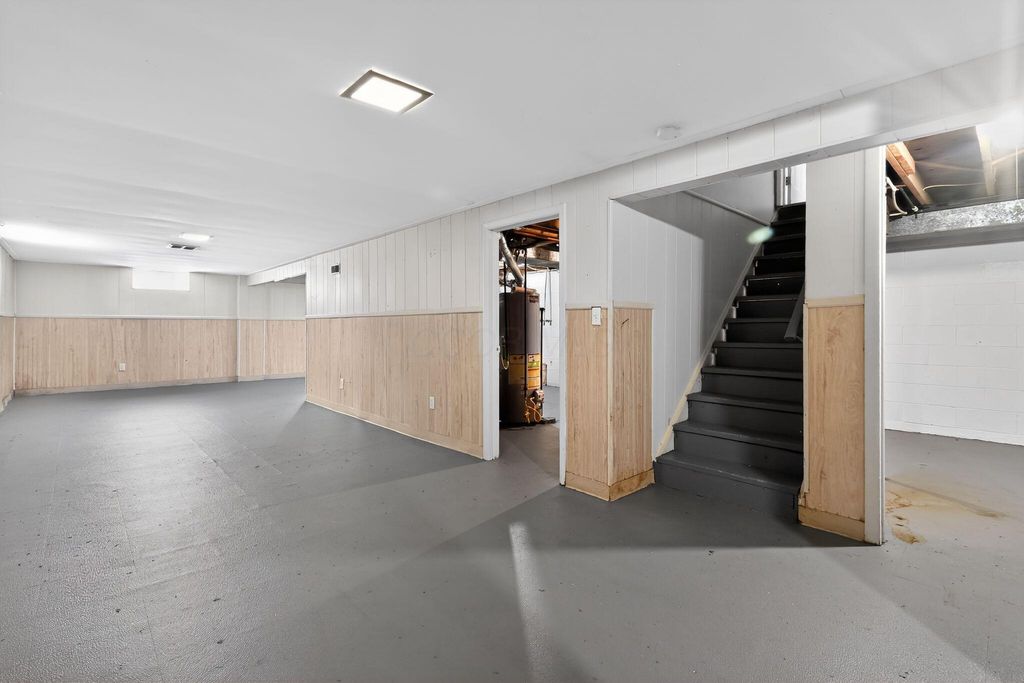 This charming single-story home features a fresh, neutral interior with updated flooring throughout, including wood-style flooring in the main living areas and plush carpeting in the bedrooms. The spacious living room offers ample natural light, while the eat-in kitchen is equipped with black appliances, wood cabinetry, and tile flooring. Each bedroom includes generous closet space, and the full bathroom features a tiled shower and modern vanity. A large, partially finished basement adds flexible space for storage or recreation. Outside, the home sits on a deep, fenced lot with a spacious backyard and detached shed. With fresh paint, move-in-ready condition, and a practical layout, this home is ideal for comfortable everyday living.