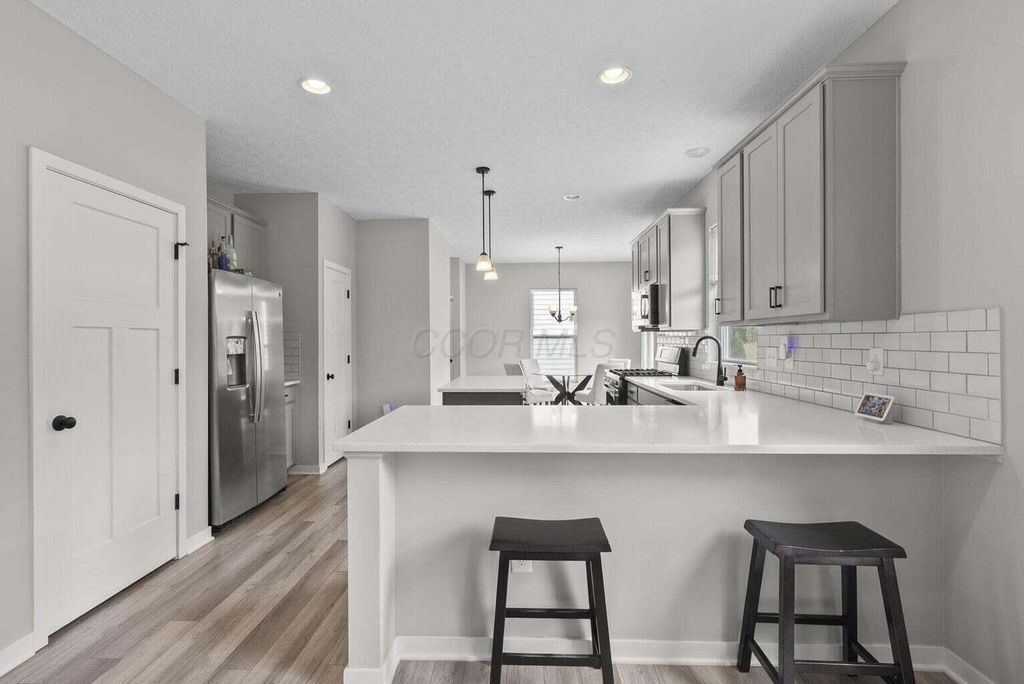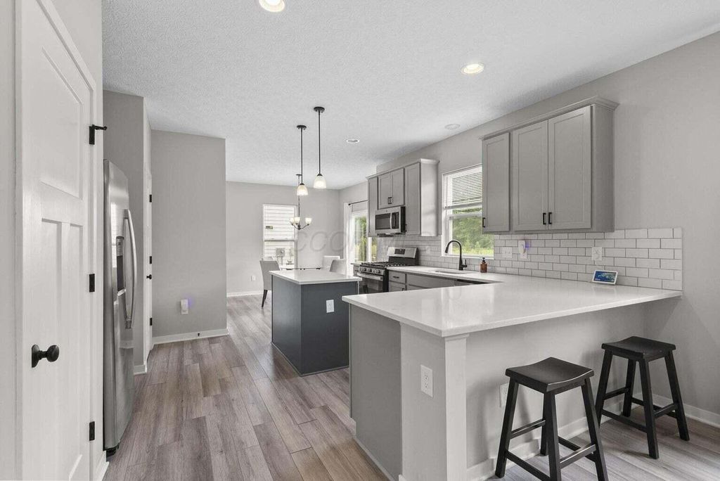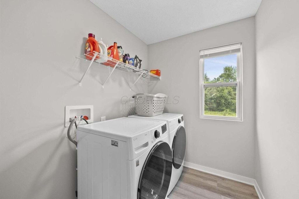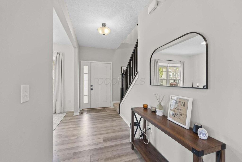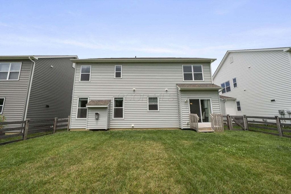 Welcome to this beautifully upgraded 3-bedroom, 2.5-bath home in the highly sought-after Farms at Jefferson community! With 2,087 sq ft of thoughtfully designed living space, this home blends modern style with everyday comfort. Step inside to an open floor plan bathed in natural light, featuring soaring ceilings, designer trim, and stylish lighting and fixtures throughout. The chef's kitchen is a showstopper, boasting quartz countertops, stainless steel appliances, and a spacious center island perfect for holiday gatherings or entertaining friends and family. Upstairs, the versatile loft provides an ideal flex space for a home office, media room, or playroom. All bedrooms are conveniently located on the second floor, along with a 2nd full bath and the washer and dryer"”making laundry easy and keeping everyday living efficient. Relax on the charming front porch or enjoy the private fenced backyard, which backs to a peaceful wooded lot"”offering both beauty and privacy. The custom fence, designed with mesh screening for smaller pets, was a significant $5,000+ investment, saving future owners the cost of installation. Additional highlights include a full basement with poured-wall construction and a full bath rough-in, a garage with an extra bump for storage or bikes, and transferable builder/manufacturer warranties. Residents enjoy exceptional community amenities including scenic parks, walking trails, a clubhouse, and convenient underpass access"”perfect for walkers, joggers, or kids visiting friends in the North section. This neighborhood has sold out, and homes backing to woods are rare. With high-end upgrades, thoughtful features, and a prime location in the Gahanna School District, this home offers both style and function. Don't miss your chance to own this one-of-a-kind property"”schedule a showing today