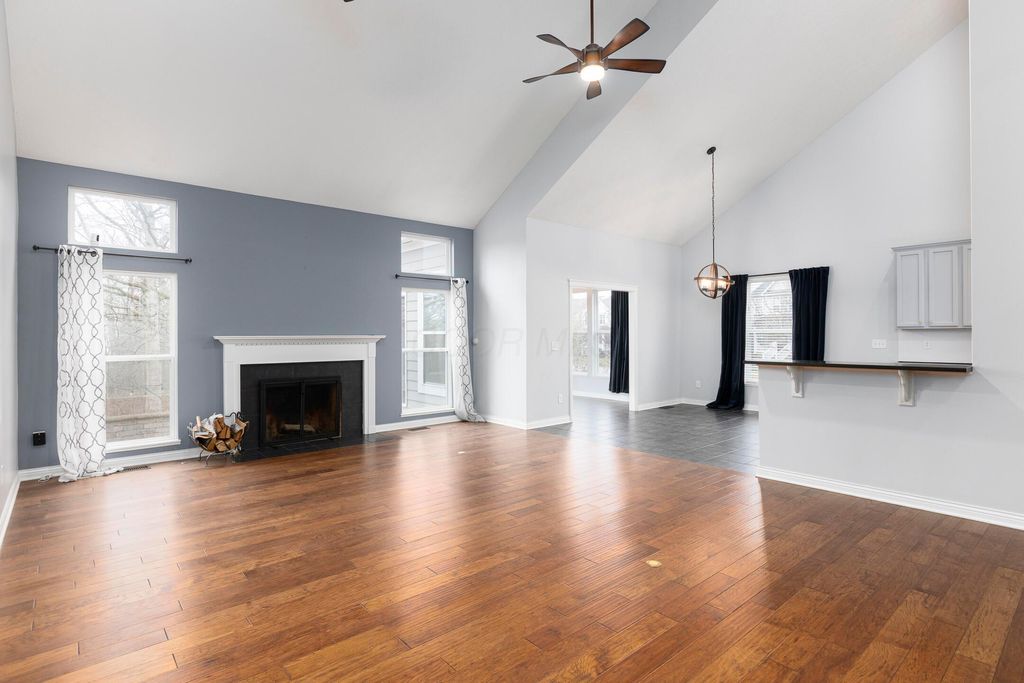 Set on a corner lot in The Lakes of Worthington, this 4 bedroom, 2.5 bath home offers 3,368 square feet of light filled living space and backs to a private nature preserve. The foyer is flanked by a private office and formal dining room, leading into a spacious kitchen with granite countertops, island, stainless steel appliances, abundant cabinetry, and a generous eat in space. A 4 season room off the kitchen creates a peaceful extension of the main living area. The living room features soaring ceilings and a cozy wood burning fireplace, ideal for everyday living or entertaining. The first floor primary suite includes wood floors, a walk in closet, and a large bath with soaking tub, shower, and dual vanity. A half bath and laundry complete the main level. Upstairs, a large bonus room provides flexible space for a rec or media area, along with three additional bedrooms and a full bath, including one with a walk in closet. The unfinished basement offers ample storage and future potential. Outdoor living shines with a covered front porch with swing and a backyard patio backing to parkland. A two car garage and peaceful setting complete this exceptional home. Updates include New Roof (2024), New HVAC (2024), New bathroom flooring (2024), and invisible fence.