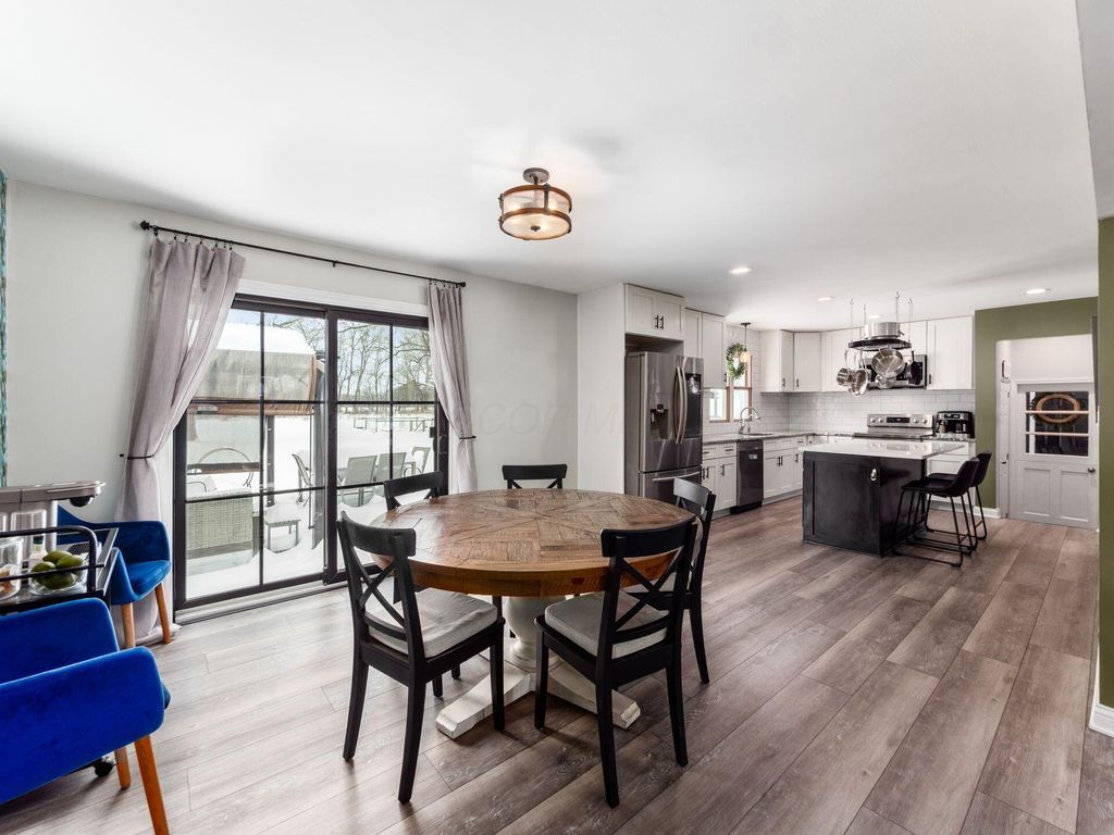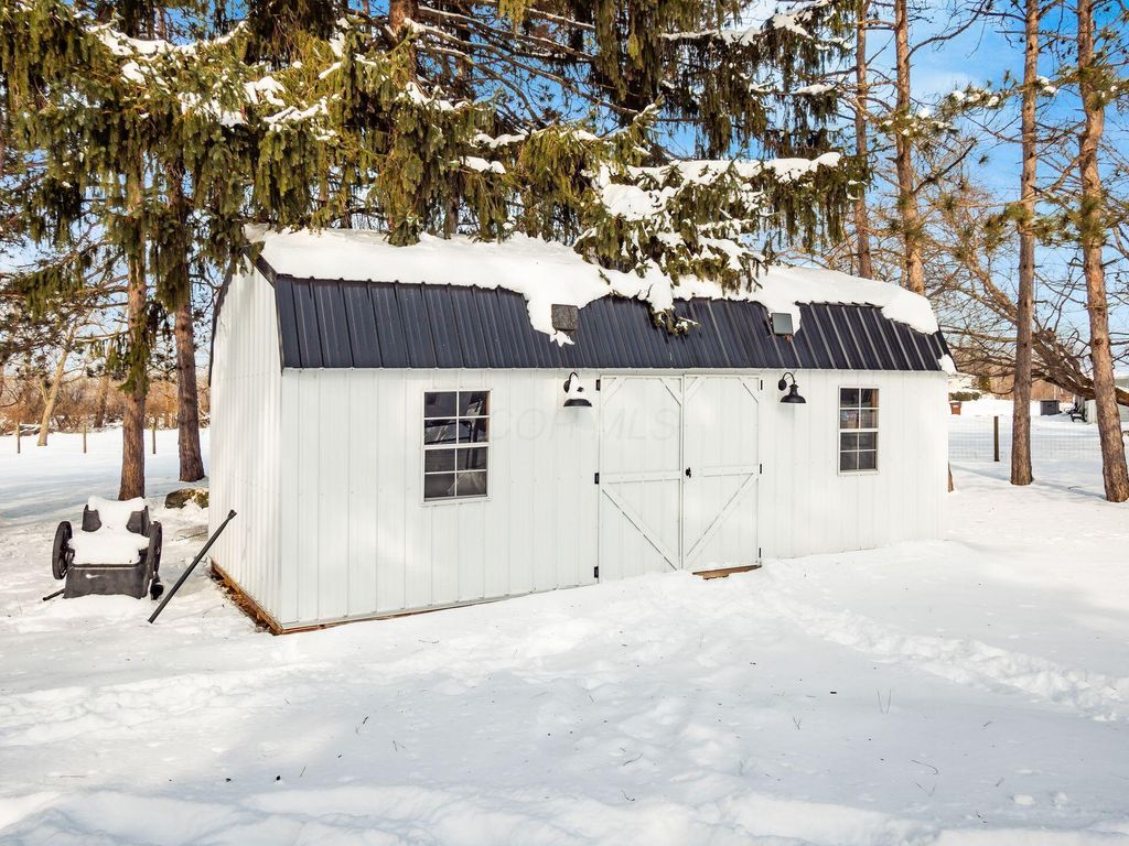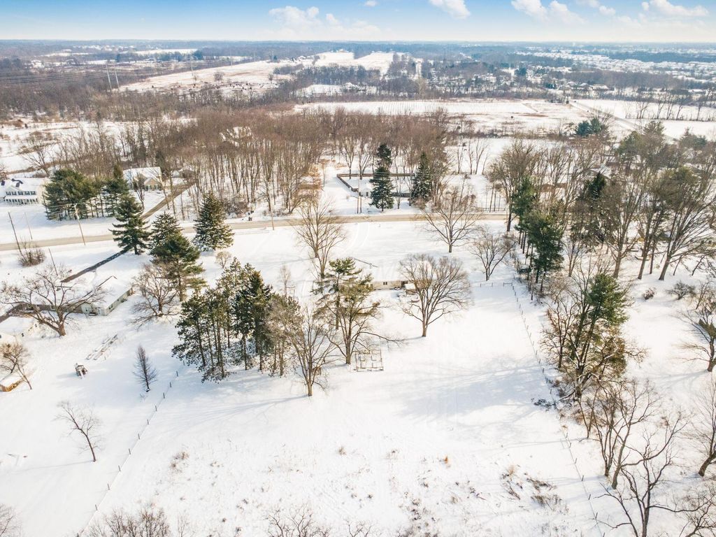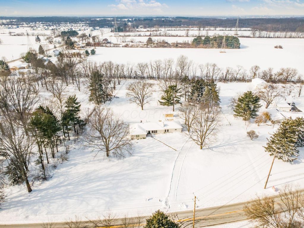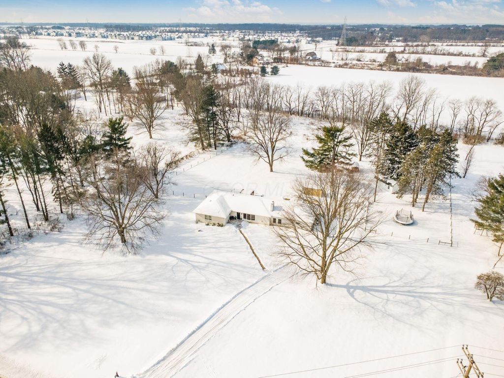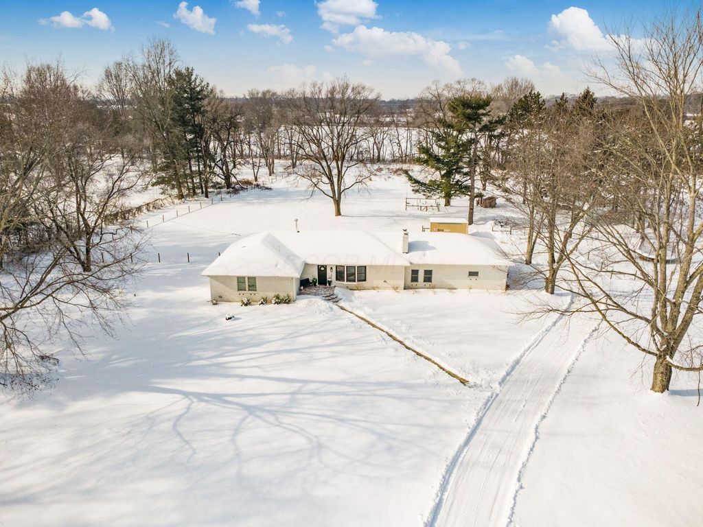 Move-in ready, updated ranch on 3.25 scenic acres in the New Albany School District with Columbus taxes. This open-concept home features a neutral palette, newer windows, and abundant natural light. The updated kitchen offers granite countertops, newer matching stainless steel appliances, and a large center island with quartz countertop, ideal for entertaining. The main level includes 4 bedrooms and 2 full bathrooms, including a spacious primary suite with walk-in closet and private bath. A finished basement provides additional living space plus a third full bathroom, perfect for a rec room, office, or guest area. Recent updates include new flooring and new hot water heater. Enjoy outdoor living with a poured concrete patio, fenced backyard, garden, chicken coop, and new large shedâ€''ideal for starting your homesteading journey. The property is surrounded by mature trees, backs to Parks District land, and offers room for future outbuilding or expansion. Includes a 1.5-car attached garage. A rare blend of privacy, acreage, and convenience.