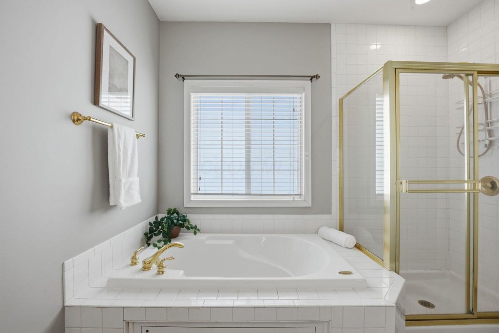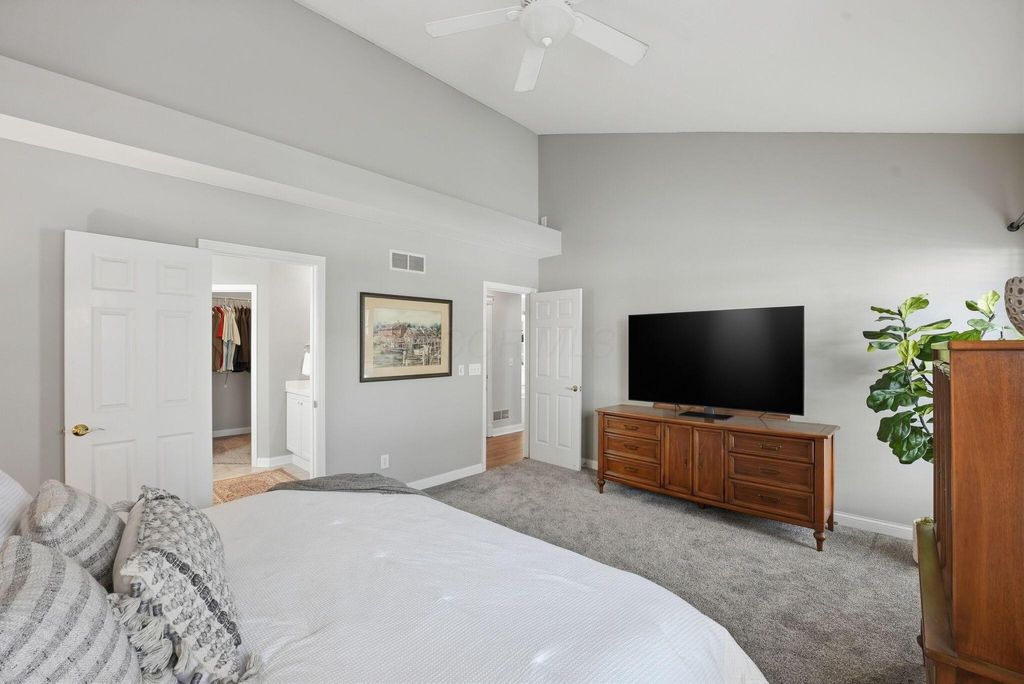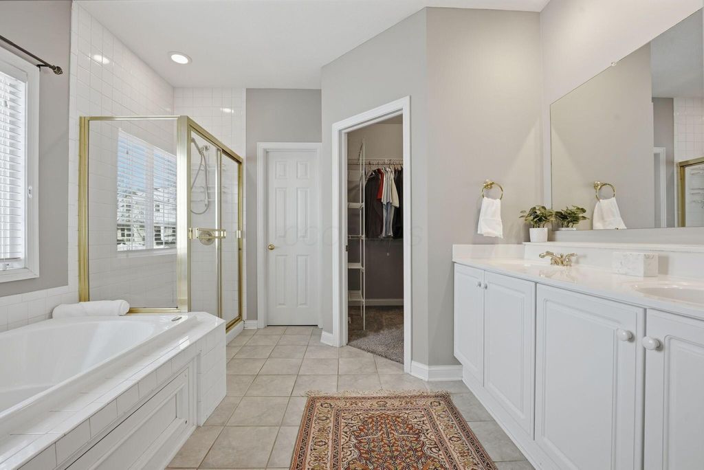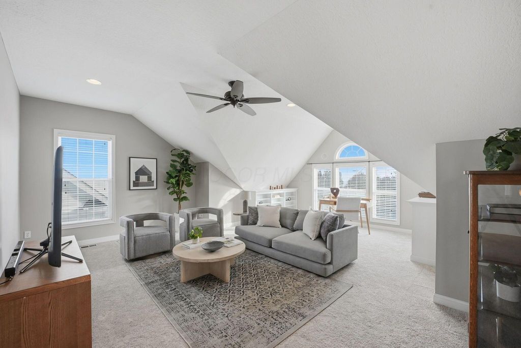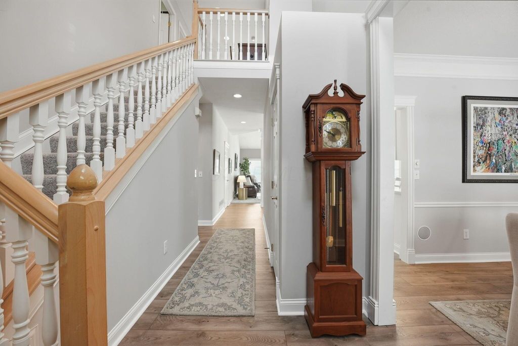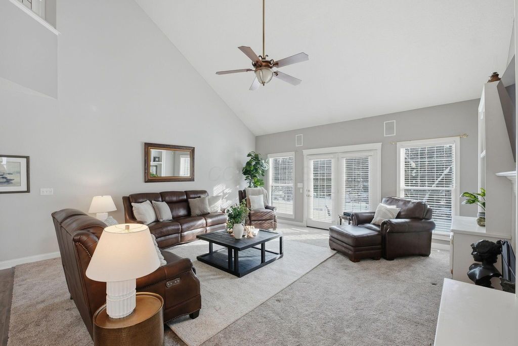 Charming Hampsted Green. Built in 1997 by M/I Homes, this meticulously maintained 3-bedroom, 2.5-bath home offers 3,000 square feet of total living space on a .13-acre lot. Step inside to discover an abundance of natural light throughout the open floor plan. The heart of the home features a spacious Great Room with soaring vaulted ceilings, a gas log fireplace, and custom built-ins that seamlessly flows into the updated kitchen and casual dining area. The kitchen is a chef's dream with 42'' cabinetry, corian countertops, a stylish tile backsplash, stainless steel appliances, and a center island with seating"”perfect for entertaining and everyday family living. The main level offers convenient one-floor living with a first-floor Owner's Suite complete with a spa-like bathroom and generous walk-in closet. Additional first-floor features include a formal dining room - ideal for office space, LVP flooring, and a dedicated laundry room. Upstairs, you'll find two additional bedrooms, a full bath with newer carpet, and a versatile bonus room above the garage that can serve as a 4th bedroom or flex space. The full basement provides endless possibilities with a recreation room, plumbing roughed-in for a full bath, and abundant storage. Outside, relax on the paver patio surrounded by newly planted Arborvitae trees for added privacy. This home combines modern updates with timeless appeal and is ideally located to New Albany Schools, Market Street, Taylor Farm Park, restaurants, and other local amenities.