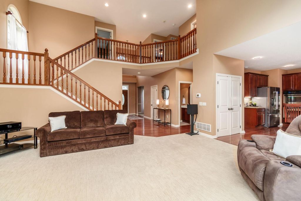 A beautifully maintained five-bedroom, two-story home set on a picturesque premium lot surrounded by mature trees. Enjoy stunning, year-round backyard views from the expansive deck and patio great for relaxing or entertaining. The home backs to community green space and sits adjacent to Alum Creek Parkland, offering privacy and a serene natural setting. The first-floor primary suite features an updated bath and a spacious walk-in closet with a custom organizer. A large great room flows seamlessly into the open, well-appointed kitchen, creating an inviting gathering space. At the front of the home, an office and formal dining room provide an ideal setting for hosting special dinners. The level offers four generously sized bedrooms. The largest bedroom includes a full bath and can easily serve as a flex space such as a guest suite, entertainment room, exercise area, playroom, or additional office. The remaining three bedrooms are also spacious and feature California Closets organizers. If desired by the buyer, several items may remain with the home at no cost, including the great room big-screen TV and sound system (originally a $15,000 installation), washer and dryer, select furniture, and most of the high-quality patio furnishings. The furnace and air conditioning system have also been replaced within the past few years. This home offers comfort, quality, and a rare premium lot with beautiful views. Located in the Harbor Pointe community with a beautiful entry pond and walking trail! It's just a few minutes to Alum Creek, freeways and shopping! Homes with beautiful lots backing to green space don't come along often will go into contract quickly!