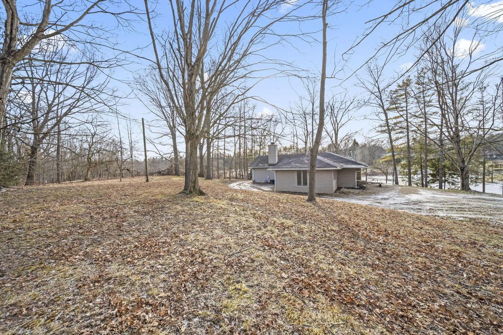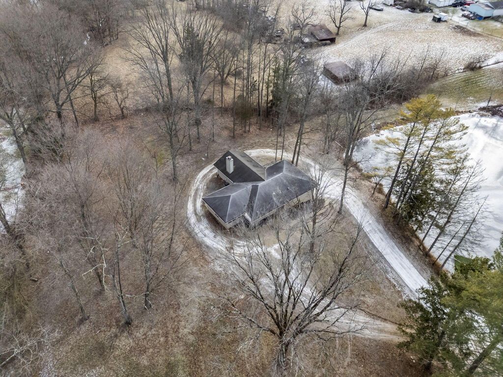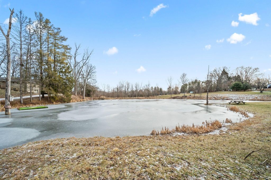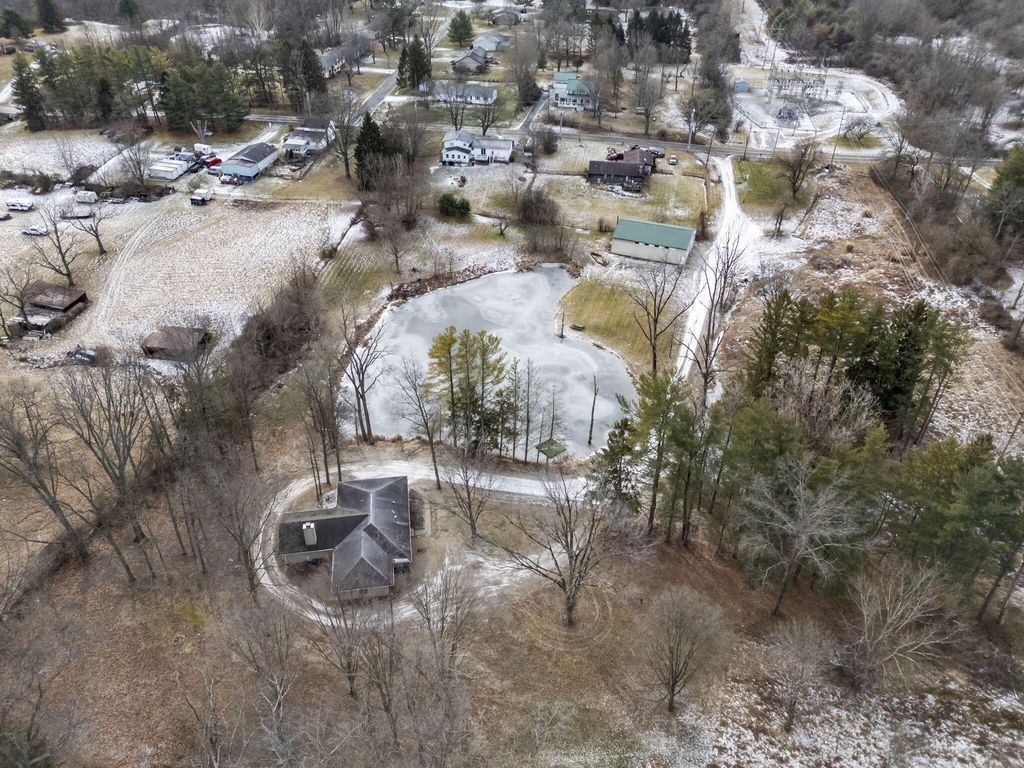Rare opportunity in Granville Schools on nearly 7 acres (6.86) offering a peaceful, private setting with a stocked pond, wooded surroundings, a greenhouse, and a 40x60 outbuilding. The hillside ranch features an open floor plan with main-floor living and a walk-out lower level. Spacious great room with impressive stone fireplace, skylights and built-in shelving. The space has a warm, cabin or lodge-like feel with excellent natural light. The home offers 3-4 bedrooms, with the fourth bedroom ideal as a flex space or home office, and 2½ baths on the main level. The walkout lower level is plumbed for an additional half bath and provides space for a future rec room. Additional features include an on-demand gas water heater. Exceptional outdoor living with a greenhouse accessible from both inside and outside the home, a patio and an expansive pond ideal for fishing or simply enjoying peaceful water views and abundant wildlife. The approximately 40x60x14 outbuilding is insulated and equipped with water and thermostat-controlled gas heat, making it well suited for a hobbyist, mechanic, workshop, or boat and camper storage. This property needs work and is priced accordingly and has already been appraised. This is a great alternative to building new: avoid major land improvement costs, renovate on your timeline, and be settled before the next school year at the end of summer. An opportunity to restore, reimagine, and make it your own.