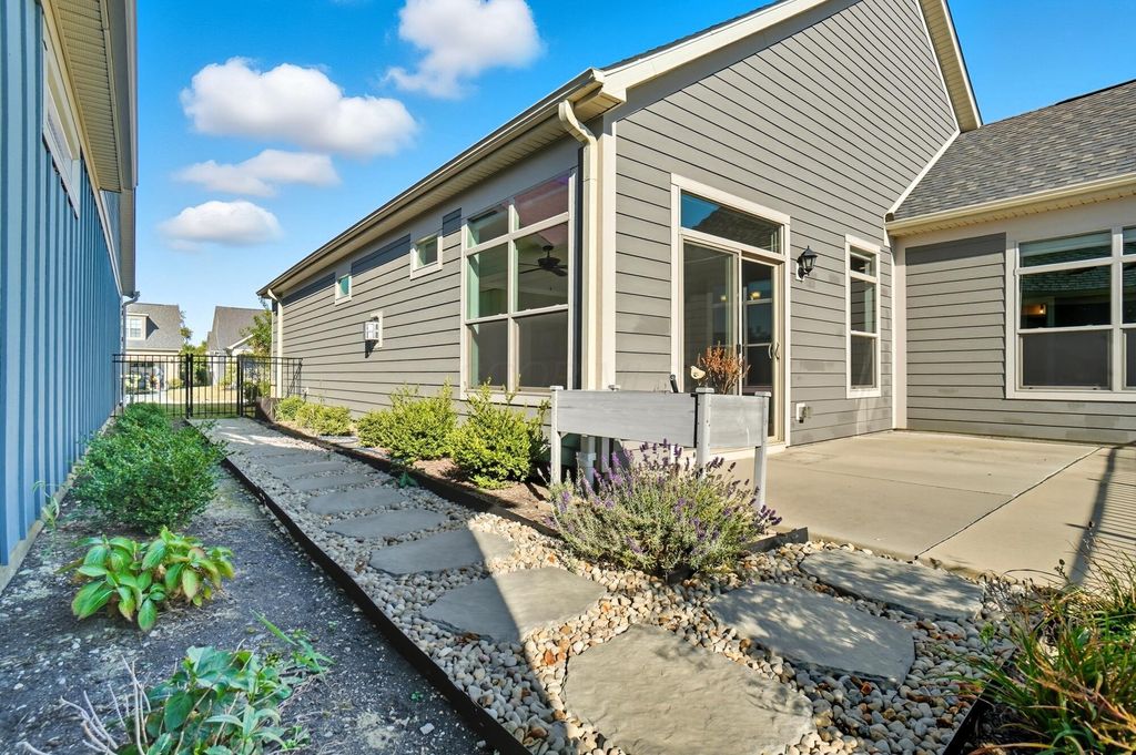Shows like a model! One of the best locations in the neighborhood! Green space and clubhouse views from your private fenced in patio area! Patio has been doubled in size! Stone walk way down the side of the home to the front yard! This is a total open floorplan! Just move in and start enjoying everything this home has to offer! Expanded great room w/gas fireplace and expanded dining area w/slider overlooking your outdoor living space! Chef's kitchen with island overlooking all of your living space! Upgrades throughout! Freshly painted! Primary bedroom suite located off the back of the home with views! Huge walk in closet! Zero entry custom shower! Custom blinds! 2nd bedroom located in the front of the home! Full bathroom with tub/shower! No yard to cut or snow to shovel! Enjoy everything the clubhouse has to offer from kitchen, fireplace, work out facilities and outdoor features like pool and a paddleball court! I almost forgot their is additional storage in the garage with pull down steps to store all of your extras. This is one of the best bargains in the area!