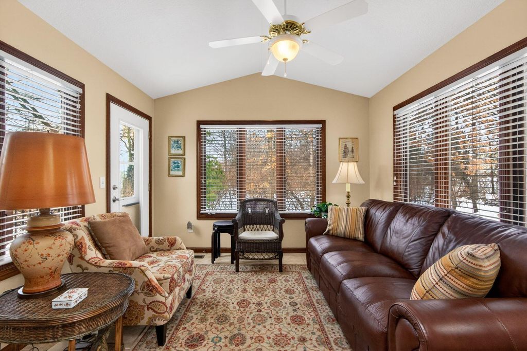 Beautiful Canini custom built end unit backing to mature trees for a peaceful and private setting. The vaulted kitchen is well equipped with a center island, eat in space, and 42'' cherry cabinetry. Vaulted great room features skylights and a gas log fireplace, creating a bright and inviting atmosphere. Enjoy the light filled four-season room and formal dining area. Convenient first floor utility. Spacious vaulted primary suite includes double vanity, whirlpool tub, separate shower, and walk in closet with shoe rack. Full finished basement with full bath offering an additional gathering area with lots of storage. Recently updated Trex Deck with privacy wall provides an ideal outdoor retreat. Fantastic Location. Please note the basement is virtually staged.