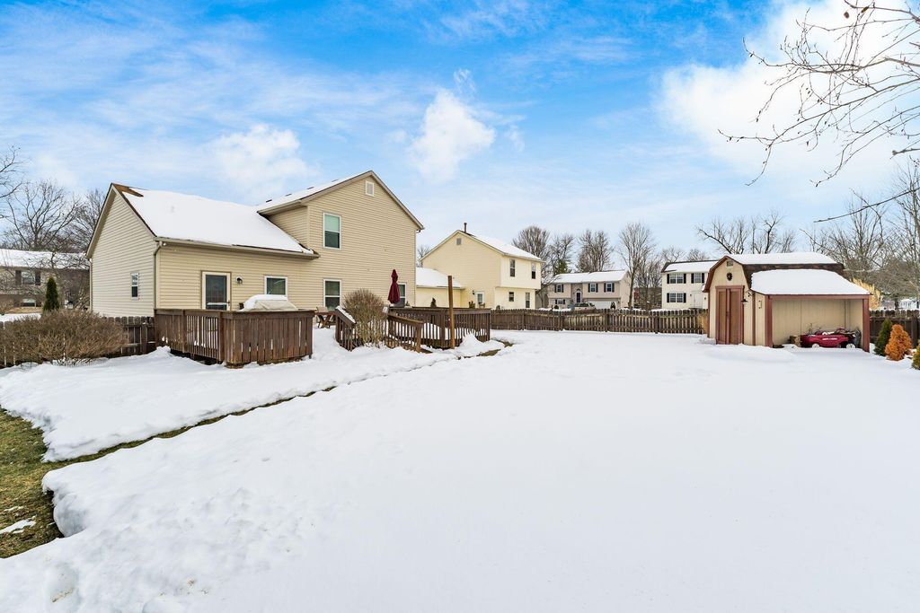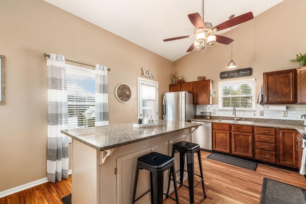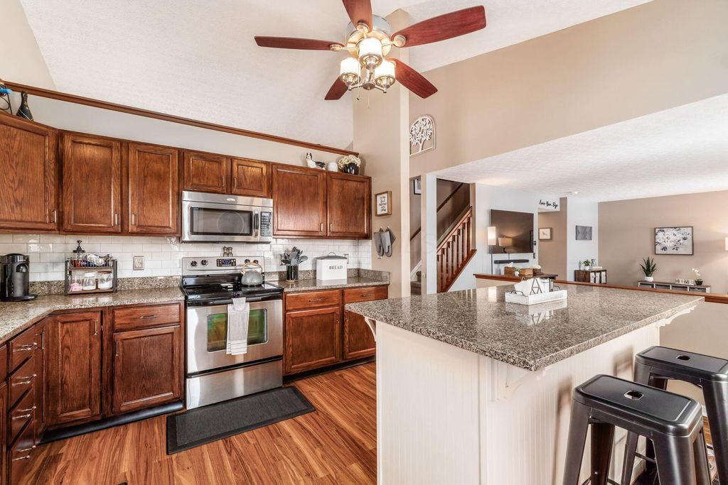 Welcome home to this open and inviting floor plan, where soaring cathedral ceilings create a bright, airy atmosphere the moment you step inside. The main level features an open kitchen with granite countertops, oak cabinetry, and a large island, plus a half bath and two living areas - perfect for both daily life and hosting guests. Downstairs, the partially finished lower level provides additional living space - great for a home office, gym, or media room. Enjoy the best of the outdoors in your fenced backyard, complete with a deck, storage shed, fire pit, and updated landscaping. Backing directly to the park, this home offers rare, private access to walking trails, playgrounds, a fishing pond, and wooded creek paths. Situated on a quiet cul-de-sac in a friendly neighborhood, you'll enjoy ''VIP access'' to park events, including the Fourth of July fireworks, viewable from the comfort of your backyard. This home is truly move-in ready with extensive recent updates, including a new furnace and insulated windows (2025), a custom walk-in shower in the primary suite (2026), refreshed bathrooms (2024), and an insulated garage door (2024). Offering a unique blend of comfort, convenience, and a one-of-a-kind setting"”come see this lovely home today!