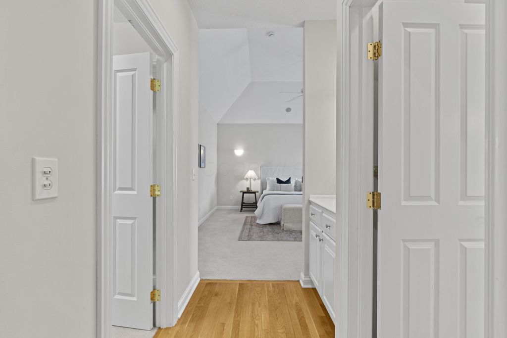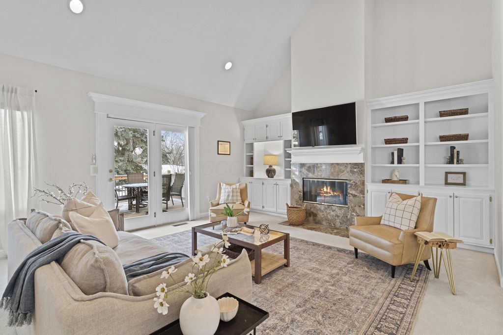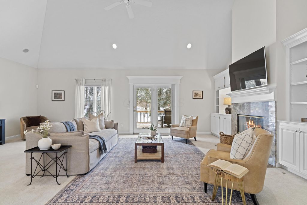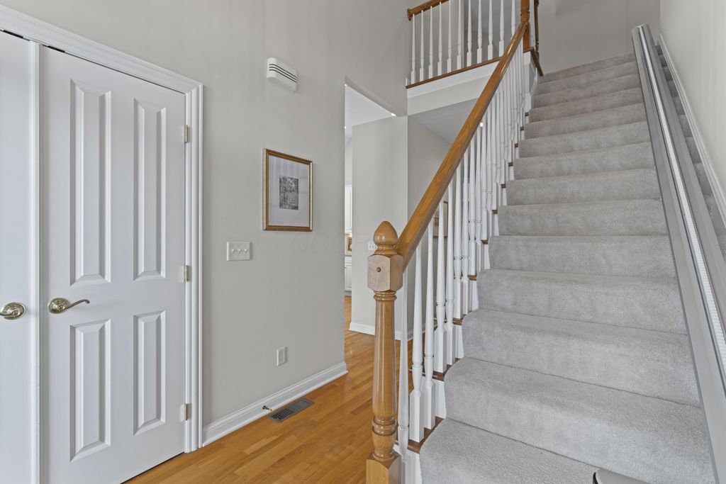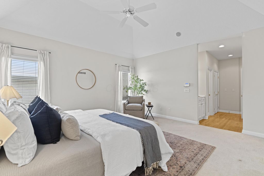 Welcome home to this beautifully built Romanelli & Hughes stunner, perfectly positioned within walking distance to trails, shops, restaurants and just minutes from Downtown Columbus! From the moment you step inside, hardwood floors flow through the entry and into the kitchen, setting the tone for timeless style and easy living. The kitchen shines with vaulted ceilings, white cabinetry, solid countertops, a stylish backsplash, a pantry, and even a cozy breakfast nook, perfect for morning coffee. The dining room opens seamlessly to the spacious living room featuring a fireplace with custom built-ins and French doors leading to a private deck made for relaxing or entertaining. Down the hall, you'll love the oversized laundry room with cabinetry and utility sink, plus a convenient half bath. The primary suite is truly impressive, HUGE in size with vaulted ceilings, a walk-in closet, built-in vanity space, and a spa-like ensuite offering a soaking tub, walk-in shower, and double vanities. Upstairs, two generously sized bedrooms each offer walk-in closets and share a Jack-and-Jill bath. Need storage or future living space? The massive full basement is ready for your personal touch, or leave it as-is and enjoy what might be one of the largest storage spaces in Columbus (seriously!). A chair lift provides added convenience to the second floor and can be easily removed if desired. Plus, the HOA covers mowing, making this low-maintenance lifestyle even sweeter. Location, space, and quality. This one checks all the boxes!