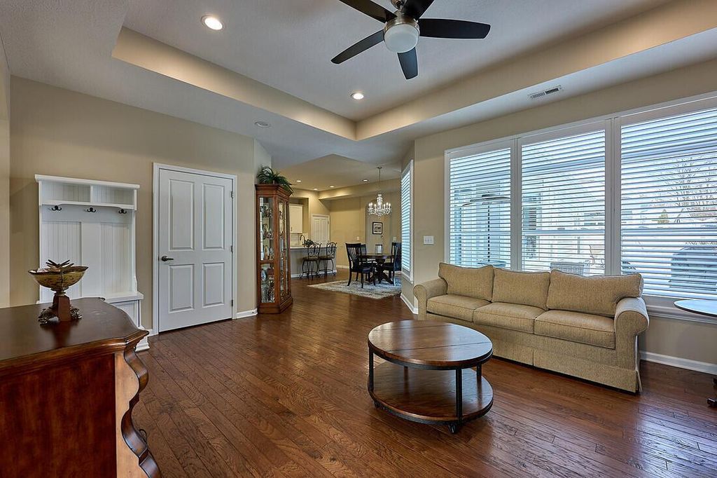 One of the best condo communities in 43054. Very nice and clean freestanding ranch home, great room with wood floors open to updated kitchen and den. End unit overlooking trees and pond. 3 min drive to Market Square in the New Albany Village Center. Close stroll to restaurants, shopping and conveniences. Great fenced back yard with patio. Updated main bathroom has beautiful shower with full roll in or walk in entry with no obstructions. Full second BR and BA. Custom shutters and washer/dryer stay with the home. E-Z to see.