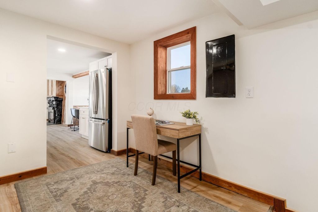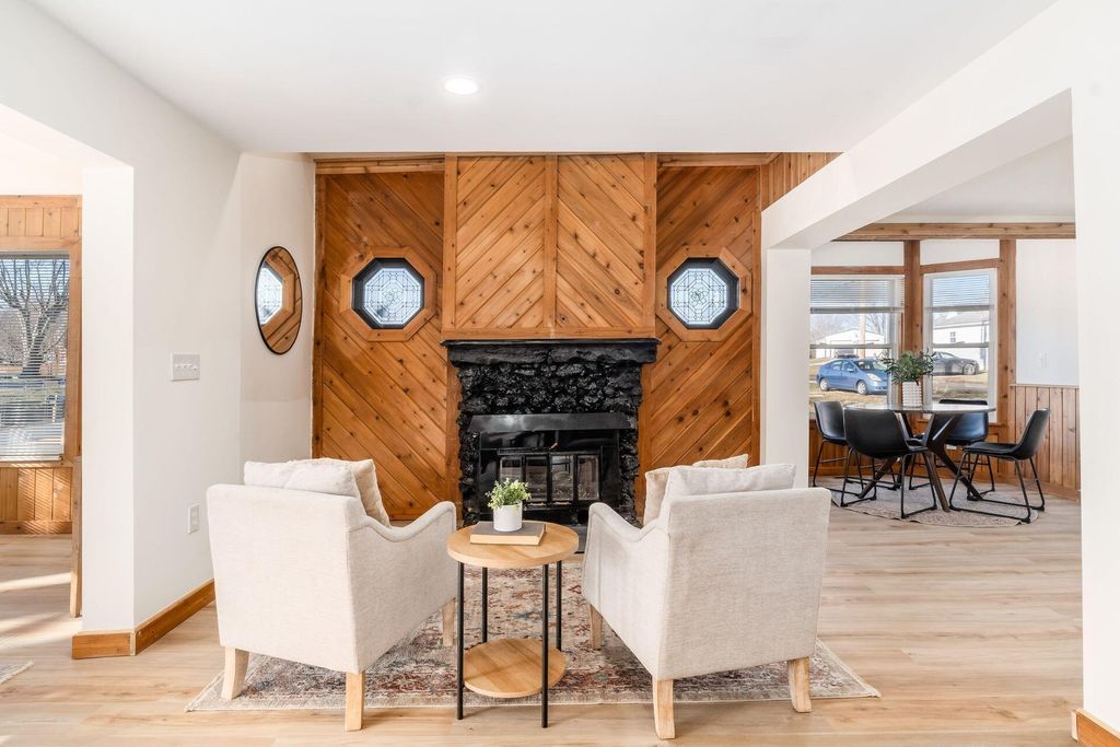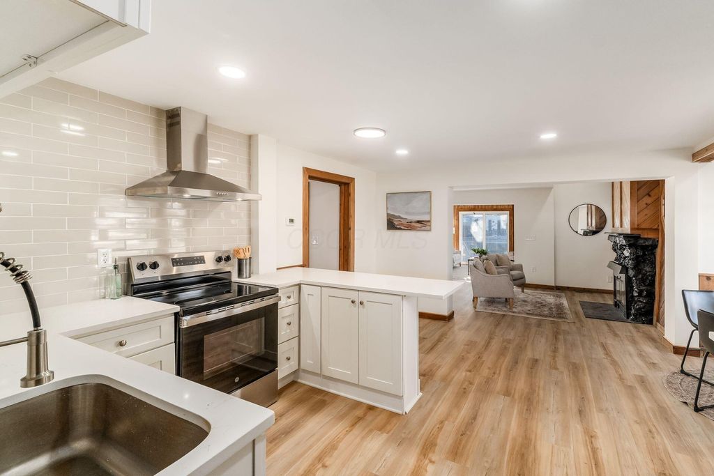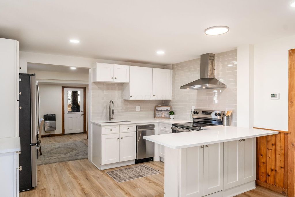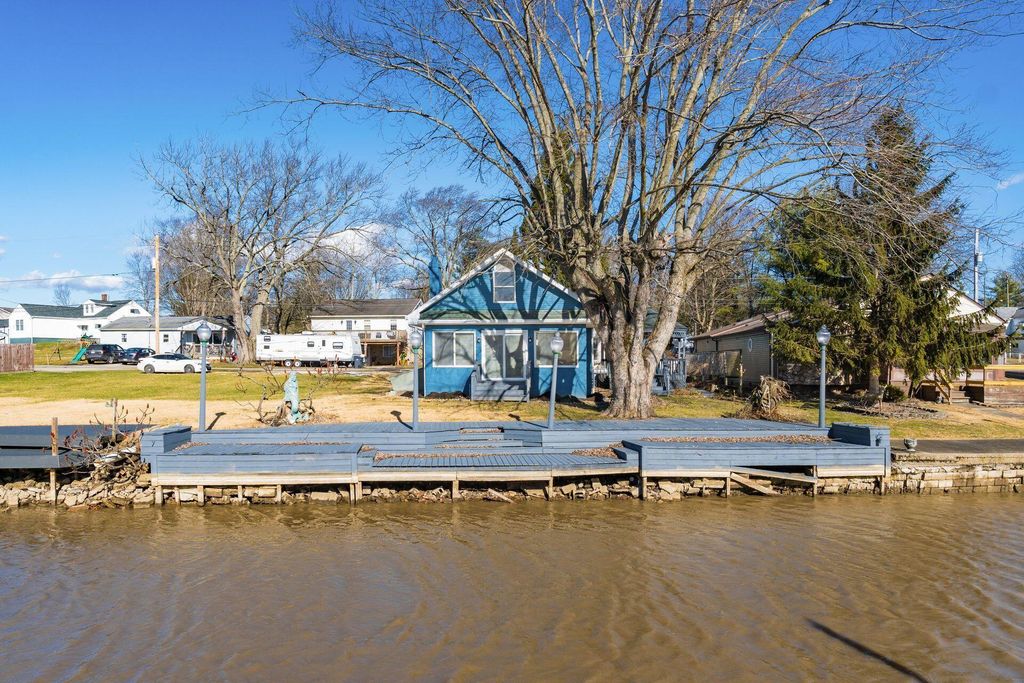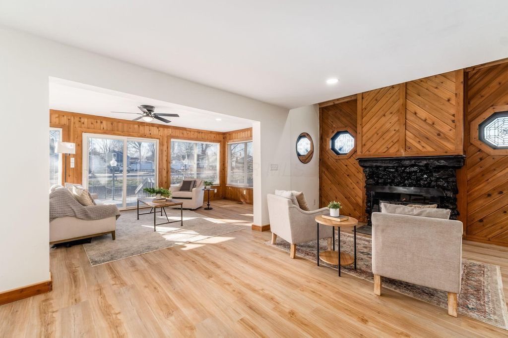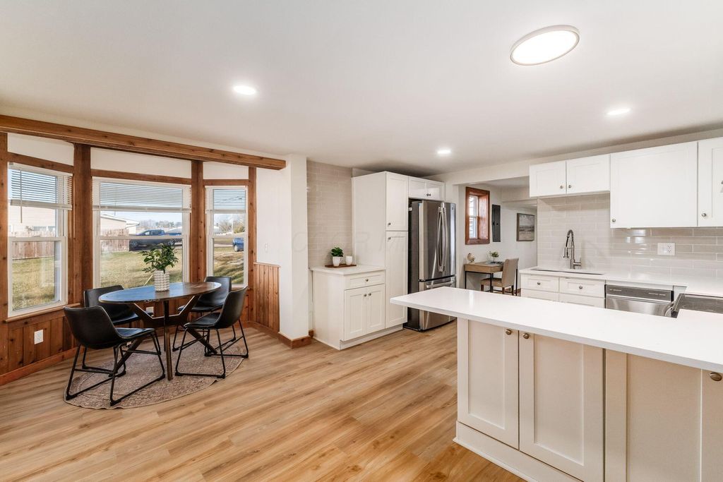 Welcome to this beautifully updated canal-front Cape Cod in Millersport offering 3 bedrooms and 2 fully remodeled baths, blending modern finishes with warm character throughout. The renovated kitchen features quartz countertops, stainless steel appliances, subway tile backsplash, peninsula seating, and open sightlines into the main living space. The great room is filled with natural light and anchored by a striking stone fireplace and distinctive wood accent walls that add charm you simply can't replicate. A bright four-season room with walls of windows overlooks the canal, providing a peaceful year-round retreat with direct canal access leading to Buckeye Lake. The remodeled bath showcases a sleek double vanity and marble-look surround, while the spacious upper-level flex area offers endless possibilities for a second living space, bunk room, or home office. A detached two-car garage offers excellent storage for vehicles, boats, golf carts, and all your lake gear. Enjoy canal access to Buckeye Lake, nearby dining, and the relaxed charm of lake living.