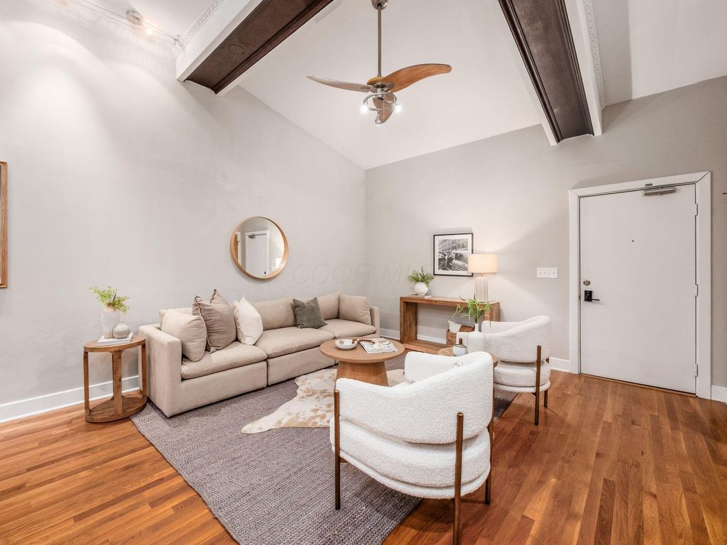 Short North living with garage parking. This character-rich loft blends exposed brick, soaring beamed ceilings, hardwood floors, and expansive south-facing windows that flood the space with natural light. Located in a secure, elevator-served building with gated access and a private garage -- a rare amenity in this district -- the residence offers true lock-and-leave convenience in one of Columbus's most walkable neighborhoods. Enjoy immediate access to dining, galleries, coffee shops, and nightlife just outside your door. A distinctive opportunity for buyers who value architecture, security, and streamlined urban living in the heart of the Short North.