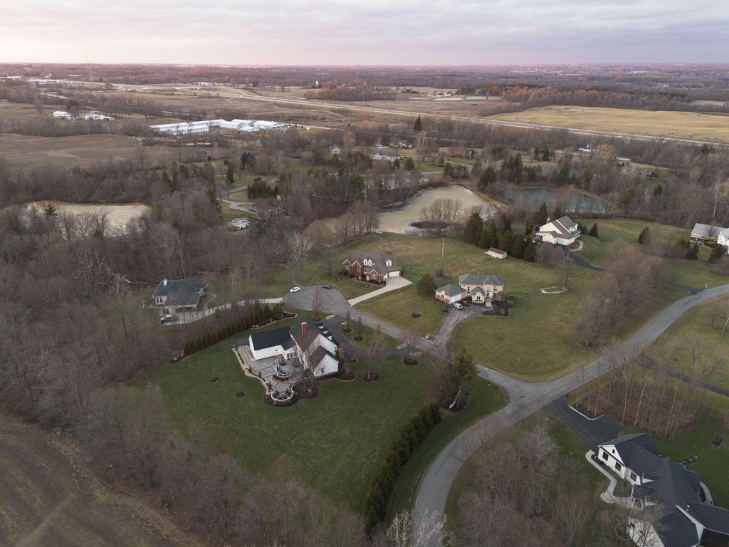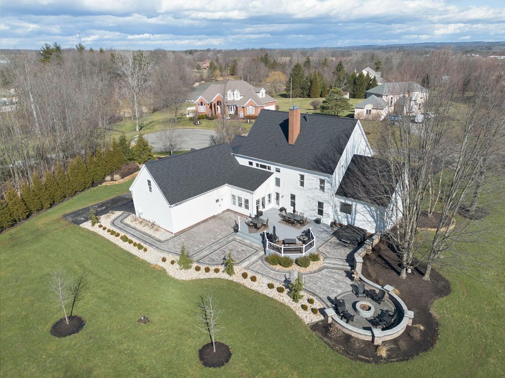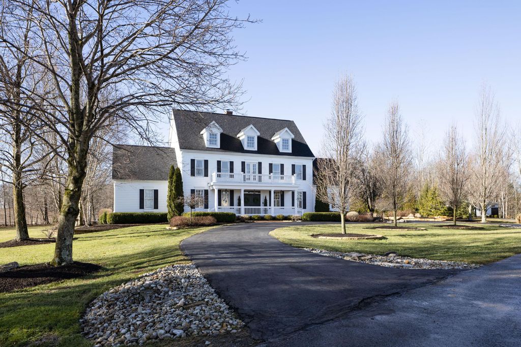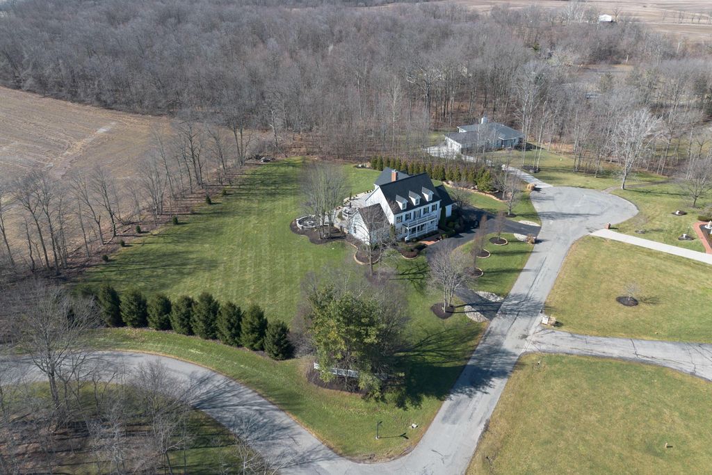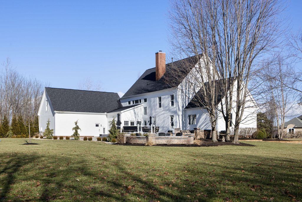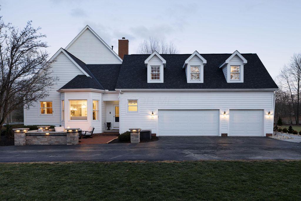 Set on a quiet cul-de-sac on a 1.77 acre private lot, this classic white Colonial offers over 5,000 square feet of thoughtfully designed living space with recent updates throughout. The two-story great room anchors the main level with soaring ceilings, expansive windows, rich hardwood floors, and a brick fireplace flanked by custom built-ins. A lofted overlook above enhances the open architectural feel, while the adjoining four seasons room provides year-round flexibility and natural light. The kitchen features rich wood cabinetry, a large center island, casual dining space, and a distinctive stone fireplace that adds warmth and character. The first-floor primary suite serves as a private retreat, complete with a two-sided fireplace shared with the spa-style bath, dual vanity, walk-in shower, and an oversized walk-in closet. Outdoor living is equally well appointed with a spacious deck, stone patio, and dedicated fire pit area--ideal for entertaining or quiet evenings at home. Located in a a golf cart-friendly community with exclusive access to six private fishing ponds! Conveniently located with easy access to New Albany, Johnstown, and the Columbus metro area. Additional highlights include a 3-car garage, partially finished basement with new carpet (Fall 2025), new roof (2024), new garage doors (Jan 2026), all new interior paint (Jan 2026), and a newly installed patio and refreshed landscaping (2024).
