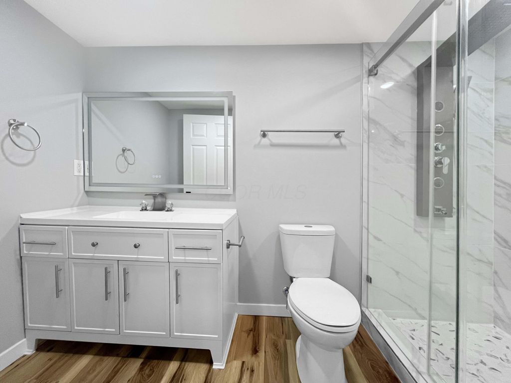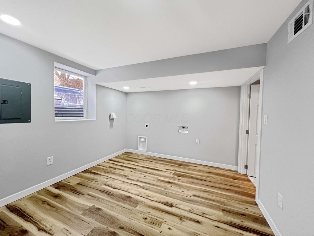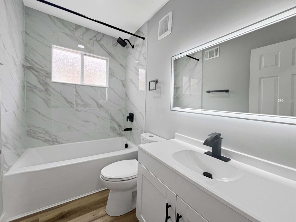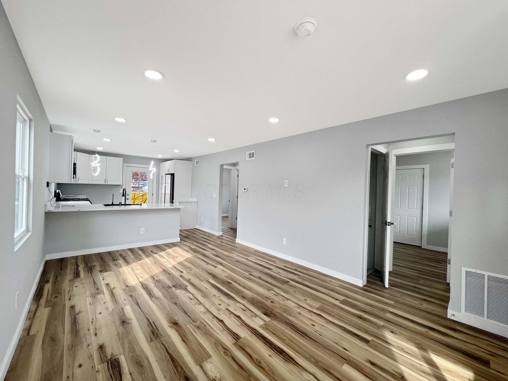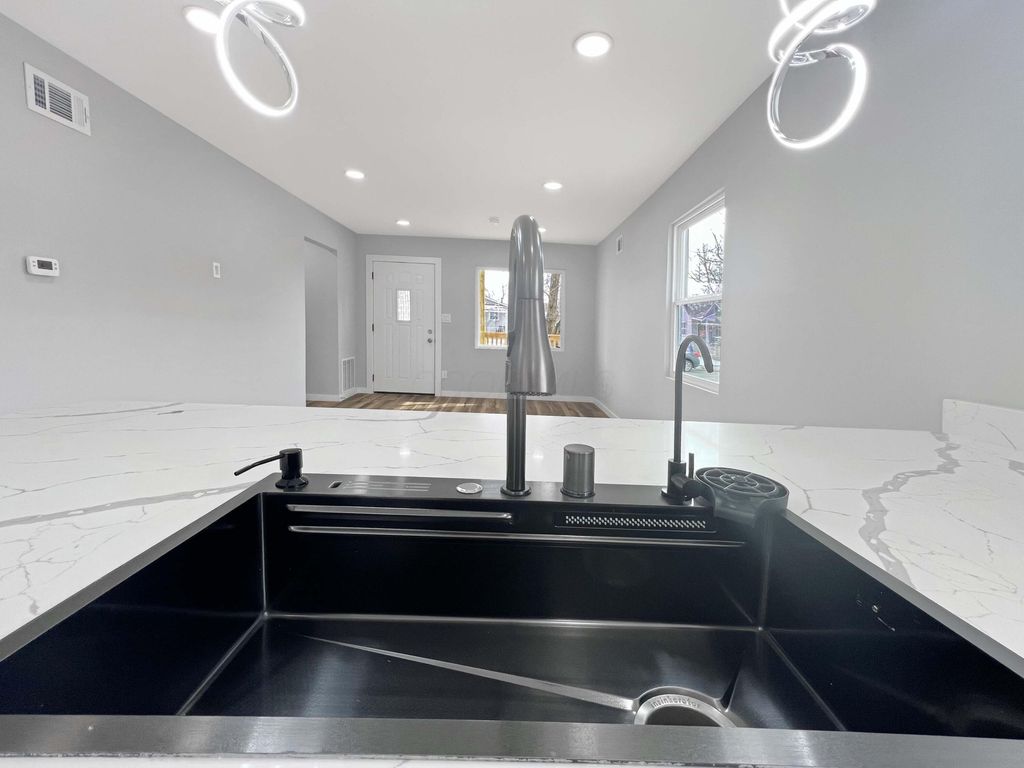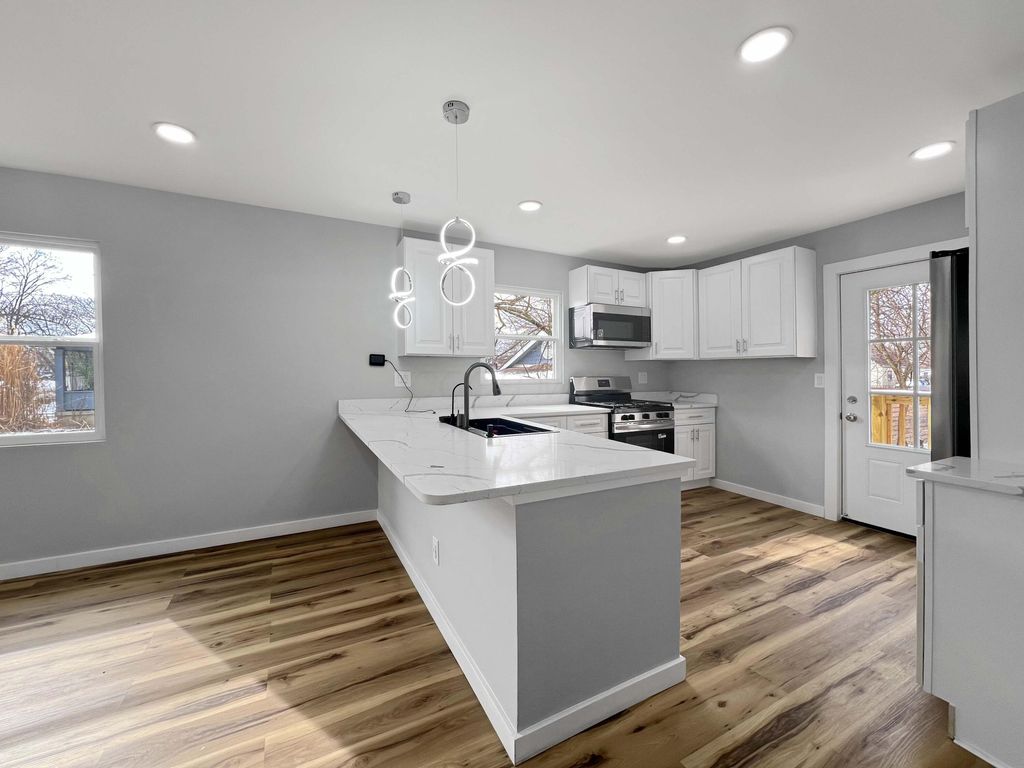 TOTAL renovation (roof, siding, windows, HVAC, gutters, flooring, kitchen, baths, basement, etc....). 3 - 4 bedrooms with 2 full baths, finished basement with egress window. Open floor plan, upgraded kitchen and baths with lots of granite, tile, higher end appliances, etc... Large fenced yard with large sliding gate to park in the rear if desired.