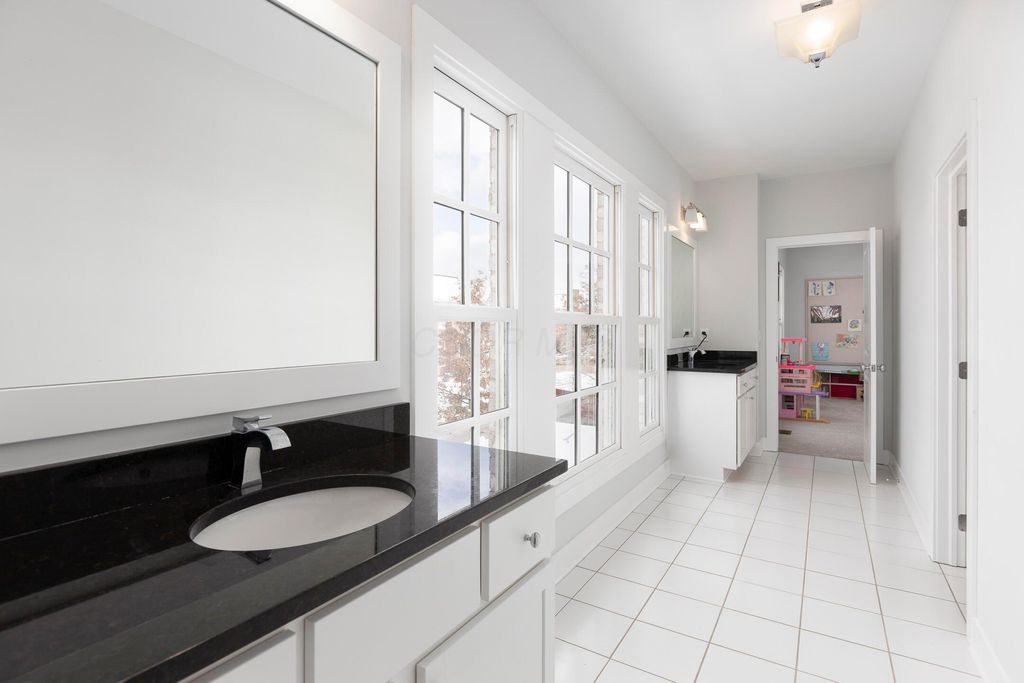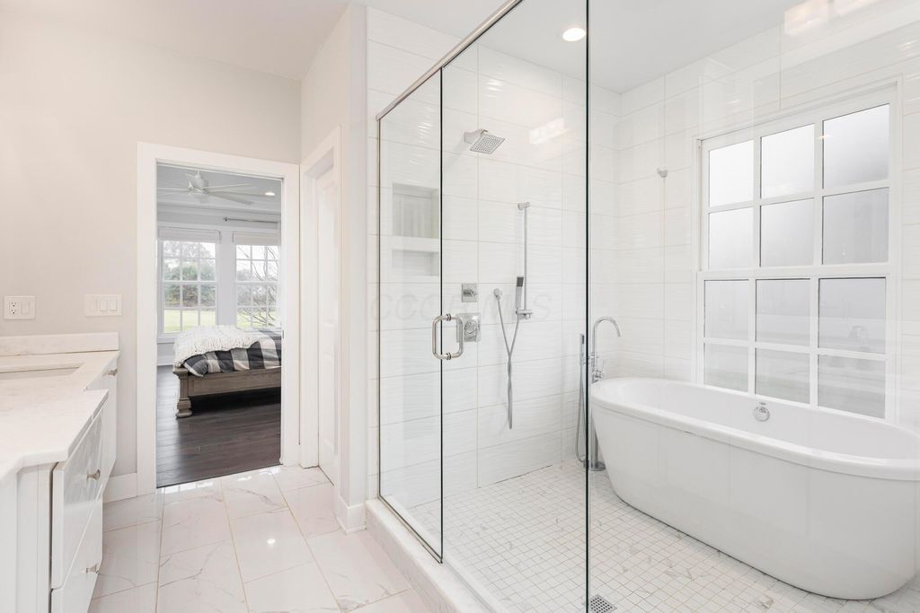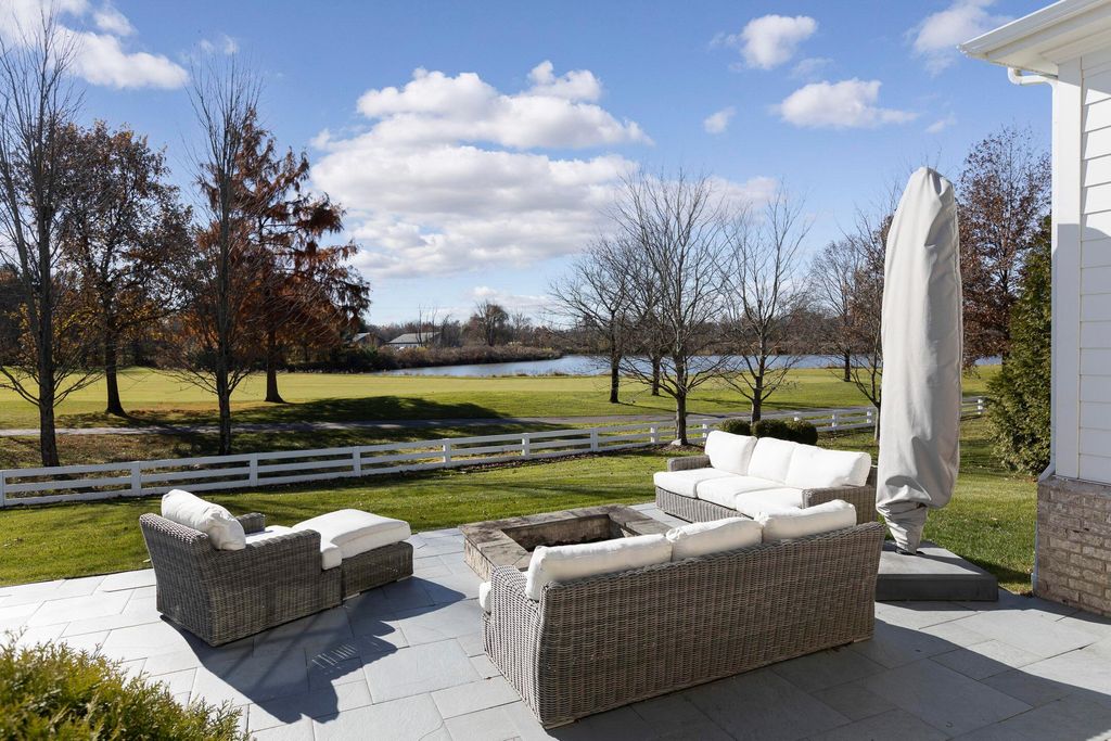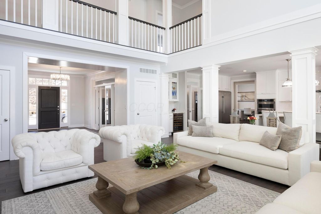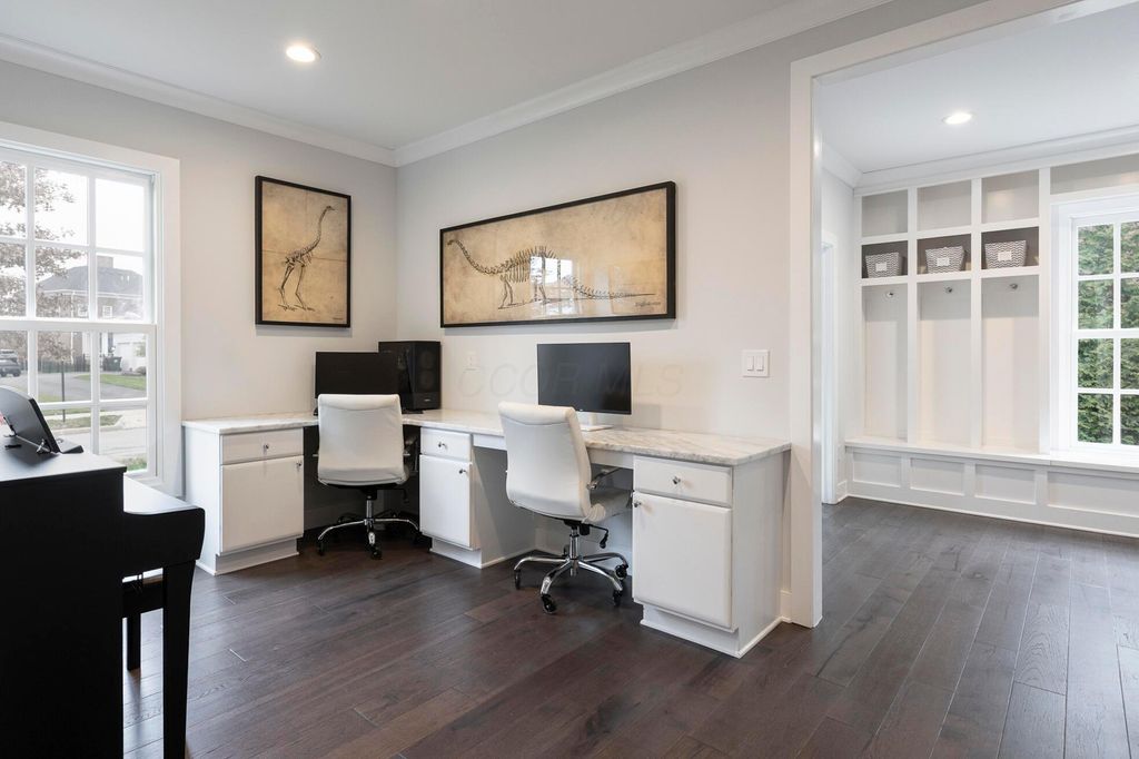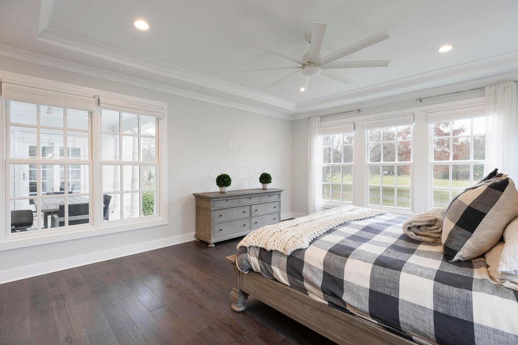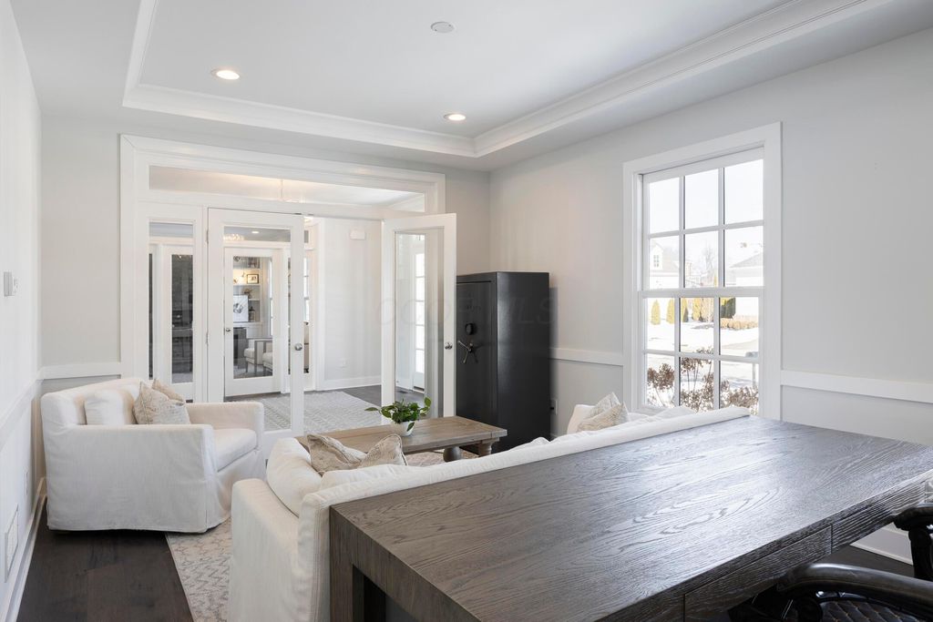 Overlooking the 7th fairway of New Albany Country Club in Ebrington, this 6,558 square foot California inspired home offers six bedrooms and six and a half baths across three levels of finely appointed living space. The foyer opens to two home offices, one with a gas fireplace, leading to a great room with soaring ceilings, a second fireplace, and expansive windows framing sweeping golf course views. Hardwood floors flow throughout the main level. The gourmet kitchen features a custom granite waterfall island with bar seating, two dishwashers, large side-by-side refrigerator, wine fridge, walk-in pantry, dining room, and a flex study area off from the kitchen. The main-level primary suite is a private retreat, featuring a wet room with a freestanding tub and walk-in shower, dual vanity, and a spacious walk-in closet. Mudroom with locker-style cubbies, first-floor laundry, and half bath complete the level. Four bedrooms occupy the second level, two with private baths and two sharing a Jack and Jill. All are appointed with walk-in closets and generously proportioned layouts. The finished lower level offers a large recreation area, kitchenette with refrigerator, sink, and dishwasher, a private sixth-bedroom suite with ensuite bath, and a second full bath. Outdoors, a covered patio, stone terrace, firepit, and expansive backyard create an inviting, private setting ideal for relaxing or entertaining while enjoying panoramic fairway views. A three-car side-load garage completes the home. Updates include conversion of the loft into a fifth bedroom with full bath (2018), finished basement with sixth bedroom and ensuite (2018), kitchen refresh with granite waterfall island (2018), and custom closet systems throughout each bedroom (2018).